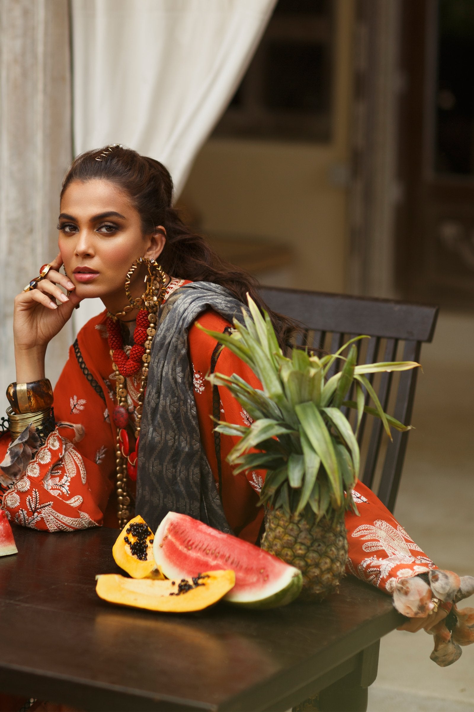 Fabric: An effervescent design with intricate dori stitches illustrating grand floral bouquets reminiscent of Central Asian tapestries. 'Kesi' rendered in a vivid tangerine with striking ivory and ebony silk thread adornment, it's accompanied by our hand woven, two toned dupatta with gold tribal motifs, a completing this bold and exotic look. The shirt features a boxy silhouette with drop shoulder and lace inserts in the side panel, tie and dye detailing and lace on the sleeve hem and origami feather tie and dye detail on the shirt hem. Paired with a pant that has a satin insert with lace detailing on the hem and a dupatta with anchor tassels on all four corners. Dupatta (Jacquard) 2.50 Meters Embroidered Shirt Front (Lawn) 0.67 Meter Dyed Shirt Back (Jacquard ) 01 Meter Embroidered Sleeves (Lawn) 0.65 Meters Screen Printed Trouser (Cotton) 2 Meters Dyed Side Extensions (Lawn) 0.33 Meters Embroidered Back Crew (Satin Silk) 01 Piece |