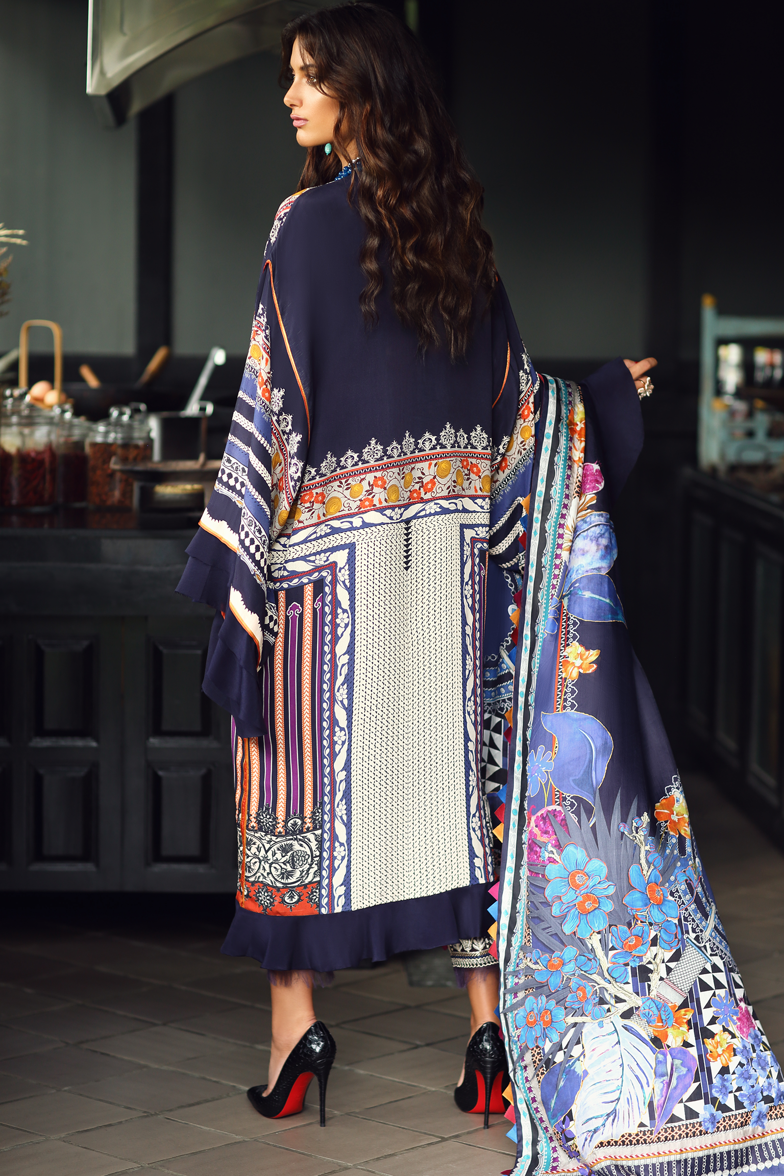 Fabric: Oriental imagery and geometric elements are beautifully rendered on pure silk fabric with additional ornamental embroideries all coming together on a calming palette of deep blue and white with accents of citrus. Digital Printed Dupatta (Pure Medium Silk) 2.50 metersPrinted Shirt Front (Pure Grip Silk) 1.25 meters Printed Shirt Back (Pure Grip Silk) 1.25 meters Printed Sleeves (Pure Grip Silk) 0.65 meters Dyed Trouser (Raw Silk) 2.50 meters Embroidered Neckline (Organza) 01 Piece Embroidered Sleeves Border (Organza) 1.20 meters Embroidered Trouser Border (Organza) 1.45 meters Embroidered Trouser Side Border (Organza) 2.25 meters |