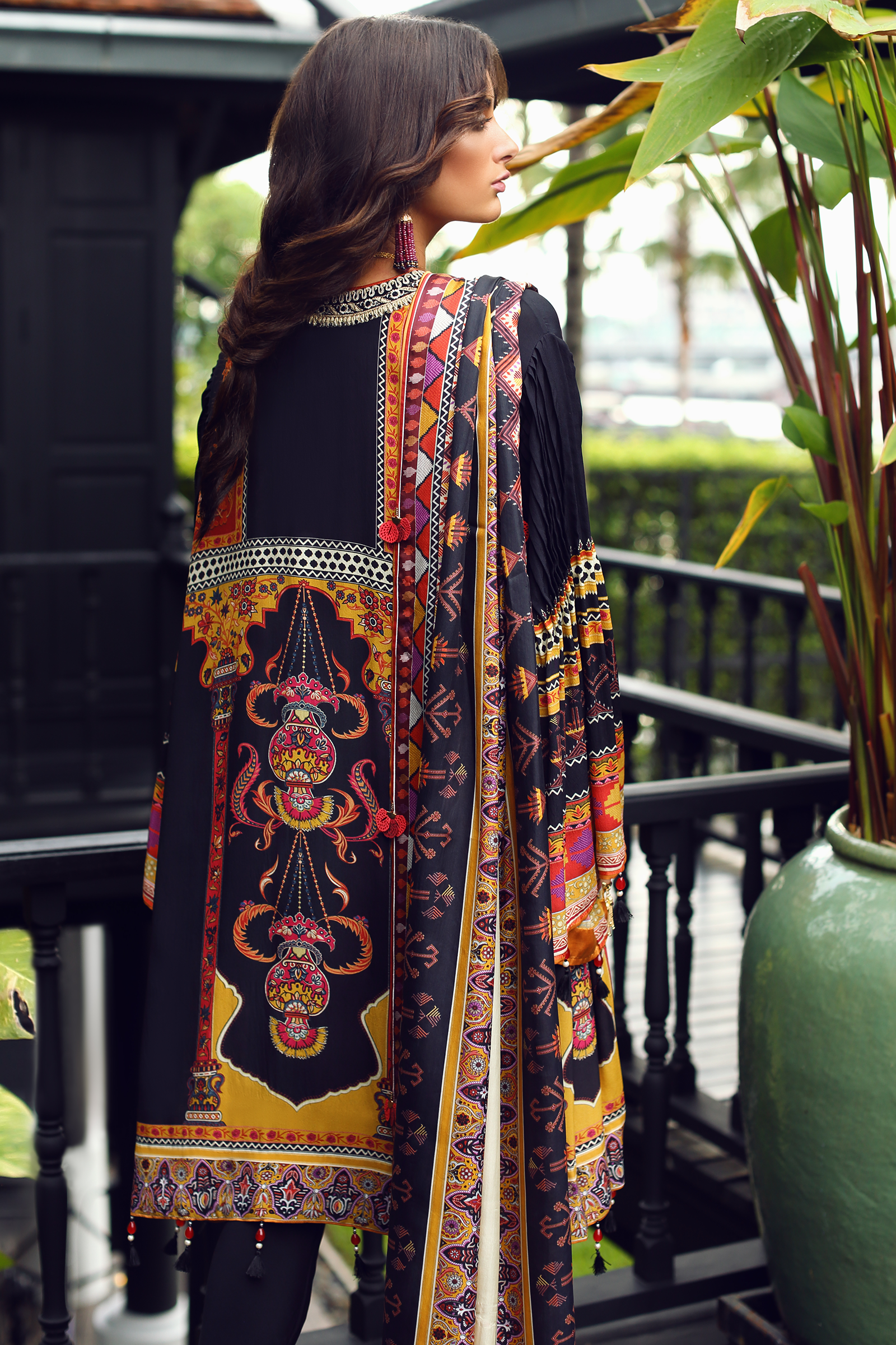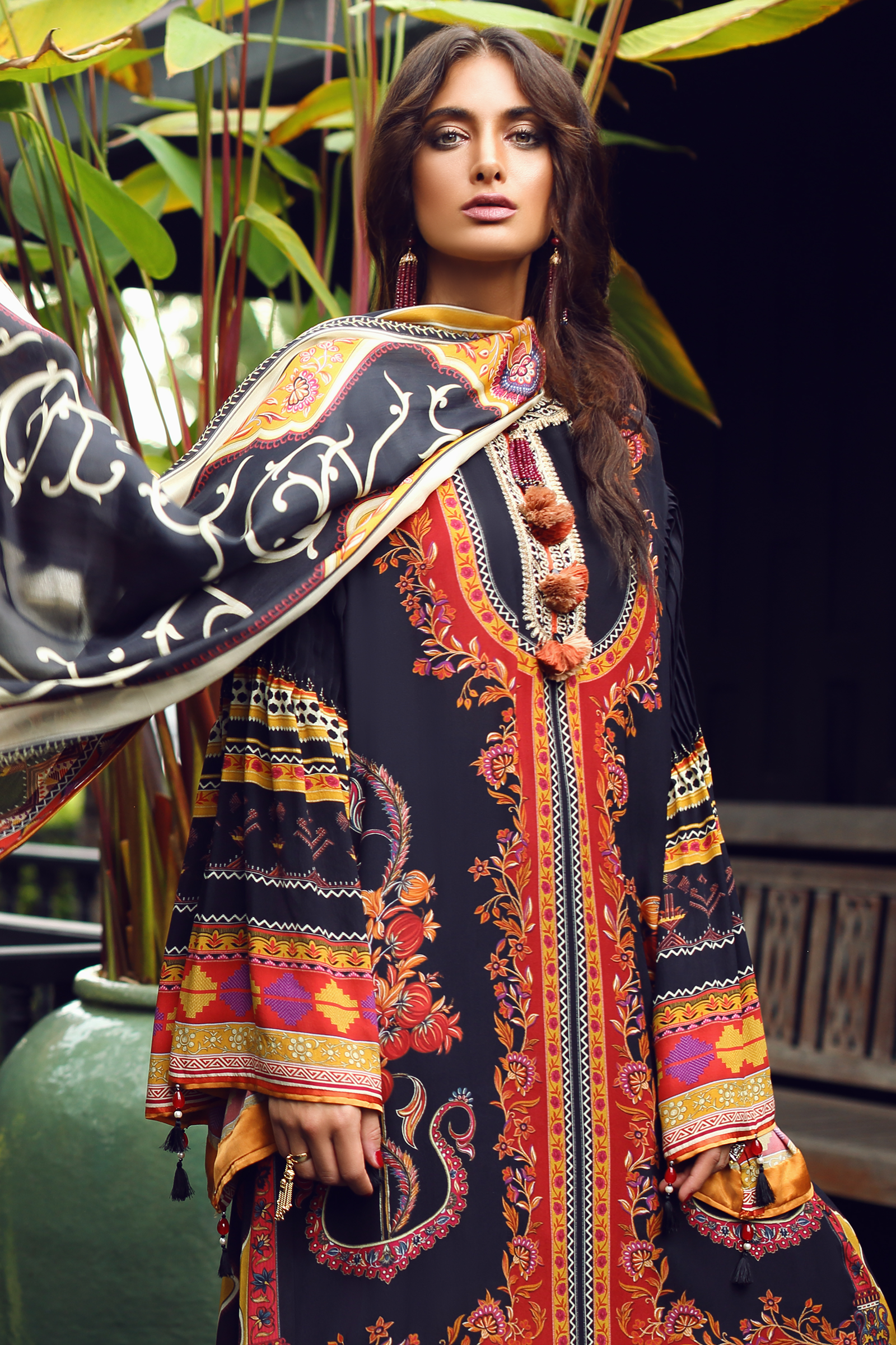 Fabric: A sizzling color palette of black, rust, ochre and pink conjoined with ethnic tribal imagery create an unforgettable look. With the addition of ornate embroideries to further enhance this beautifully composed print, this look will serve you well through the festive season ahead. Digital Printed Dupatta (Pure Medium Silk) 2.50 meters |