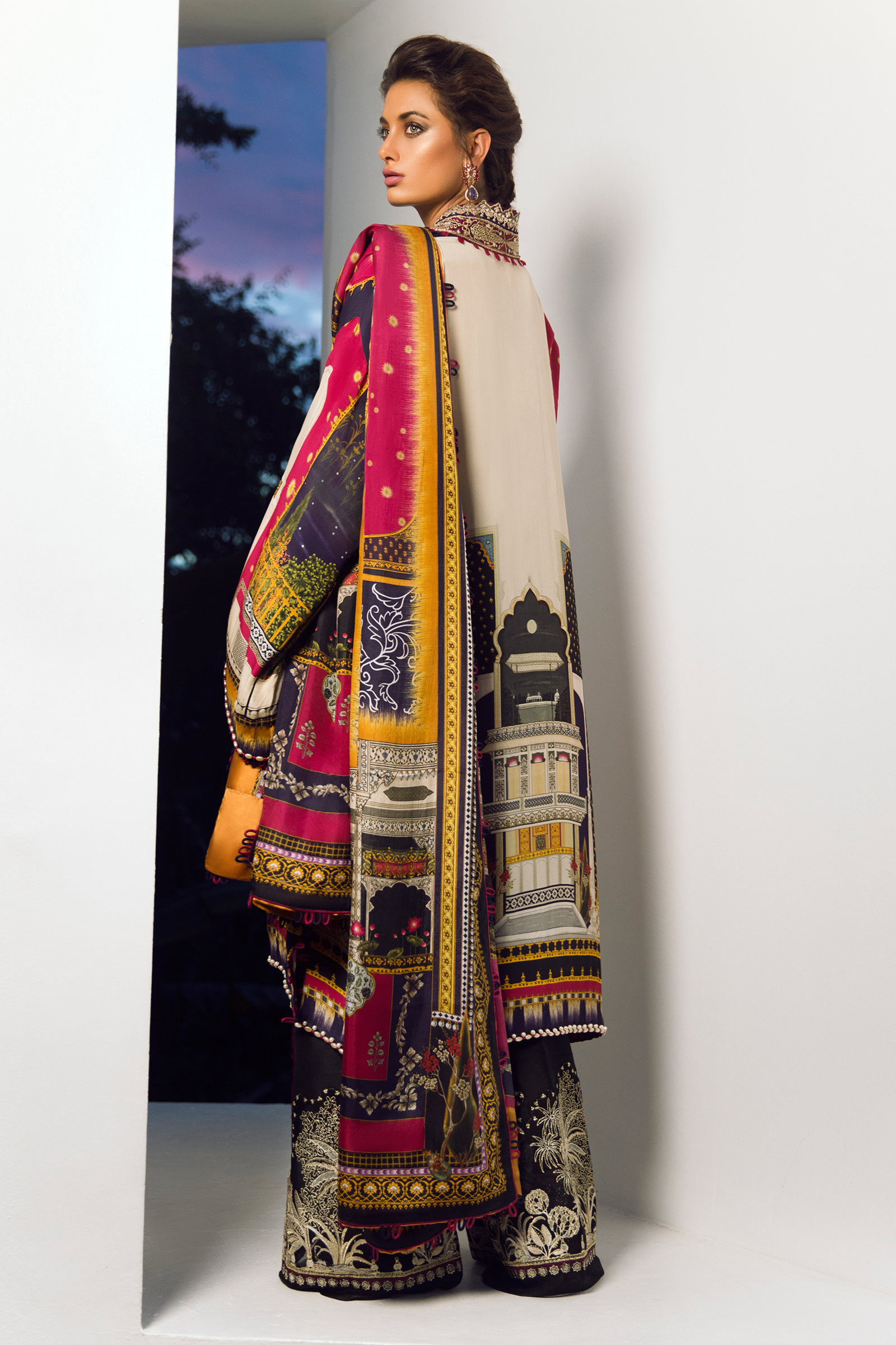 Fabric: Mughal miniature landscapes are artfully arranged on a black base in this stunning design. With embroideries reflecting a dense garden at night and a beautifully patterned silk dupatta this look is a scene stealer for sure. Digital Printed Dupatta (Pure Medium Silk) 2.50 meters |