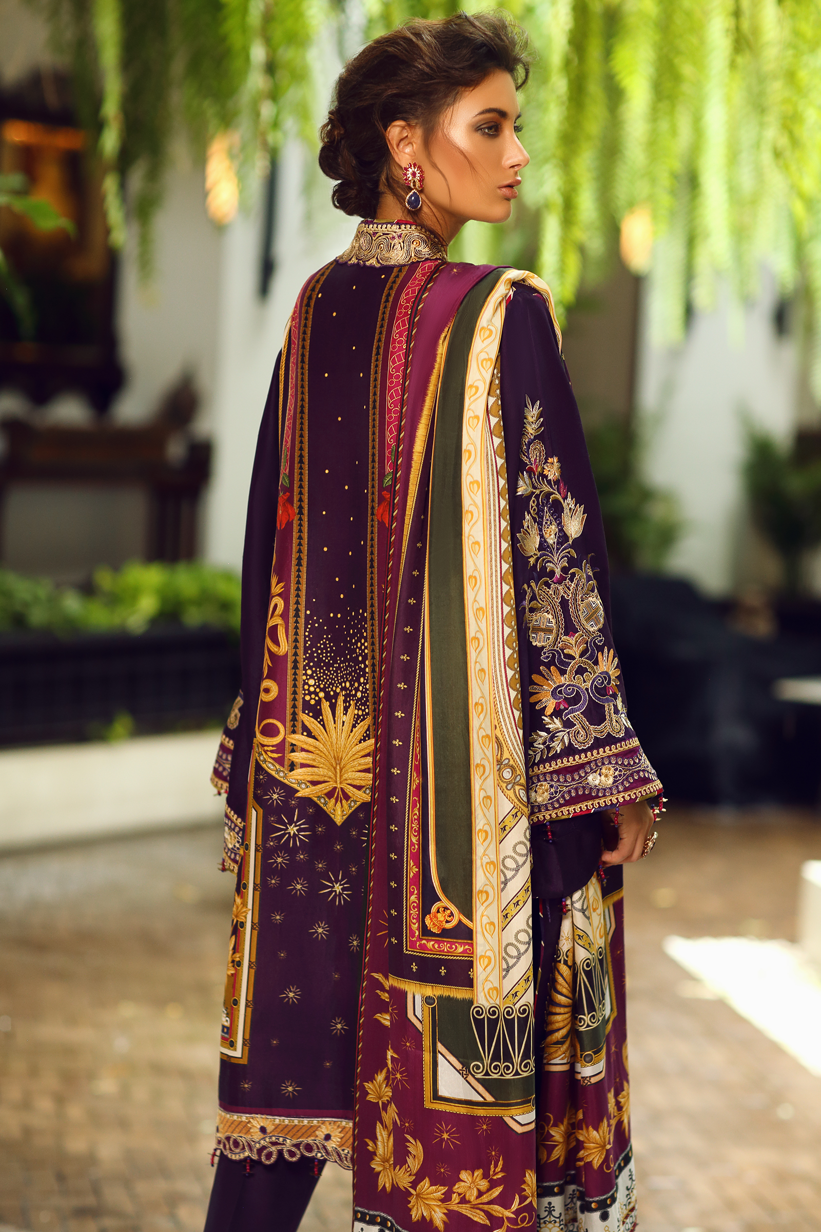 Fabric: A deep plum shade serves as the canvas for this truly delectable design. With ornate chinois embroideries and a vivid silk dupatta in accents of gold and honey, this design is a one of a kind look that is just perfect for night time festivities. Digital Printed Dupatta (Pure Medium Silk) 2.50 meters |