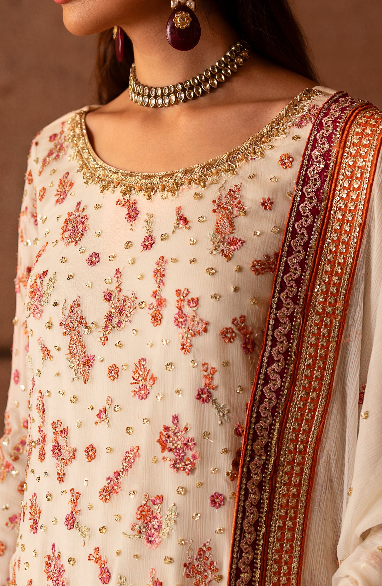 Fabric: Organza Embroidered Hand Made Neck Line. Chiffon Embroidered Front. Chiffon Embroidered Sleeves. Chiffon Fabric For Back. Chiffon Embroidered Dupatta. Organza Embroidered Dupatta Borders. Organza Embroidered Trousers Borders. Raw Silk trouser. |