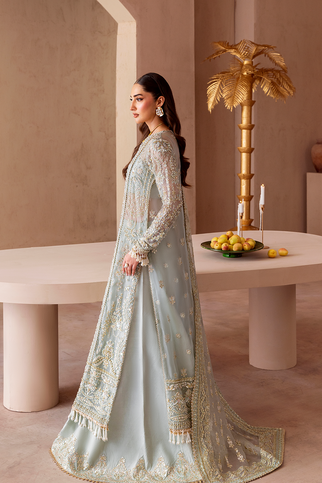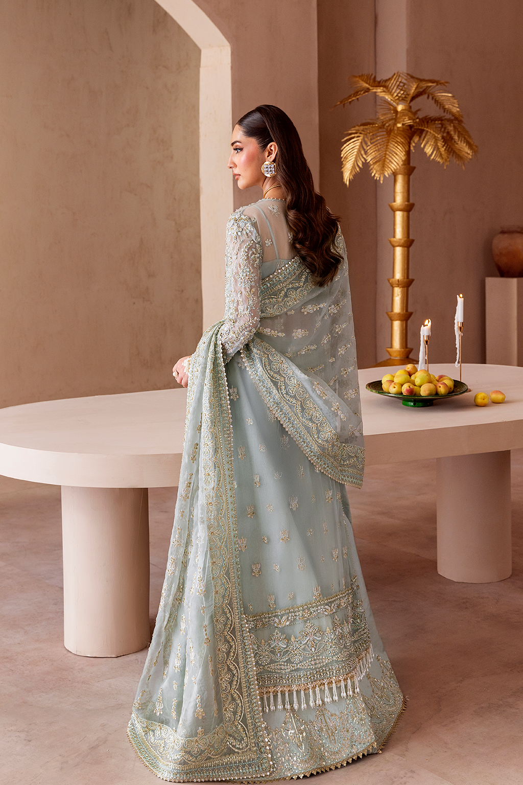 Summary: Embrace regal elegance with 'Nuvra' by Emaan Adeel from the Clay & Couture Luxury Wedding Formals collection. This stunning Pakistani suit features a heavily embroidered kameez in a delicate Sea Green hue, crafted from premium organza. The lightweight and breathable fabric makes it a perfect choice for Spring/Summer weddings. Adorned with exquisite hand-made embroidery on the front, back, and sleeves, this formal wear piece exudes sophistication. This ethnic outfit is an ideal choice for anyone looking to make a graceful statement at a wedding or grand celebration.