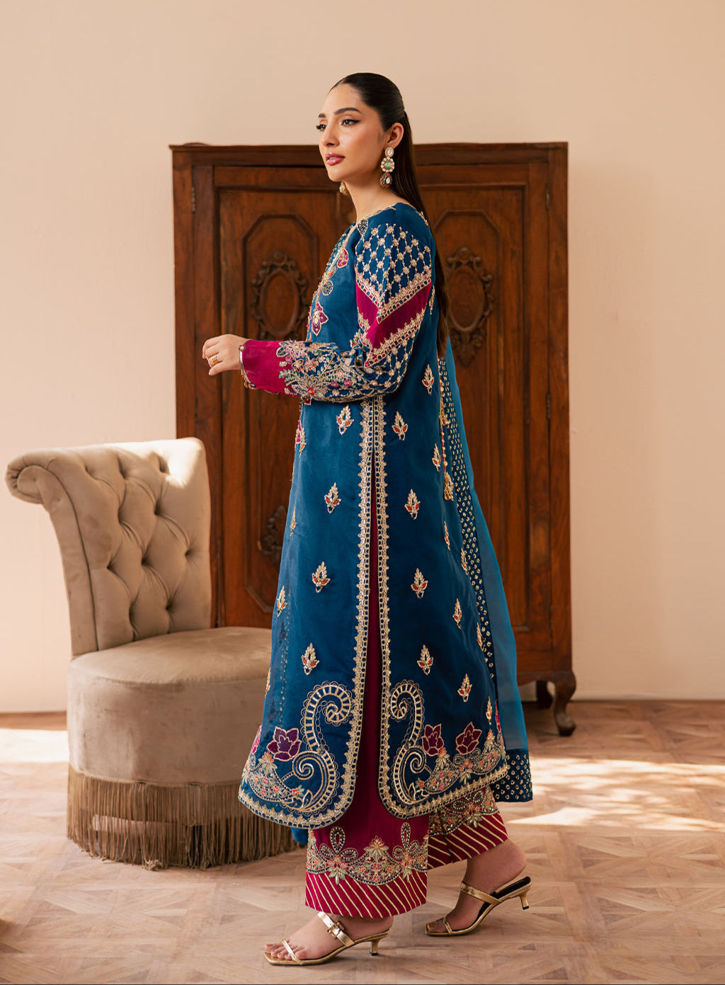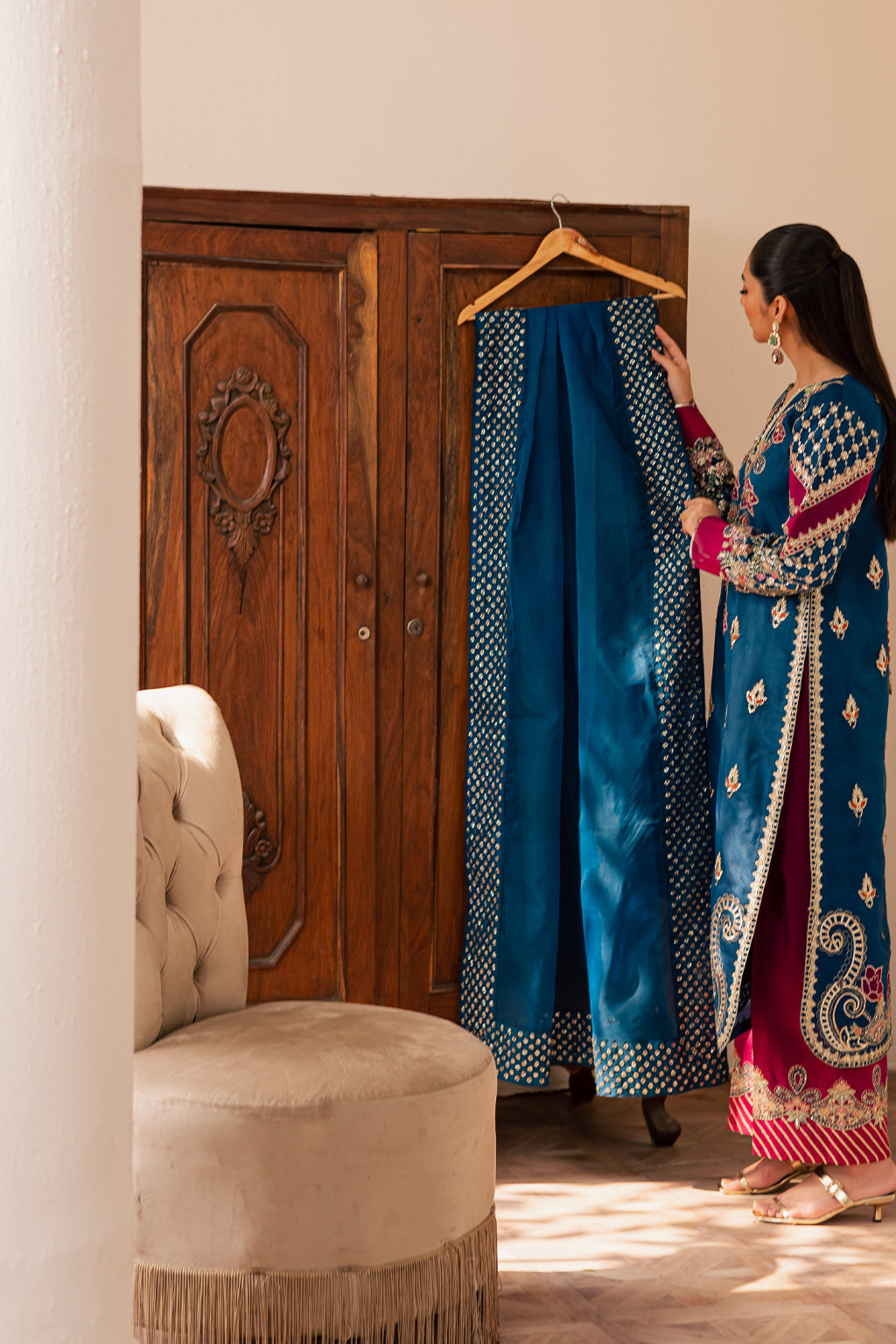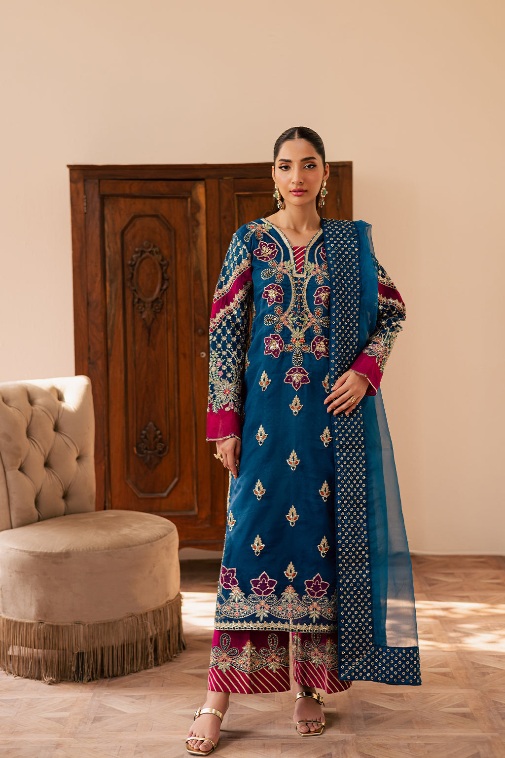 Summary: The Emaan Adeel AVOIR is a luxurious formal Pakistani suit crafted from exquisite organza fabric. This unstitched three-piece ensemble features a mesmerizing turquoise blue kameez adorned with intricate hand-made embroidery on the front, back, sleeves, and daman. The accompanying organza dupatta boasts embroidered borders, enhancing its ethereal charm. Completing the look are raw silk trousers with an embroidered border. This design allows for personalized tailoring to achieve the perfect fit. The vibrant turquoise blue hue exudes elegance, making it an ideal choice for weddings, parties, or other formal gatherings. Experience the allure of Emaan Adeel's craftsmanship with this captivating Pakistani suit.