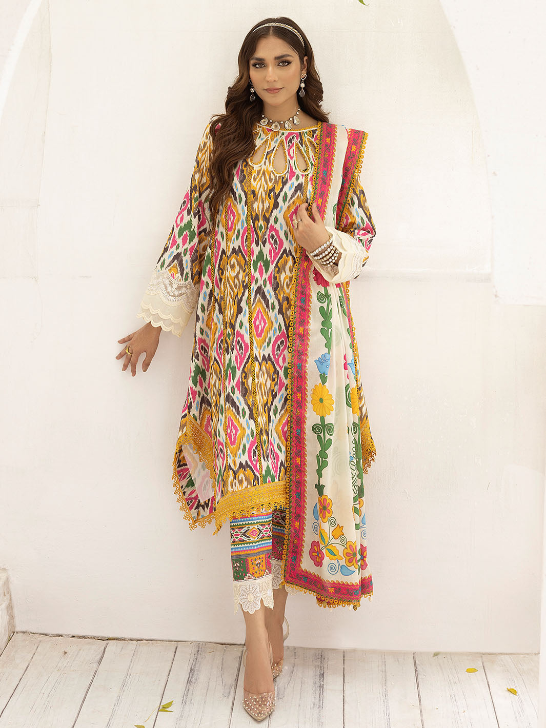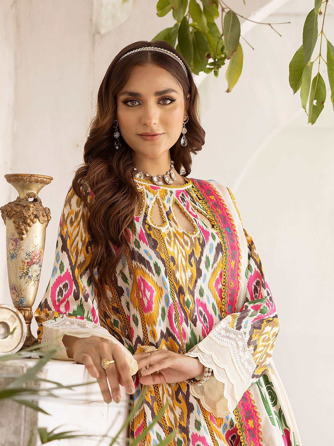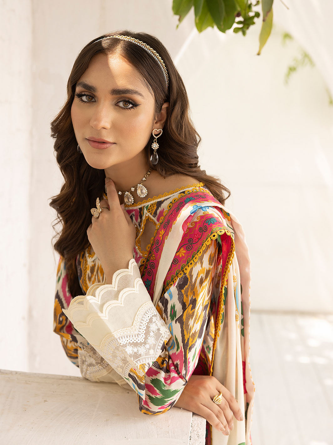 Fabric: Shirt Lawn Printed Shirt 3 Meter Embroidered Sleeves Border on Organza 1 Meter Embroidered Trouser Border on Organza 1 Meter Embroidered Daman Border on Organza 2 Meter Dupatta Digital Printed Voile Dupatta 2.5 Meter Trouser Digital Printed Cambric Trouser 2.5 Meter |