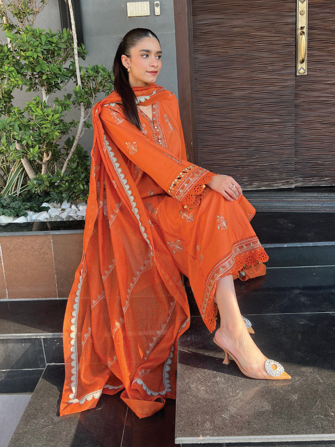 Fabric: Shirt Dyed & Embroiderd front on lawn 1.25 M Dyed plain back on lawn 1.25 M Dyed & Embroiderd sleeves on lawn 1 M Embroiderd Front & Sleeves & Neckline patti on organza 3 M Dupatta Dyed & Embroidered dupatta on cotton net 2.5 M Trouser Dyed plain trouser on cotton cambric 2.5 M |