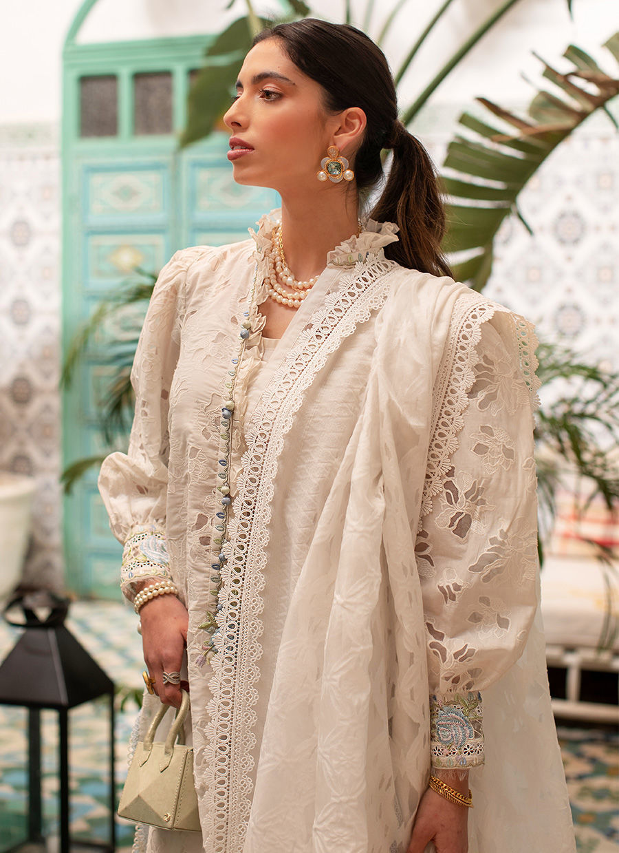Fabric: A classic for every spring, an iconic ivory shirt with a tapestry of innovative technique - laser cutwork. Painterly flowers bloom along the borders in tranquil hues of ice blue and pale green, providing the perfect pop of colour. An exclusively woven dupatta completes the ensemble - perfect for those hot summer occasions when you need to be comfortable yet unquestionably elegant. Unstitched Items - Fabric Included: |