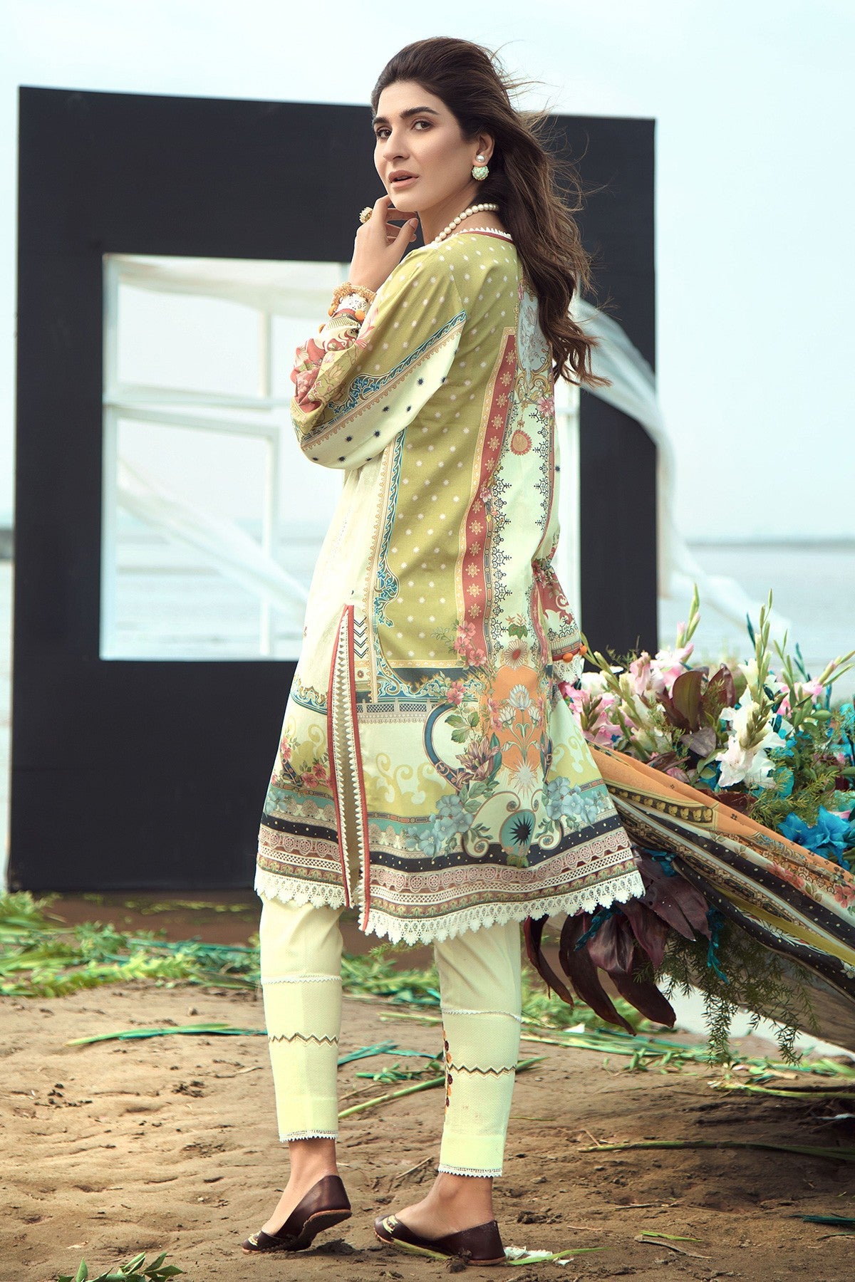 Fabric: 3.18M Digital Printed Lawn Shirt 2.5M Digital Printed Tissue Silk Dupatta 2.5M Dyed textured Cotton Trouser 1Pc Organza Embroidered Neckline 4Pcs Organza Embroidered Trouser Motif |