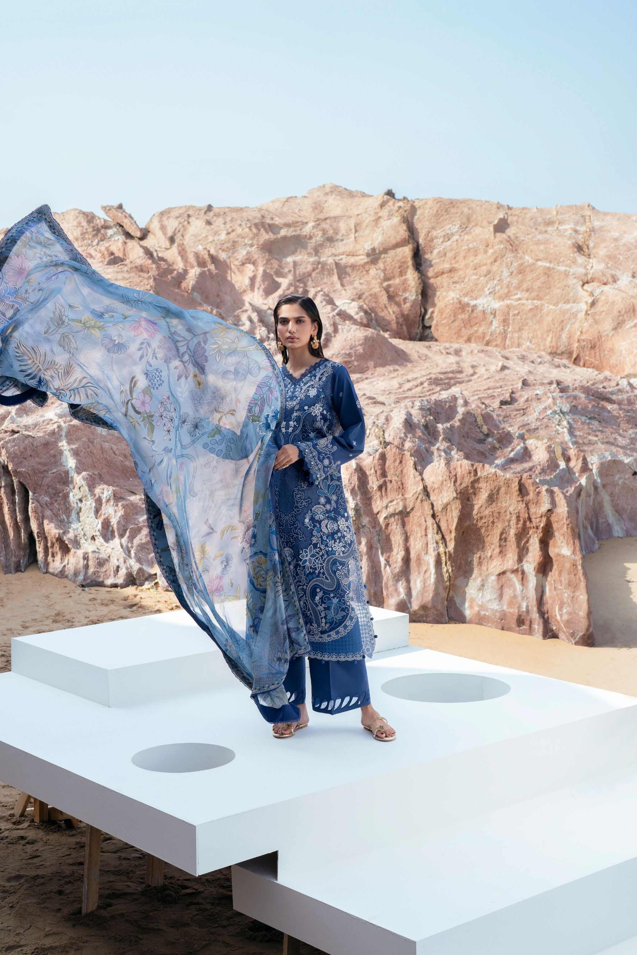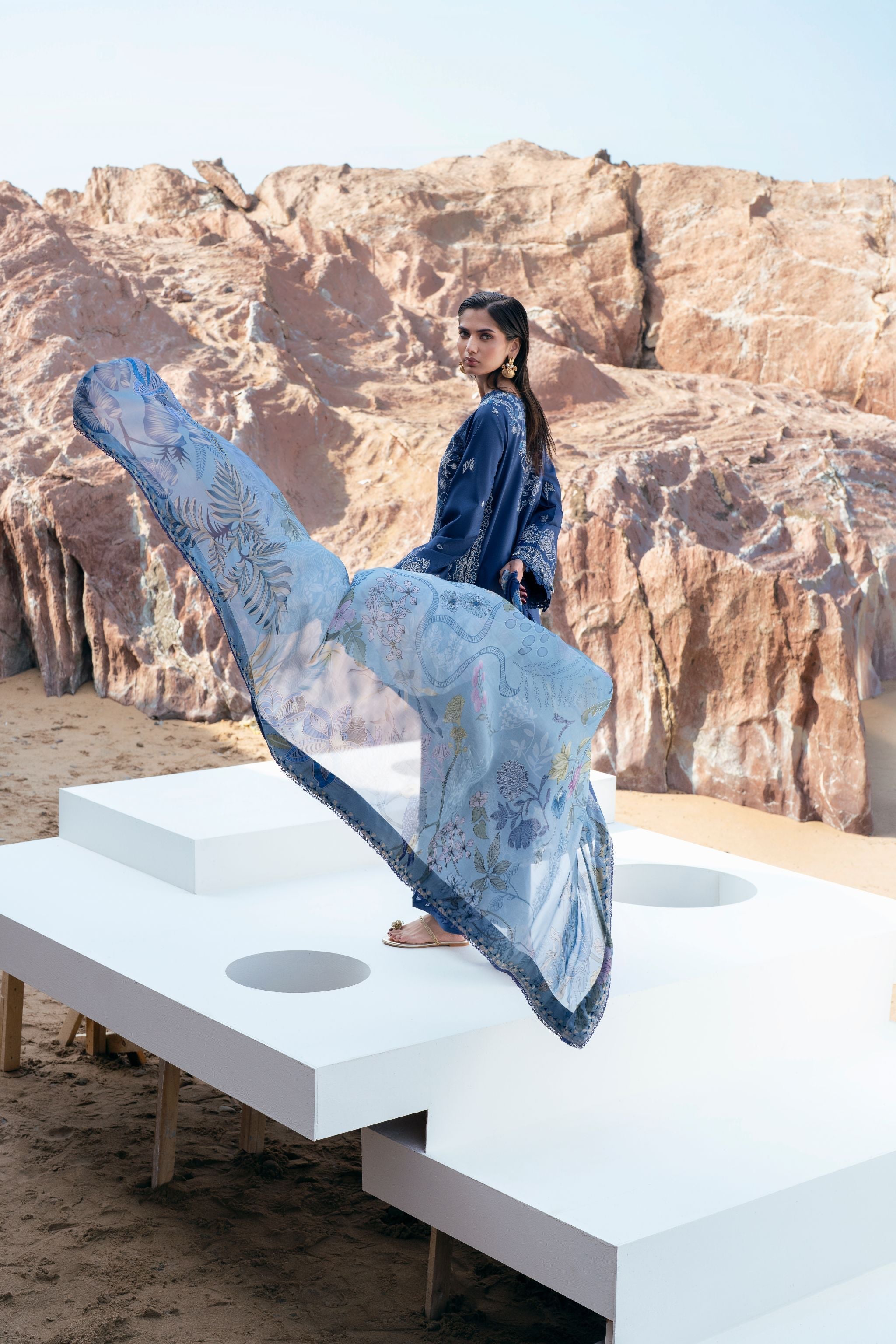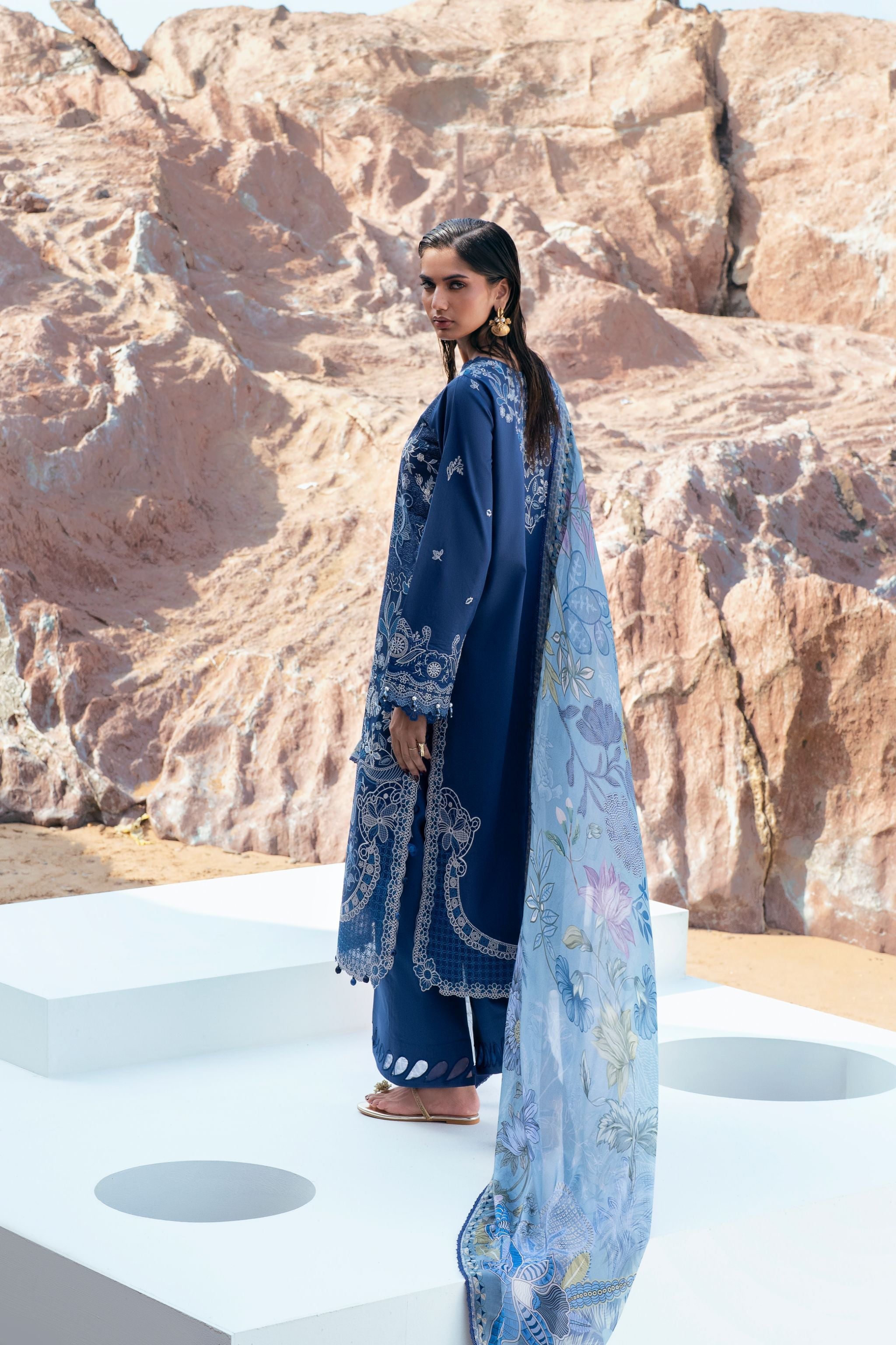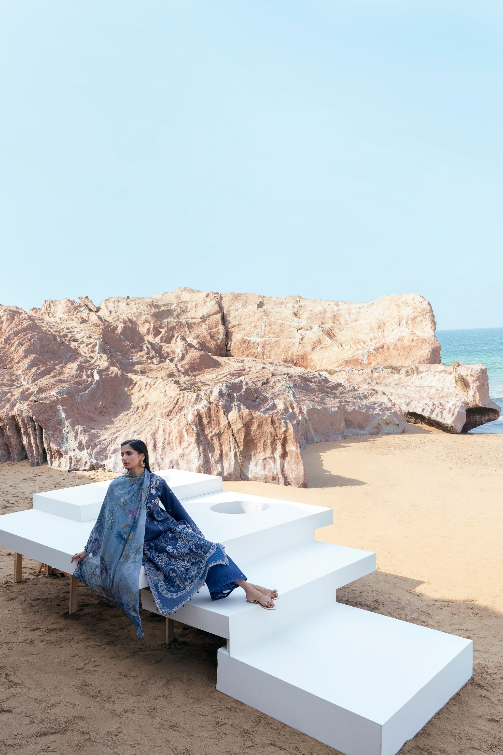 Summary: Embrace timeless elegance with this stunning blue Pakistani suit from the Florent Festive Luxury Lawn collection. Crafted from premium quality lawn, this unstitched dress is light and breathable, making it a perfect choice for spring and summer. The kameez is adorned with intricate embroidery across the front, back, and sleeves, enhanced by delicate embroidered borders for the hem and slits. This sophisticated ethnic wear combines traditional craftsmanship with a modern aesthetic, making it an ideal outfit for Eid, formal dinners, or as elegant party wear.