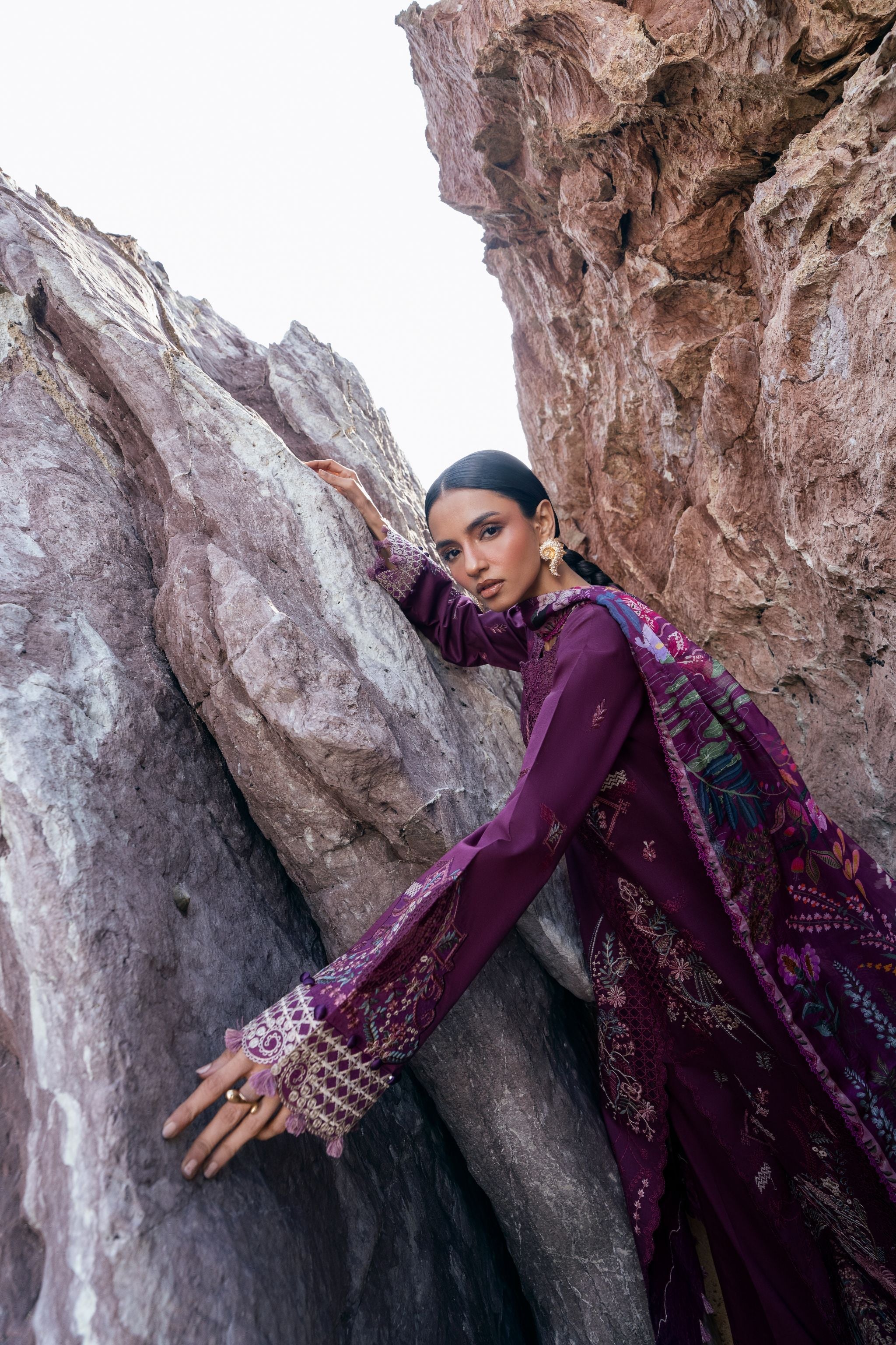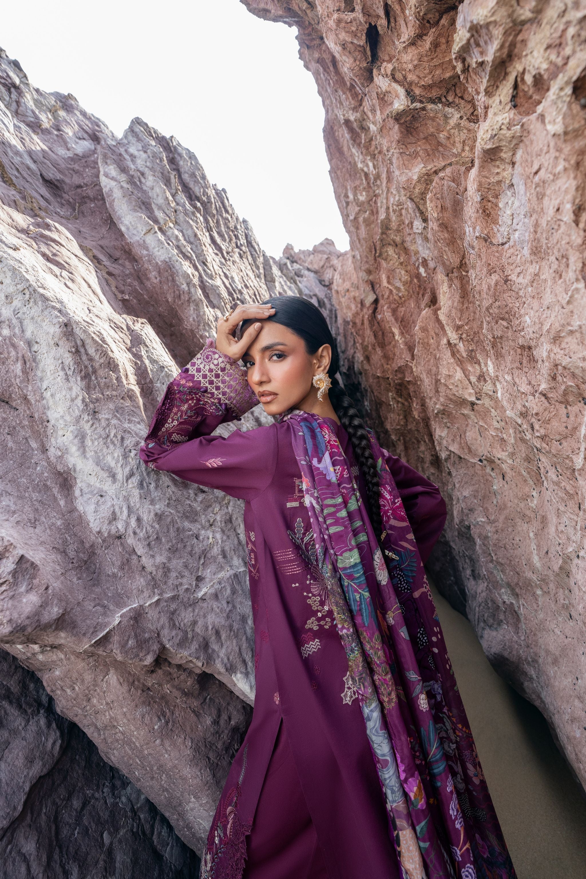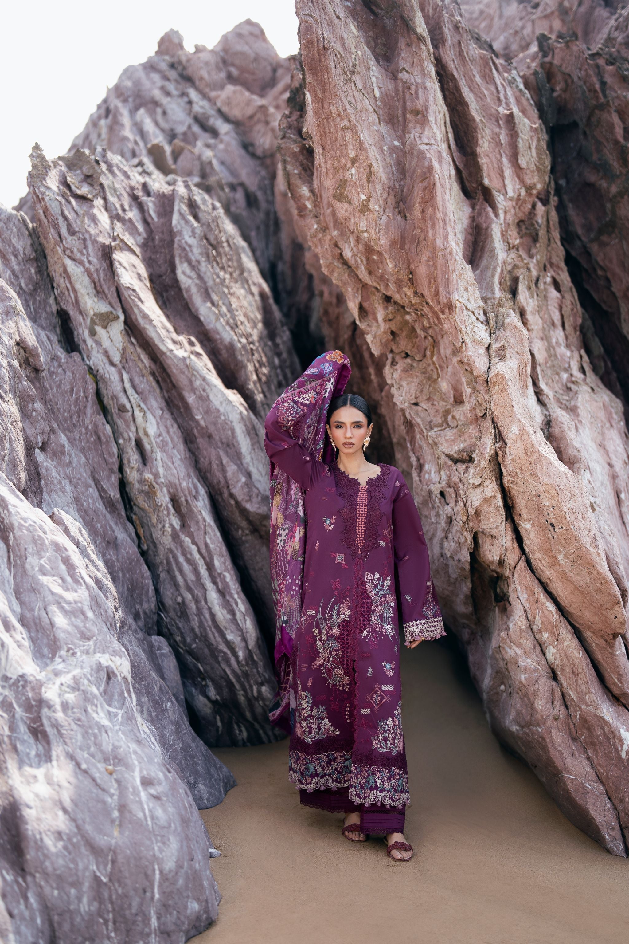 Summary: Embrace elegance with this stunning purple Pakistani suit from the Florent Festive Luxury Lawn collection. Crafted from premium, breathable lawn fabric, this unstitched dress is perfect for spring and summer festivities. The kameez features exquisite, intricate embroidery on the front, back, and sleeves, enhanced by detailed motifs and embroidered borders for a truly luxurious finish. This ethnic wear masterpiece, paired with a vibrant digital printed silk dupatta, exudes sophistication. Ideal for Eid celebrations, wedding guest attire, or any formal occasion, this outfit combines traditional artistry with contemporary style.