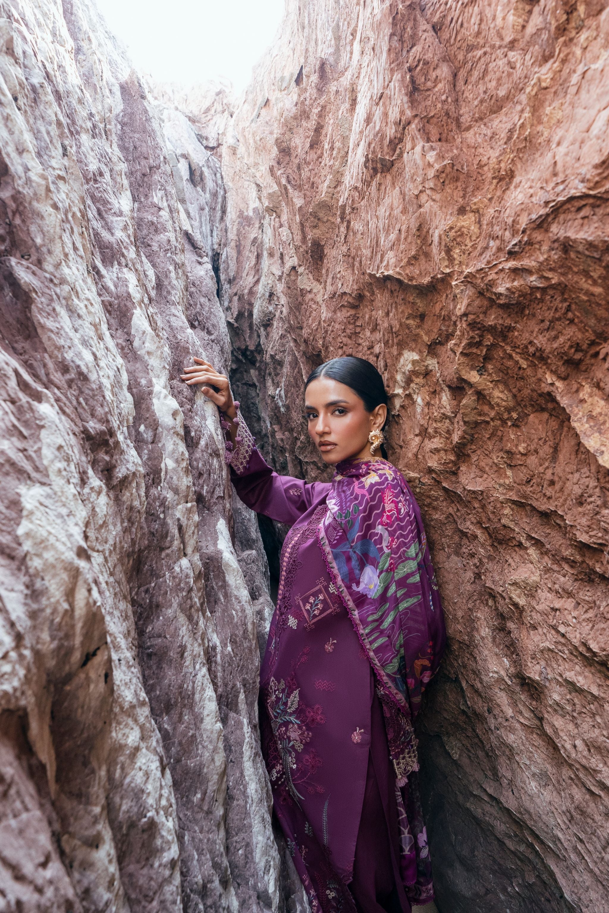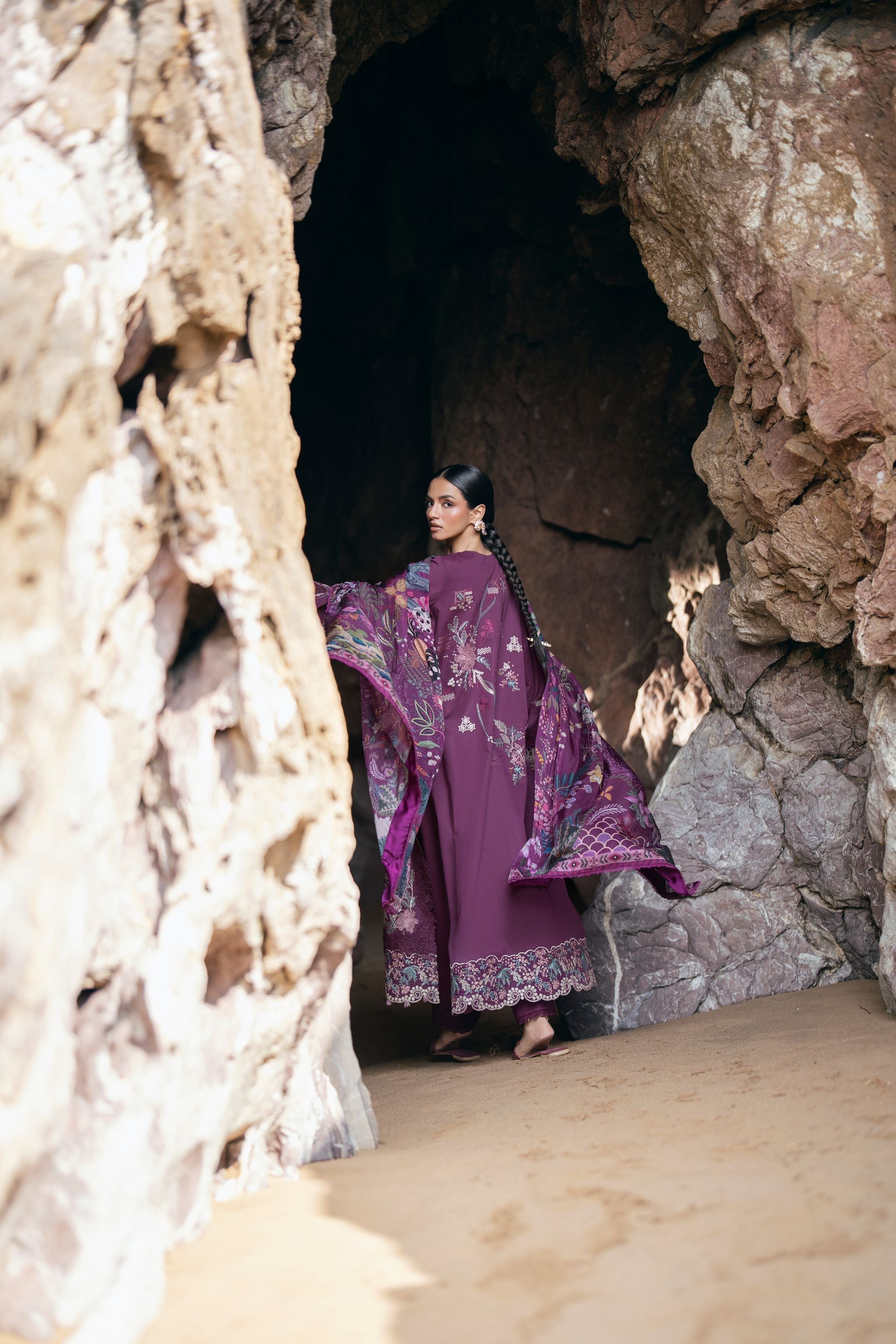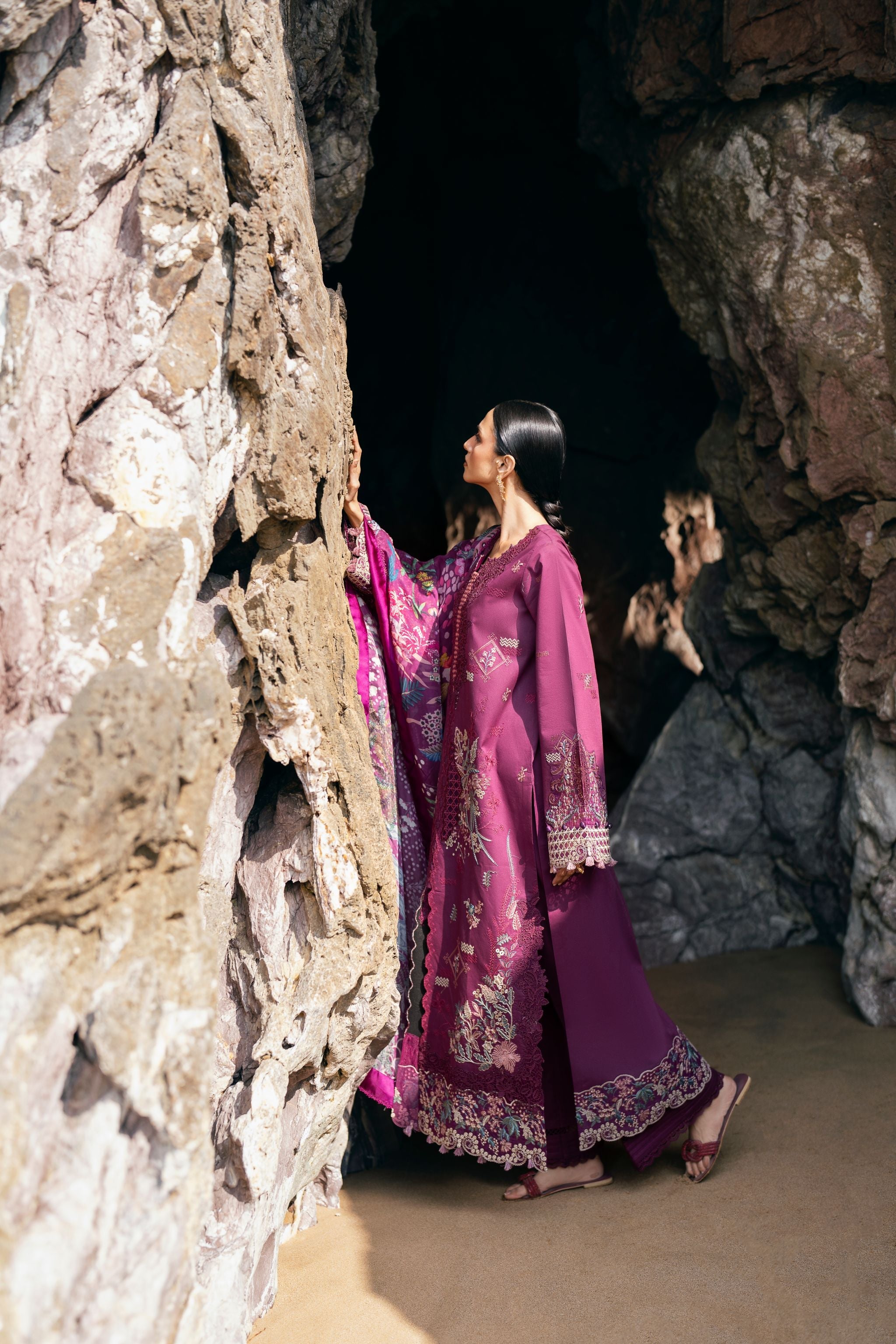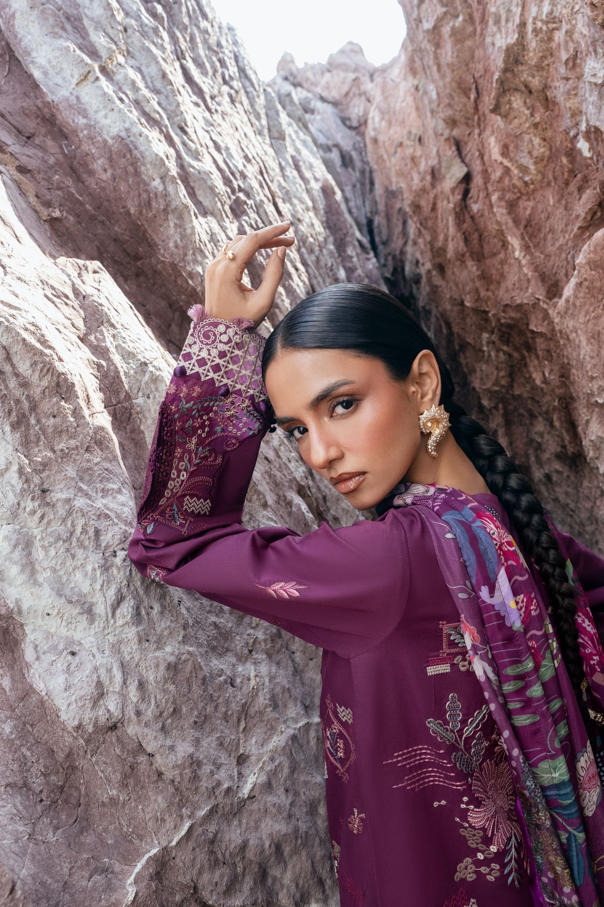 Summary: Embrace elegance with this stunning purple Pakistani suit from the Florent Festive Luxury Lawn collection. Crafted from premium, breathable lawn fabric, this unstitched dress is perfect for spring and summer festivities. The kameez features exquisite, intricate embroidery on the front, back, and sleeves, enhanced by detailed motifs and embroidered borders for a truly luxurious finish. This ethnic wear masterpiece, paired with a vibrant digital printed silk dupatta, exudes sophistication. Ideal for Eid celebrations, wedding guest attire, or any formal occasion, this outfit combines traditional artistry with contemporary style.
