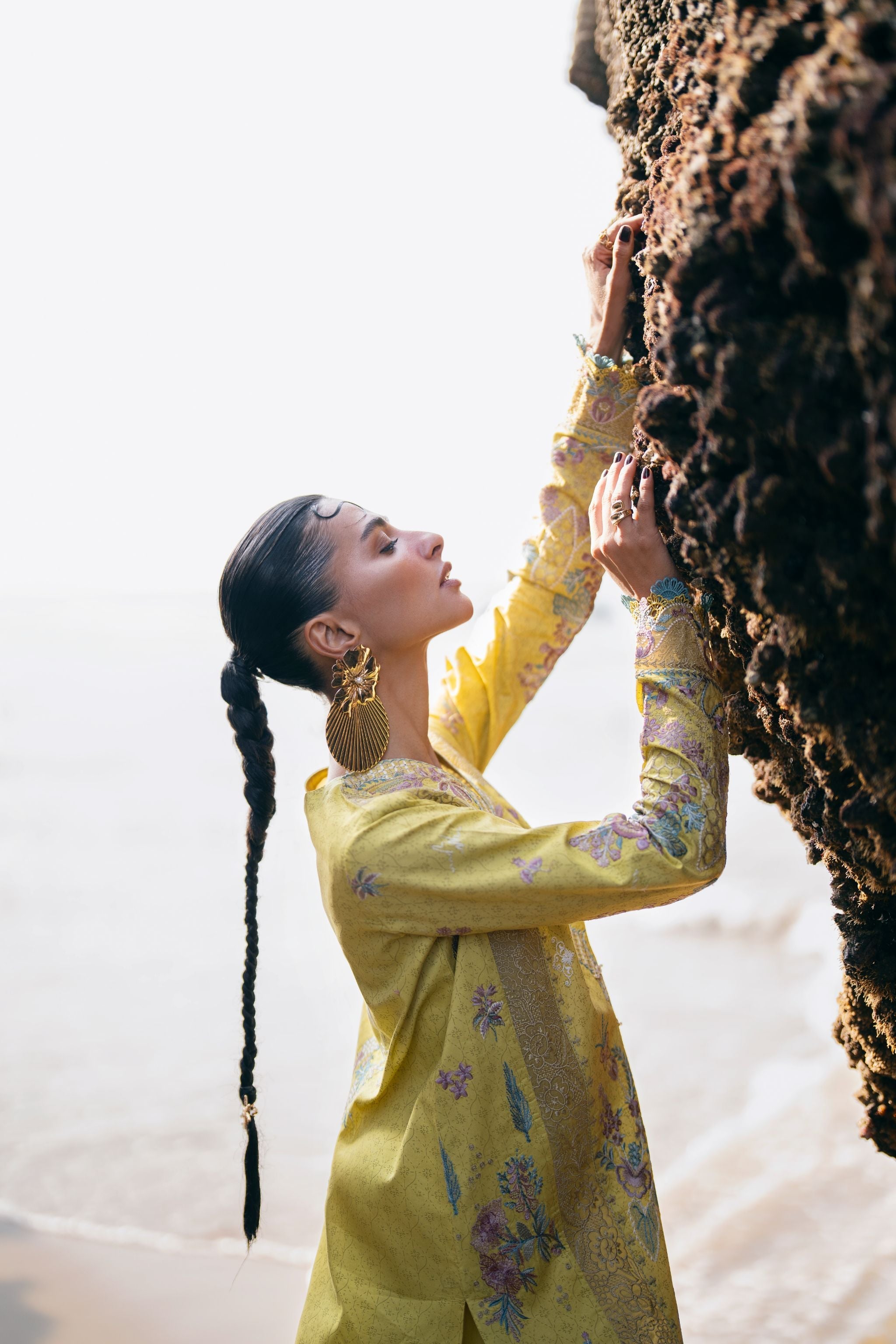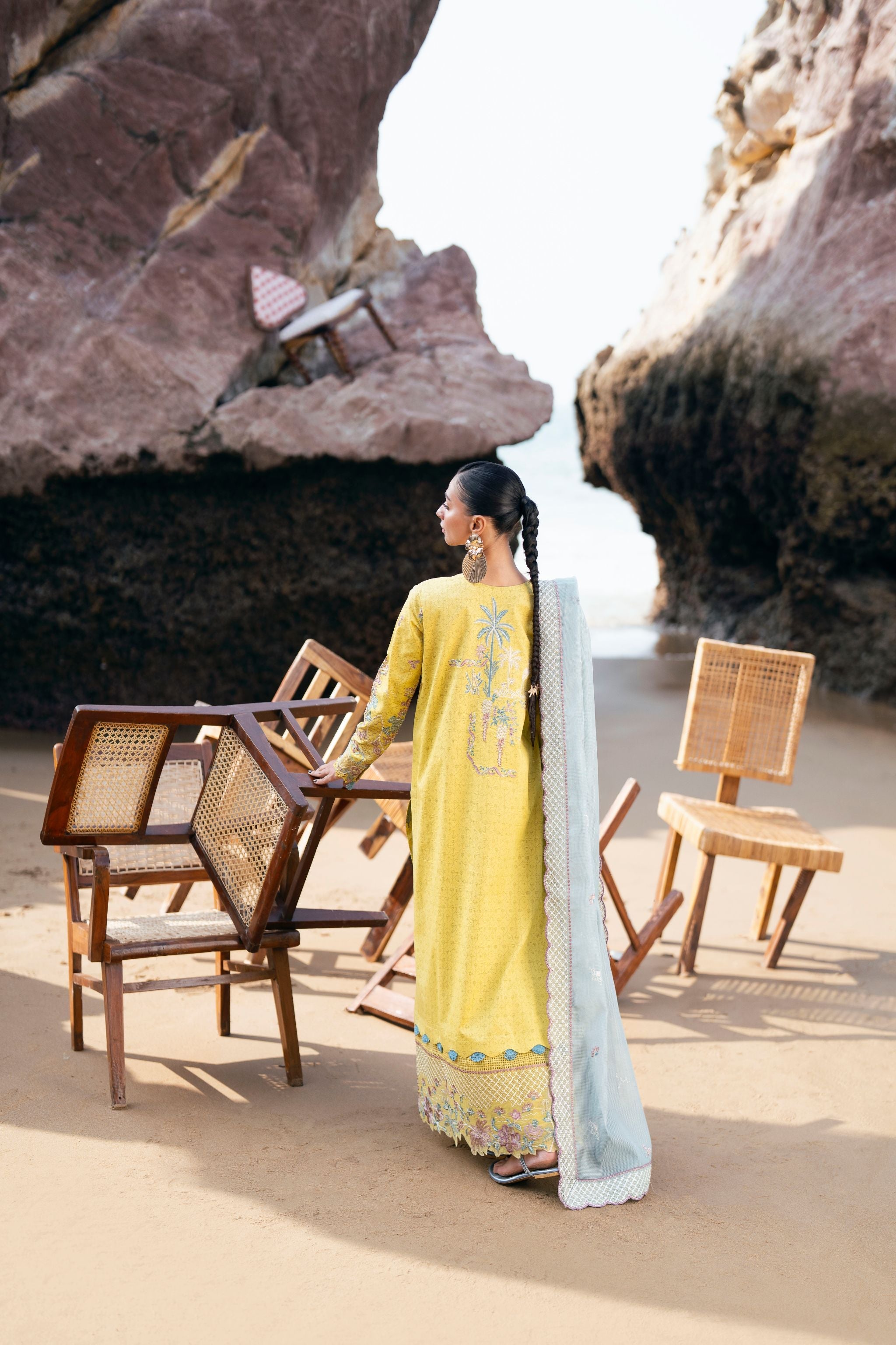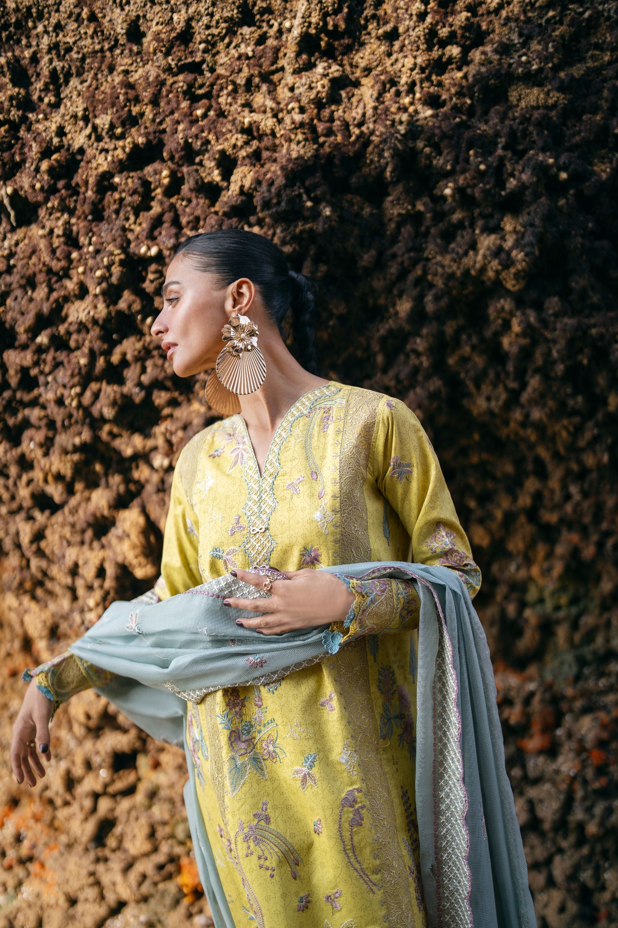 Summary: Embrace festive elegance with this stunning yellow Pakistani Lawn Suit from Florent's Luxury collection. Crafted from breathable lawn fabric, this unstitched dress is a perfect summer outfit. The kameez features intricate embroidery across the front, back, and sleeves, complemented by an elegant hem border and delicate lace detailing on the center panel. This vibrant yellow ethnic wear is ideal for Haldi ceremonies, Eid celebrations, or daytime festive events. Its lightweight feel and sophisticated design make it a must-have piece of festive clothing. Shop this beautiful Pakistani dress online to add a touch of grace to your formal wardrobe.
