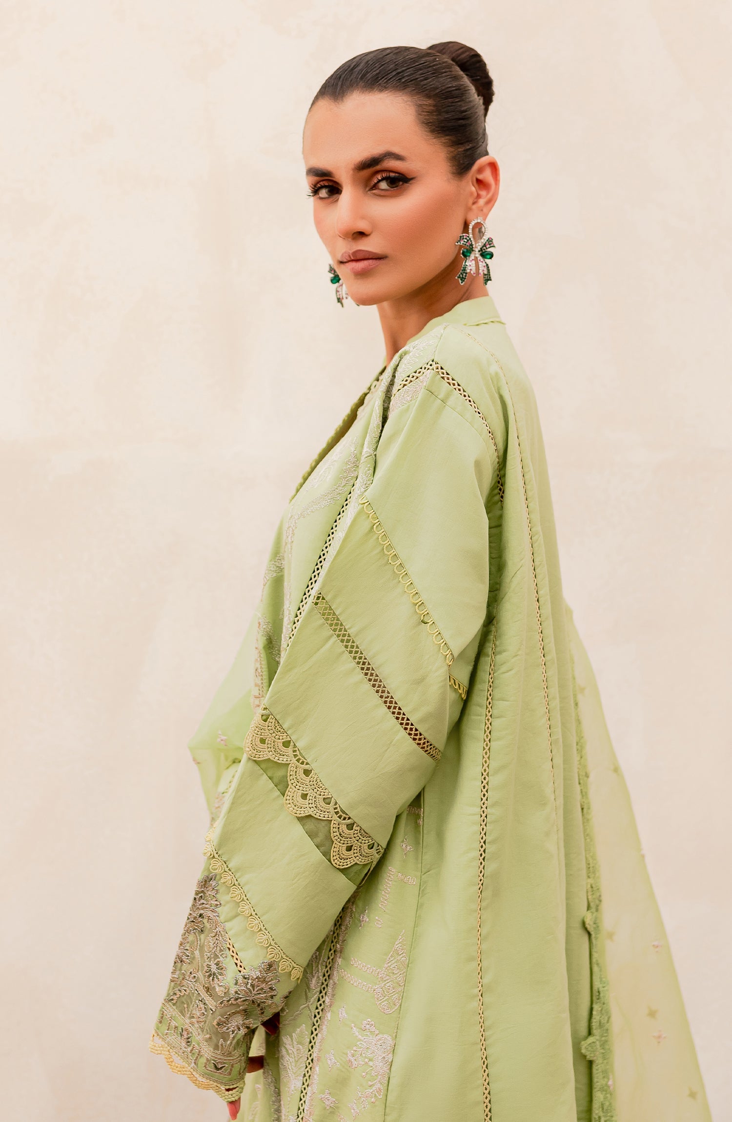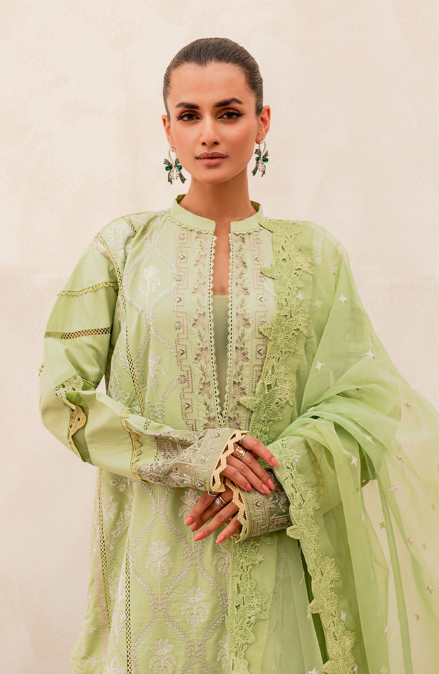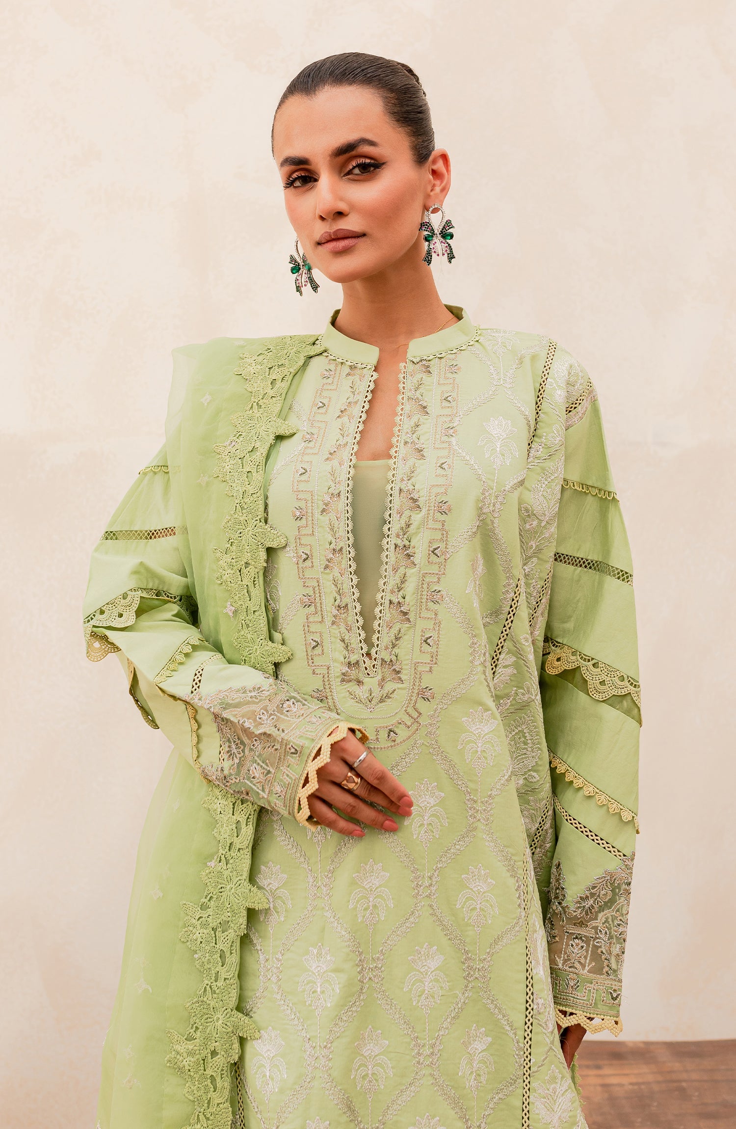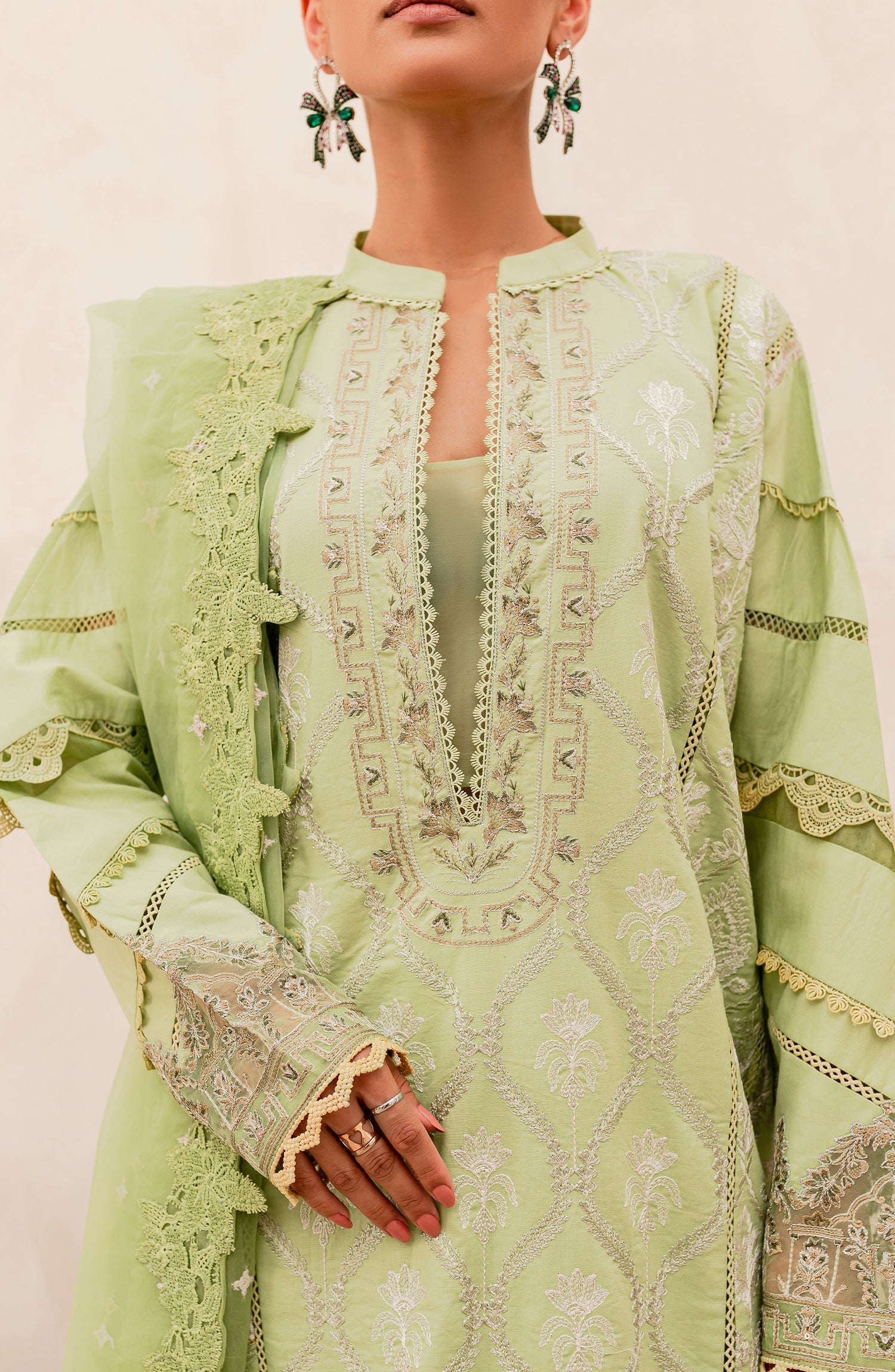 Fabric: Shirt: Embroidered Lawn Front Center Panel 1Pc Embroidered Lawn Front Right Left Panel-1 1Pair Embroidered Lawn Front Right Left Panel-2 1Pair Dyed Lawn Back & Sleeves 1Pc Embroidered Organza Front & Sleeves Patti Patch 2Mtr Embroidered Organza Back Patti Patch 1Mtr Fabric: Lawn Dupatta: Embroidered Organza Dupatta 2.50Mtr Fabric: Organza Trousers: Dyed Cotton Trouser 2.50Mtr Fabric: Cotton |