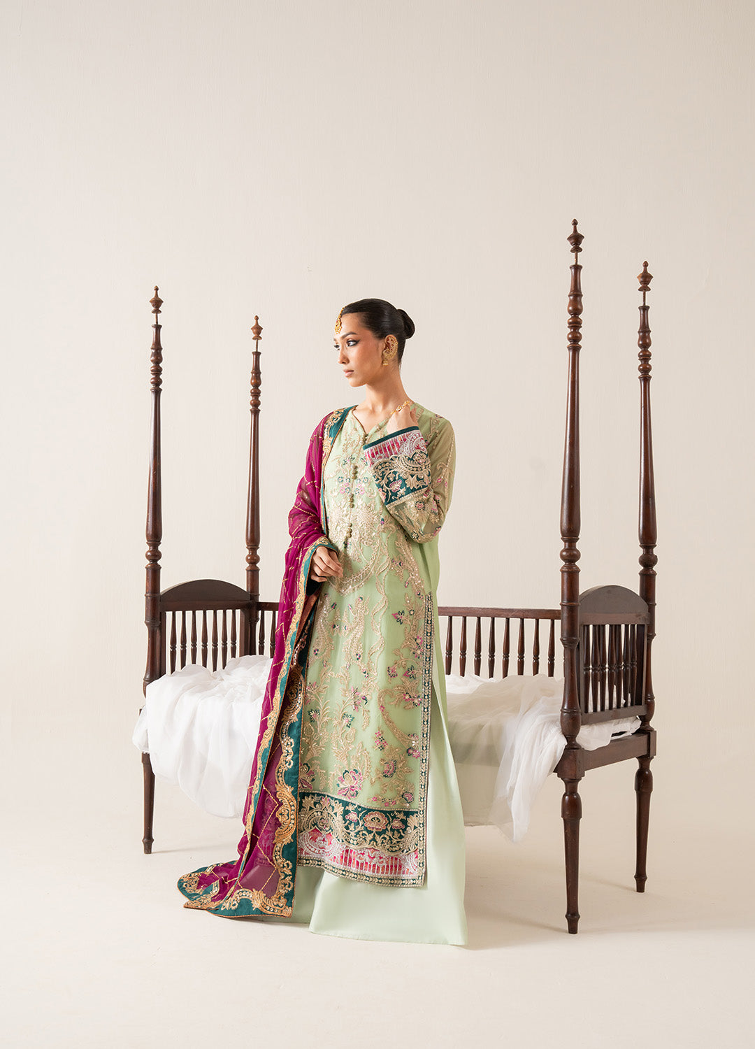 Summary: The Freesia by Maryum N Maria Zaib COSETTE - FS50135 is a stunning sea green chiffon Pakistani suit designed for formal occasions. This unstitched three-piece ensemble features an intricately embroidered chiffon shirt, a beautifully embellished chiffon dupatta, and coordinating grip trousers. The delicate sea green hue of the shirt is perfect for mehndi celebrations or other special events. Crafted from high-quality chiffon, the shirt boasts elaborate embroidery that adds a touch of elegance and sophistication. The matching chiffon dupatta is equally impressive, with detailed embroidery and a luxurious finish. The grip trousers provide a comfortable and flattering fit, completing the look. This exquisite Pakistani suit is perfect for women who appreciate fine craftsmanship and timeless style. The Freesia collection represents the pinnacle of luxury formals, and this COSETTE design is a true testament to the brand's commitment to quality and design. Whether you're attending a wedding, a formal party, or any other special occasion, this sea green chiffon suit is sure to make a lasting impression.