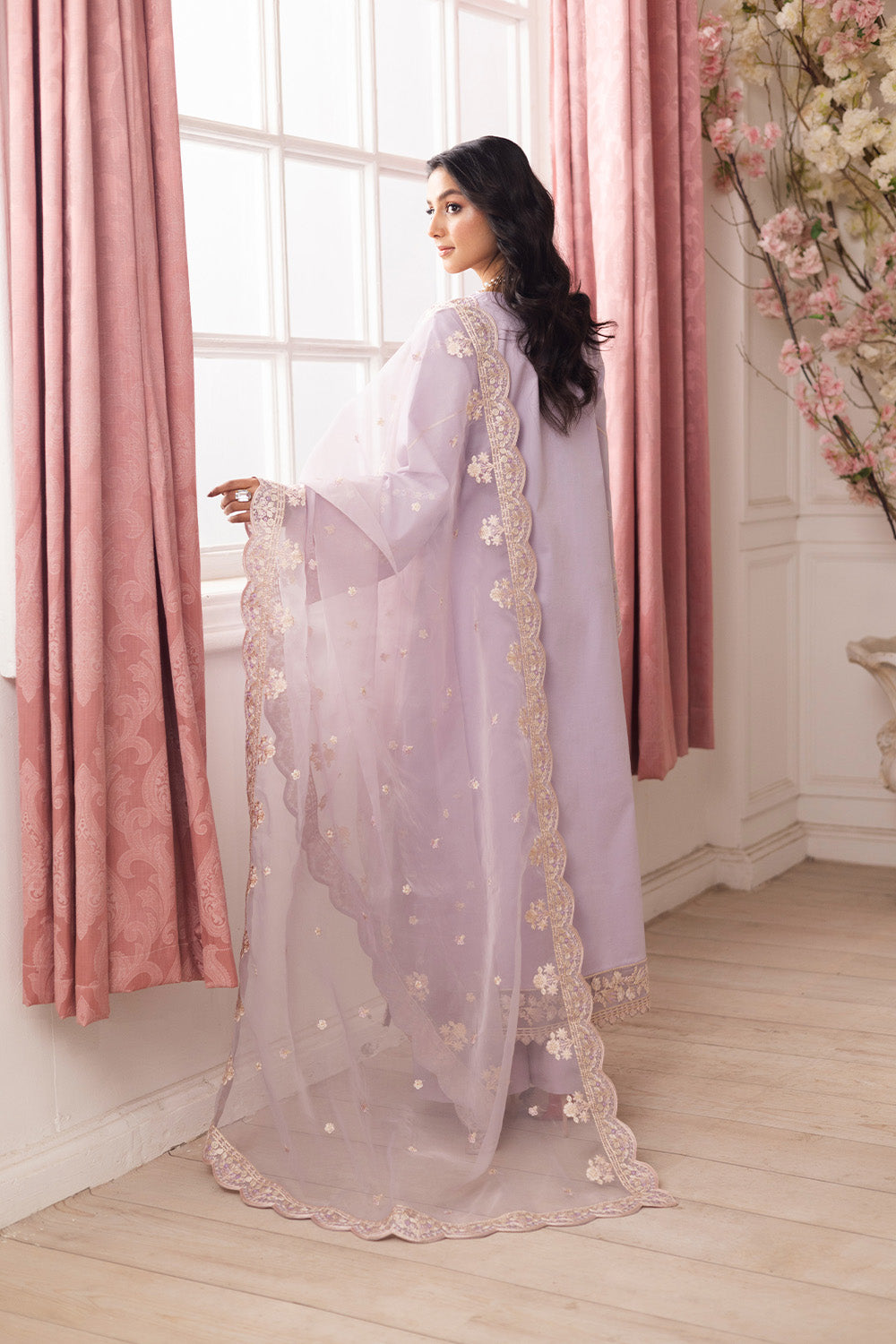 Summary: Embrace elegance with the Freesia Mira Lawn suit by Maryum N Maria. This stunning lavender Pakistani suit is crafted from high-quality lawn fabric, ensuring breathability and comfort during the spring/summer season. The intricately embroidered front, sleeves, and daman patti showcase exquisite craftsmanship, adding a touch of sophistication to this ensemble. The accompanying organza dupatta, also adorned with embroidery, beautifully complements the overall look, enhancing its ethereal charm. The cotton trousers provide a comfortable and stylish finish to the ensemble. Perfect for party wear, this unstitched suit allows you to customize the fit and style to your preference. Make a statement with this exquisite creation by Maryum N Maria, perfect for adding a touch of grace to your wardrobe. This three-piece unstitched suit includes an embroidered lawn shirt, embroidered organza dupatta, and dyed cotton trousers. Step into the spotlight and radiate grace with this captivating lavender Pakistani suit. Buy now and experience the allure of Maryum N Maria's exquisite designs.