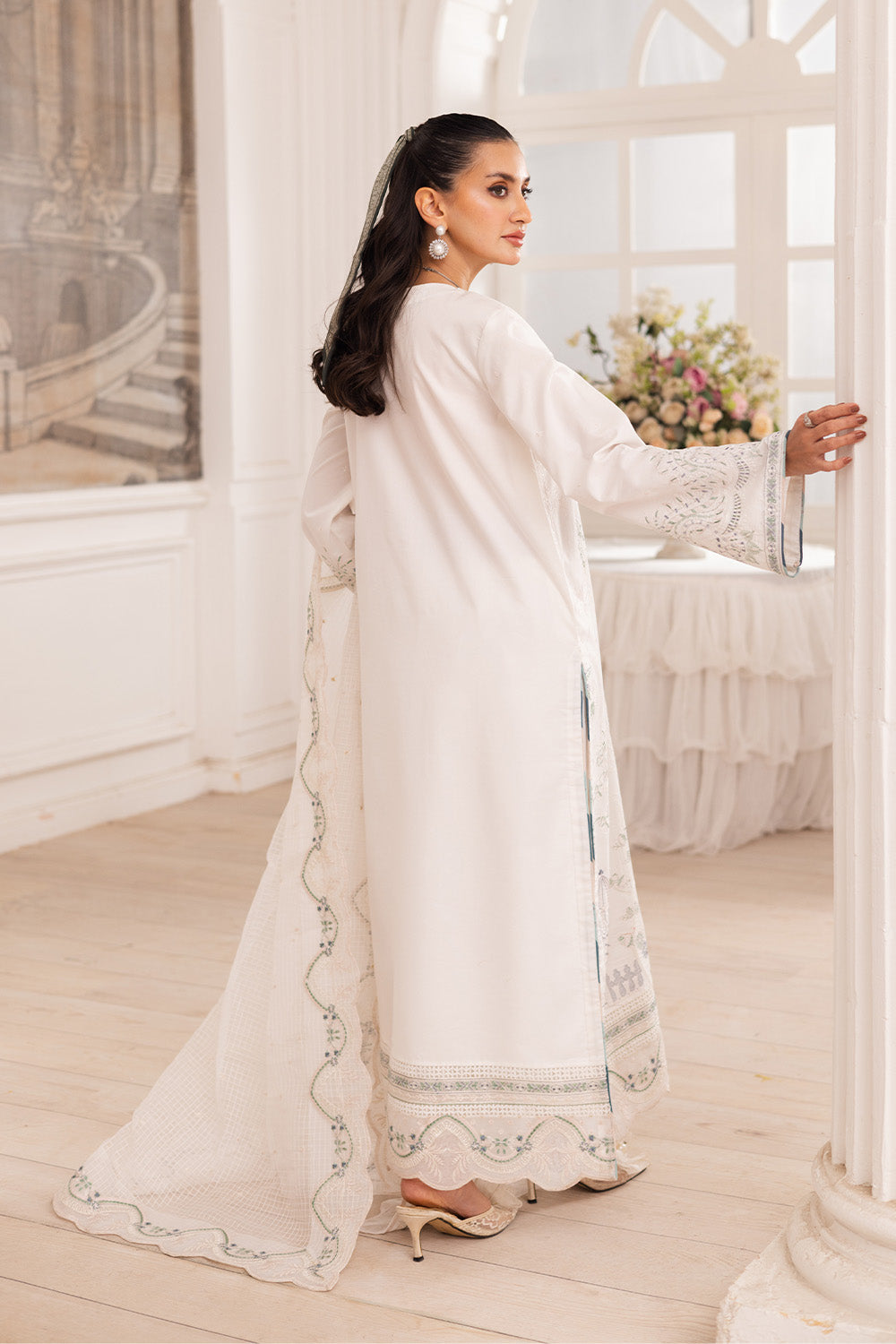 Summary: The Freesia Mira Lawn Suit by Maryum N Maria, identified as MAIRA - FS50107, offers a refreshing take on everyday elegance. This unstitched three-piece Pakistani suit features a predominantly white lawn shirt, adorned with delicate embroidery. While subtle hints of other colors might peek through the intricate patterns, the overall impression is one of pristine white. This makes it incredibly versatile and easy to accessorize for various occasions. The shirt fabric comprises a combination of embroidered lawn panels for the front, back, and sleeves, enhanced with organza detailing at the daman and sleeve edges. The accompanying dupatta, crafted from check organza, adds a touch of sheer grace with its embroidered details and a beautifully embellished organza pallu. Completing the ensemble is a comfortable cotton trouser in a matching white hue. This Pakistani Lawn suit is ideal for the spring/summer season and perfect for adding a touch of effortless sophistication to your daily wardrobe. Its breezy lawn construction ensures comfort and breathability, while the detailed embroidery elevates it beyond the ordinary. With the Freesia Mira Lawn Suit, you embrace both comfort and style.