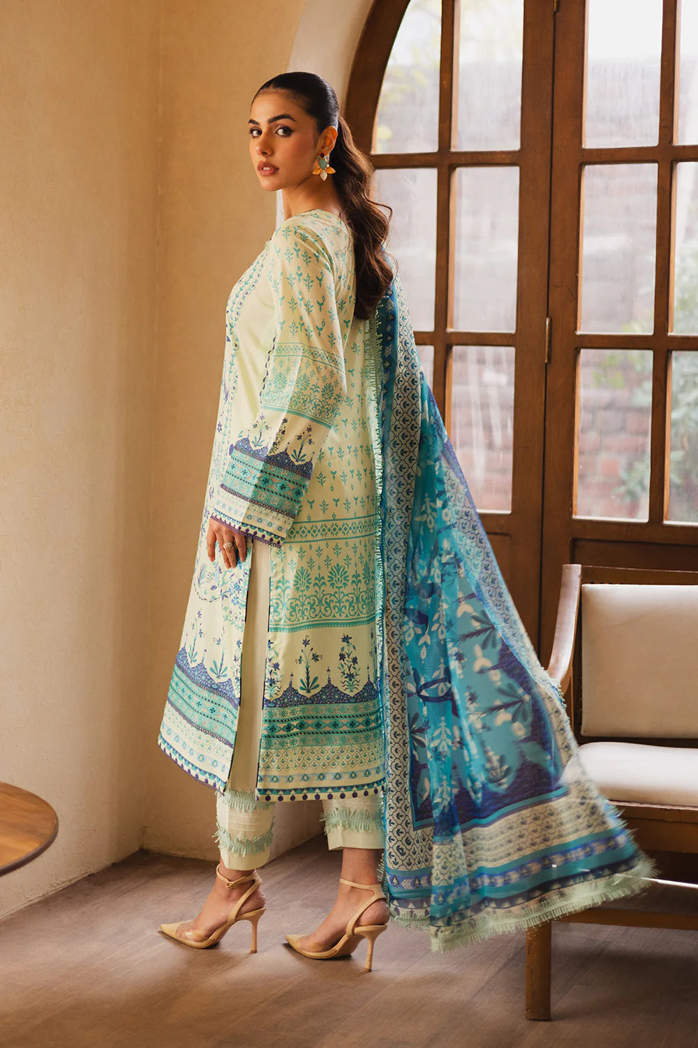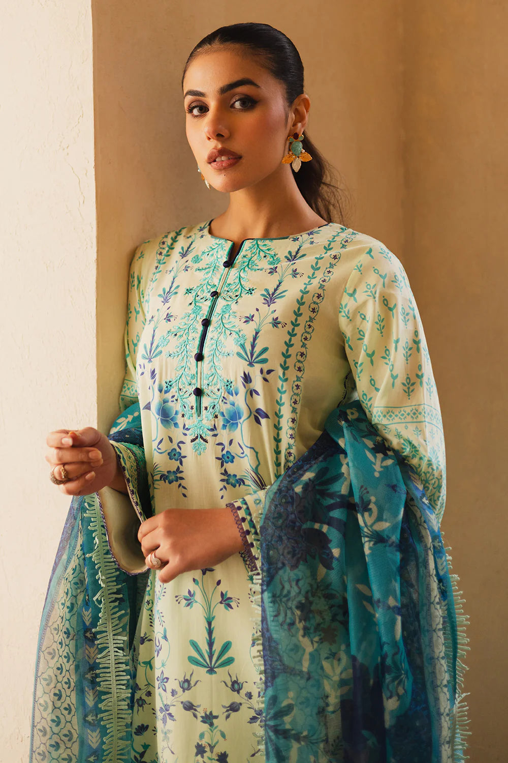 Summary: Embrace effortless summer style with the Freesia Zen Lawn Suit by Maryum N Maria – FW-50082 Lina. This unstitched three-piece suit features a sophisticated off-white printed lawn shirt, adorned with delicate organza embroidery on the neckline and Patti. The intricate floral patterns add a touch of feminine charm, creating a look that's both classic and contemporary. The accompanying cotton net dupatta boasts a vibrant print that beautifully complements the shirt. It adds a pop of color and a playful airiness to the ensemble. Complete your look with the dyed cambric trouser, providing a comfortable and stylish base for the outfit. This Pakistani suit is perfect for warm-weather occasions, offering breathable comfort and effortless chic. Whether it's a casual day out or a relaxed evening gathering, the Freesia Zen Lawn Suit ensures you stay cool and stylish all day long. This versatile suit can be tailored to your personal style and preference, allowing you to create a look that's uniquely yours. Experience the perfect blend of comfort, style, and elegance with this must-have addition to your summer wardrobe. Dress it up with heels and statement jewelry or keep it casual with flats – the Freesia Zen Lawn Suit adapts to any occasion with grace. Guaranteed 100% authentic Maryum N Maria design.