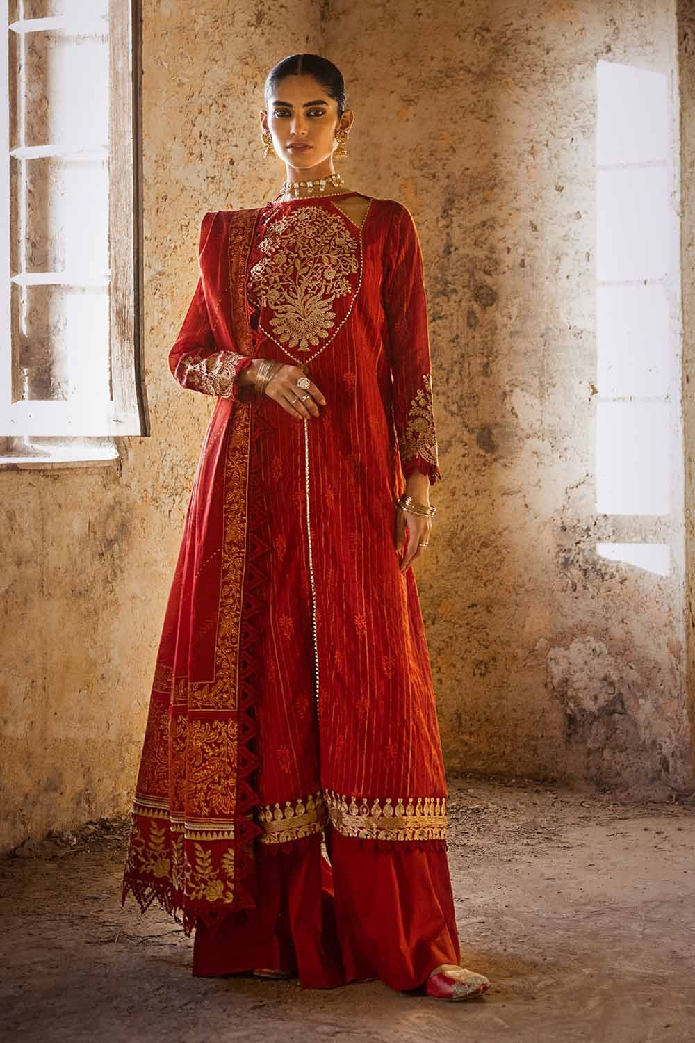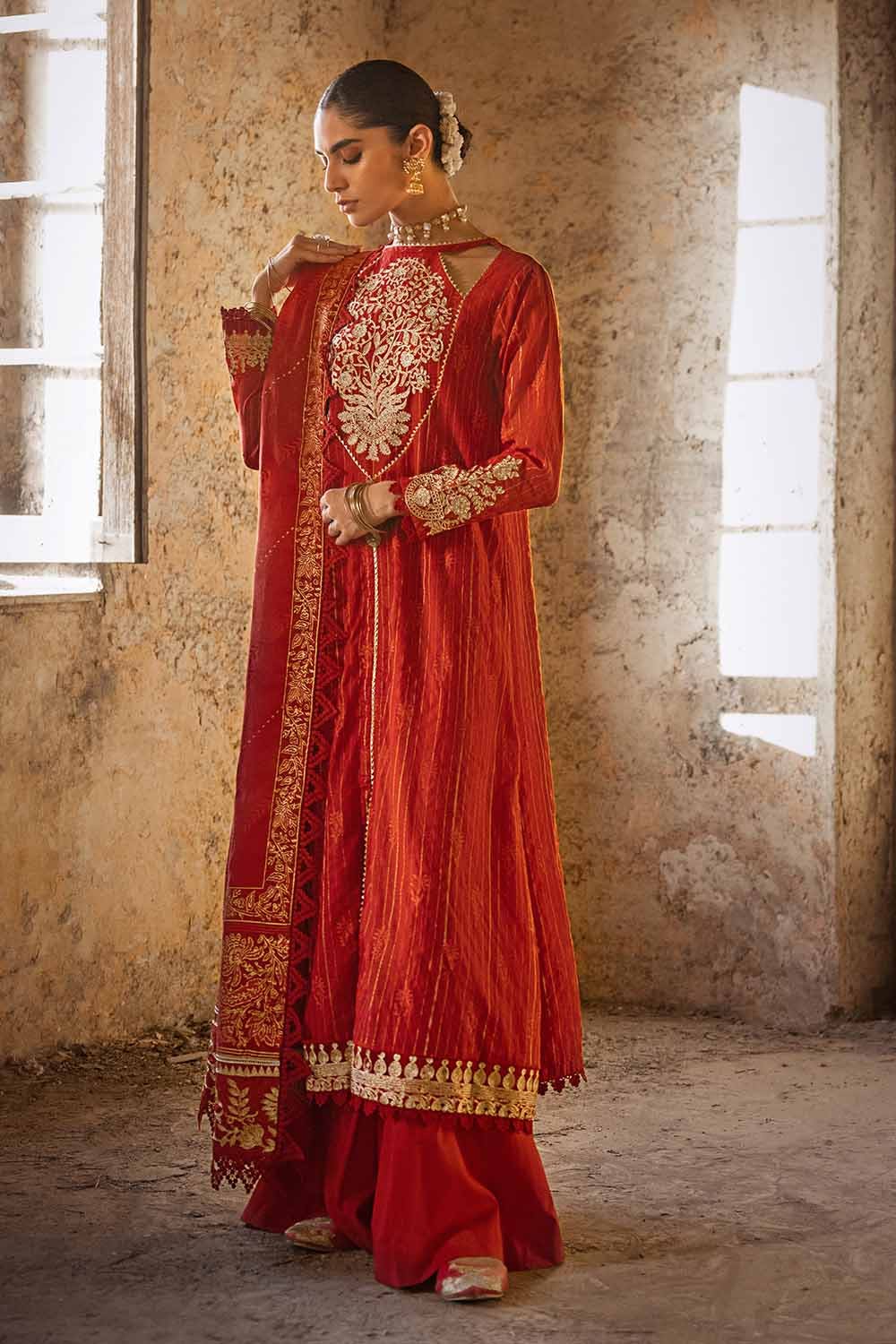 Fabric: Gold & Lacquer Printed Mehsuri Dupatta with Embroidered Mehsuri Border – 2.25 meters Embroidered Lacquer Printed Zari Stripe Shirt Front & Sleeves with Embroidered Border on Organza & Lacquer Printed Back – 3.05 meters Trouser -- 2.50 meters Dyed Inner – 1.50 meters |