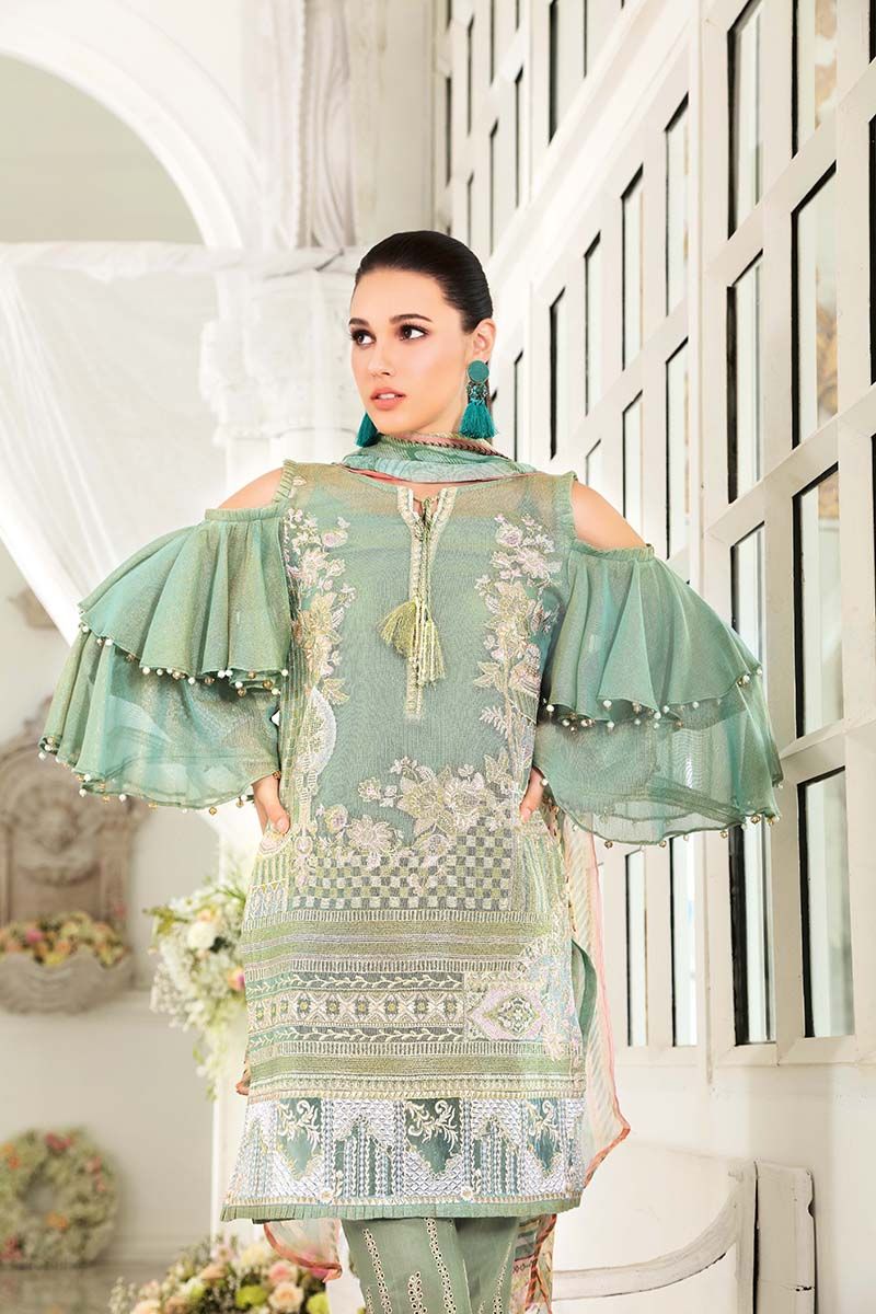 Fabric: Digital Printed Blended Chiffon Dupatta – 2.5 meters Embroidered Zari Net Shirt – 3.15 meters Dyed Inner – 2.25 meters Laces – 3 meters Tassel String – 1 piece Embroidered Motif – 1 piece Embroidered Bottom – 1.65 meters |