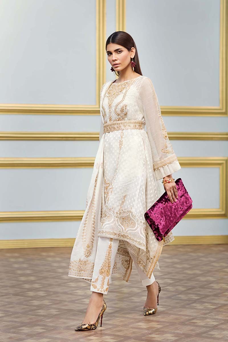 Fabric: Printed Dobby Dupatta – 2.5 meters Embroidered Organza Jacquard Front Shirt – 2.65 meters Dyed Inner – 2.25 meters Embroidered Laces – 5.5 meters Bunches – 4 pieces Dyed Bottom – 1.5 meters |