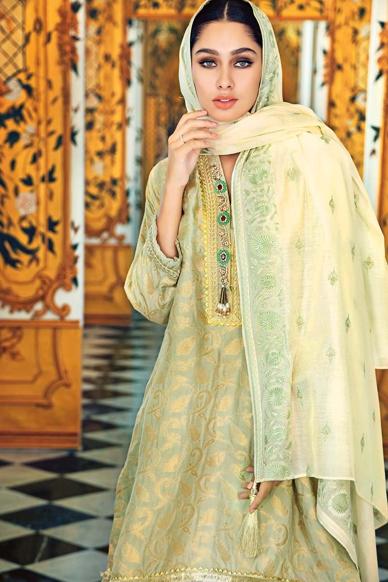 Fabric: Embroidered Silk Net Dupatta with Tassels – 2.5 meters Cotton Net Jacquard Shirt – 3.5 meters Lace – 7.5 meters Embroidered Neckline – 1 piece Tassels String – 5 pieces Bottom – 1.65 meters |