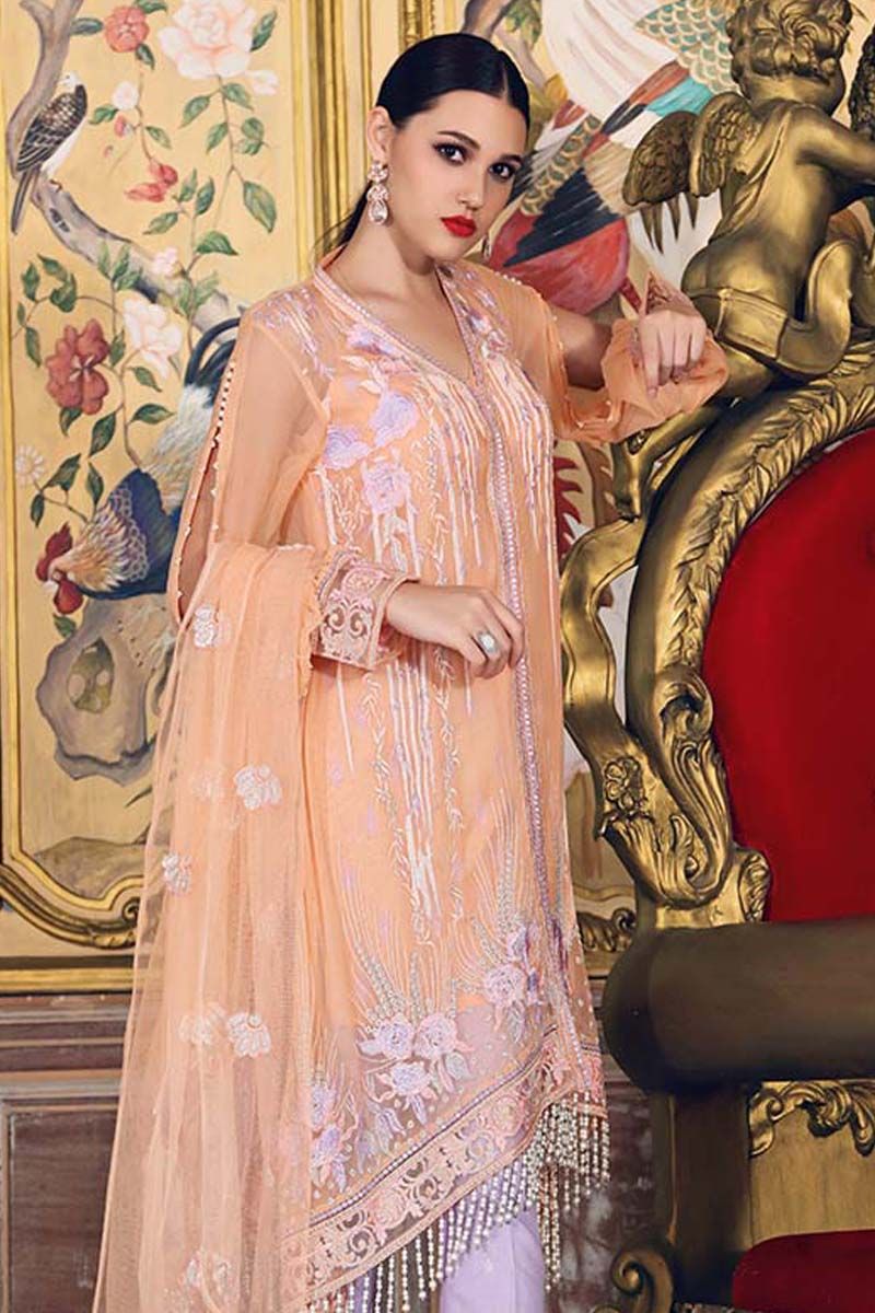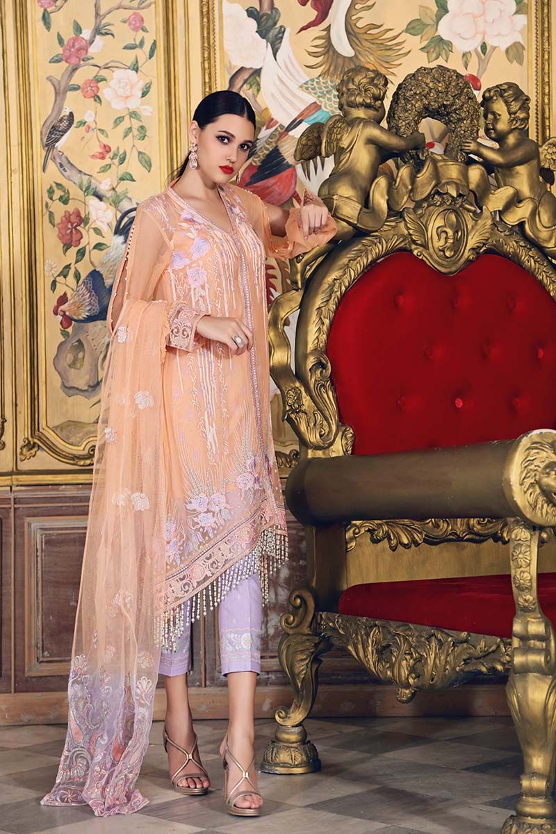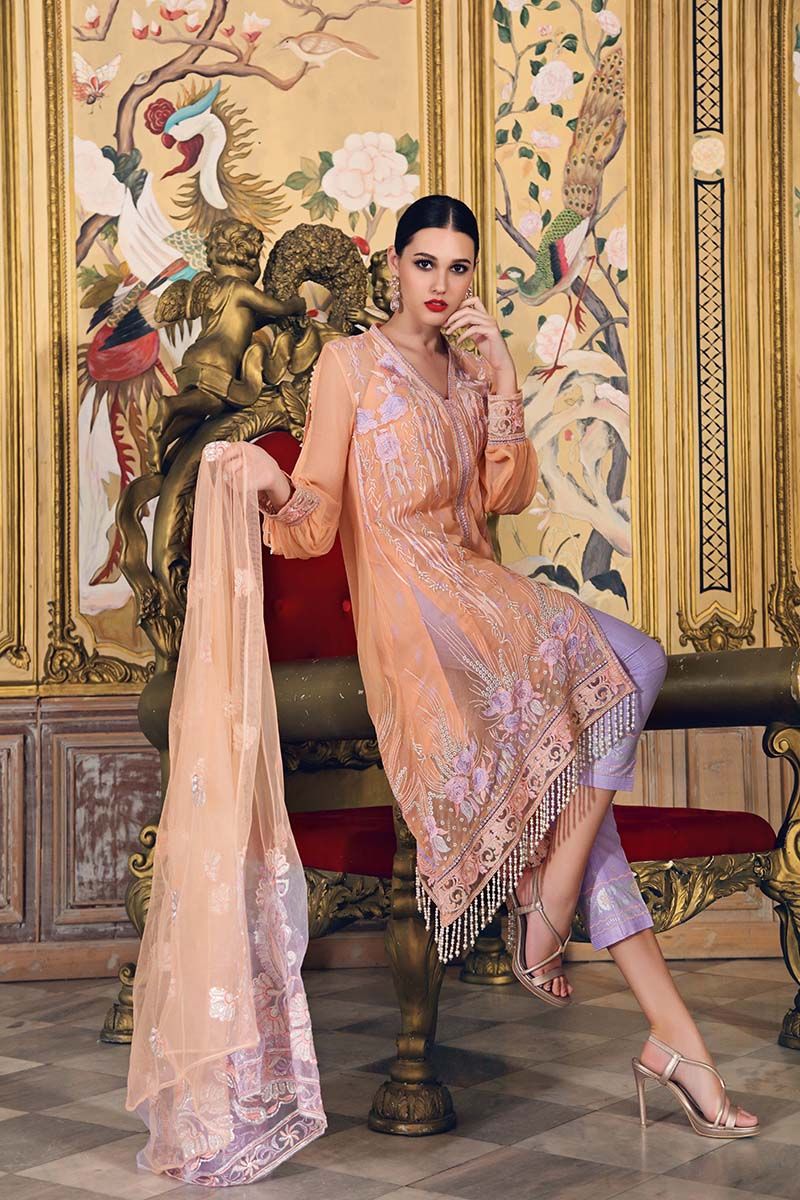 Fabric: Embroidered Net Dupatta with Sequins – 2.5 meters Embroidered Blended Chiffon Shirt – 2.75 meters Printed Inner – 1. 5 meters Embroidered Lace - 2.5 meters Printed Bottom - 1.5 meters |