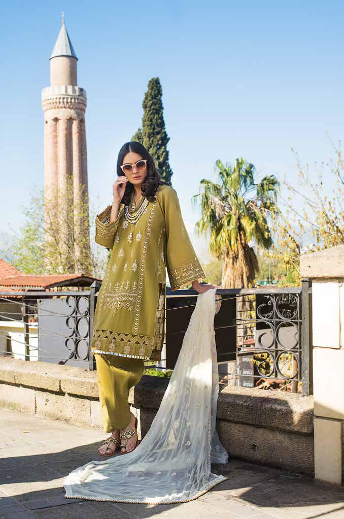 Fabric: Embroidered Chiffon Dupatta With Sequins Gold & Lacquer Printed Shirt With Sequin Embroidered Front & Sleeves Dyed Bottom. |