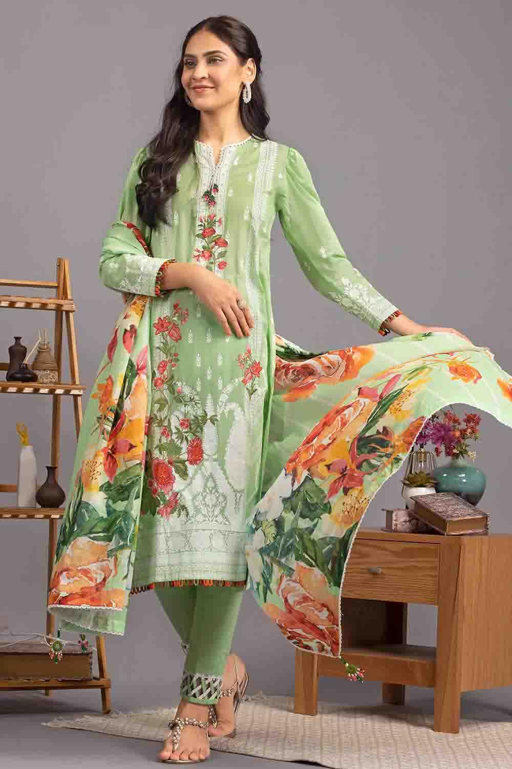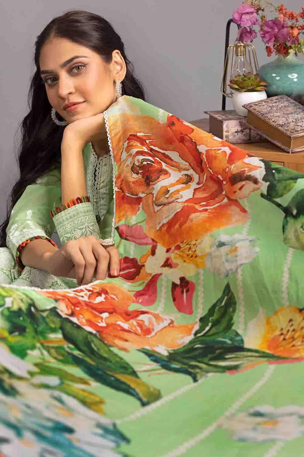 Fabric: Digital Printed Denting Lawn Dupatta – 2.5 meters Embroidered Lacquer Printed Front with Lacquer Printed Back & Sleeves – 1.75 meters Dyed Trouser – 1.75 meters |