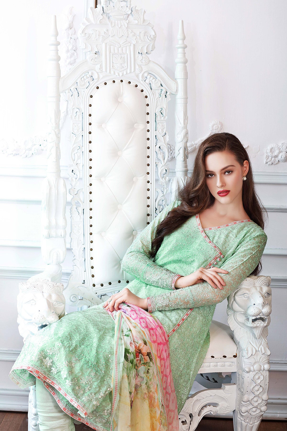 Fabric: Embroidered Silk Chiffon Shirt Front Back Sleeves Embroidered Laces Digital Printed Blended Chiffon Dupatta Dyed Inner & Bottom 3 Pc Dress |