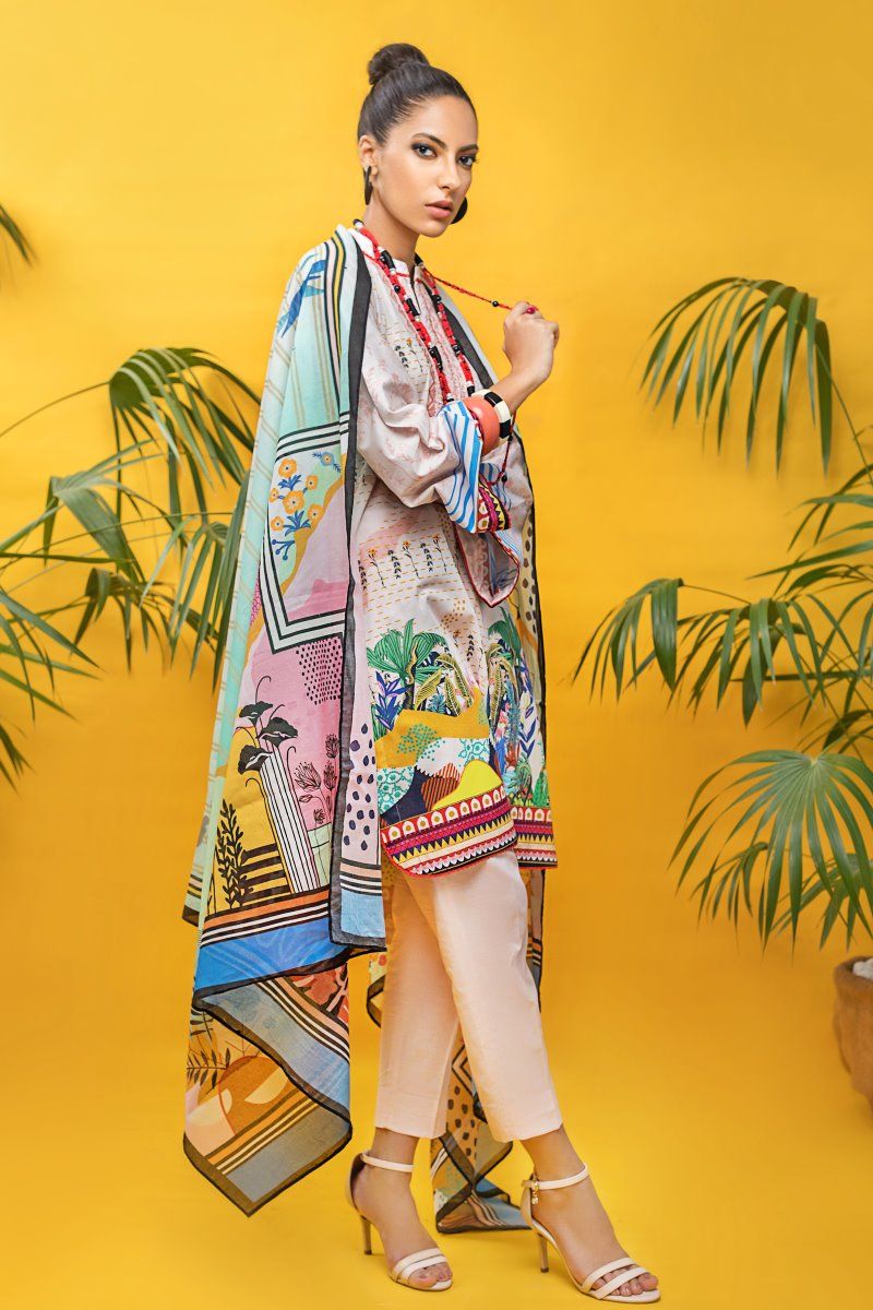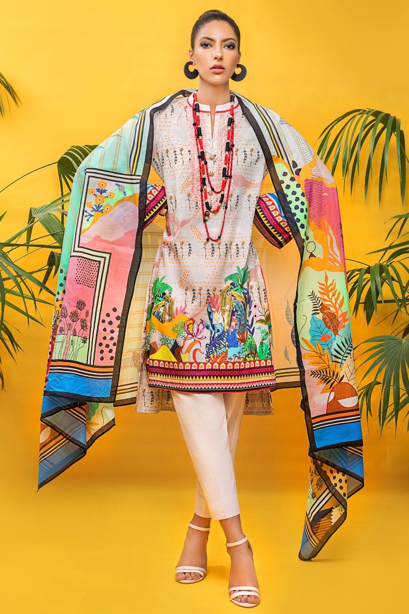 Fabric: Digital Printed Lawn Dupatta – 2.5 meters Digital Printed Cambric Shirt with Embroidered Neckline on Organza – 1.7 meters |