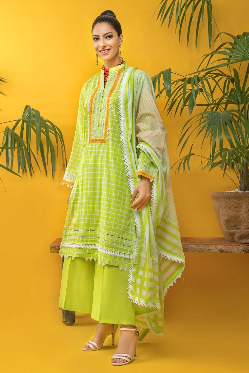 Fabric: Lacquer Printed Lawn Dupatta – 2.5 meters Printed Cambric Shirt with Embroidered Neckline & Border for Sleeves on Organza – 1.75 meters Dyed Cambric Trouser – 2.5 meters |