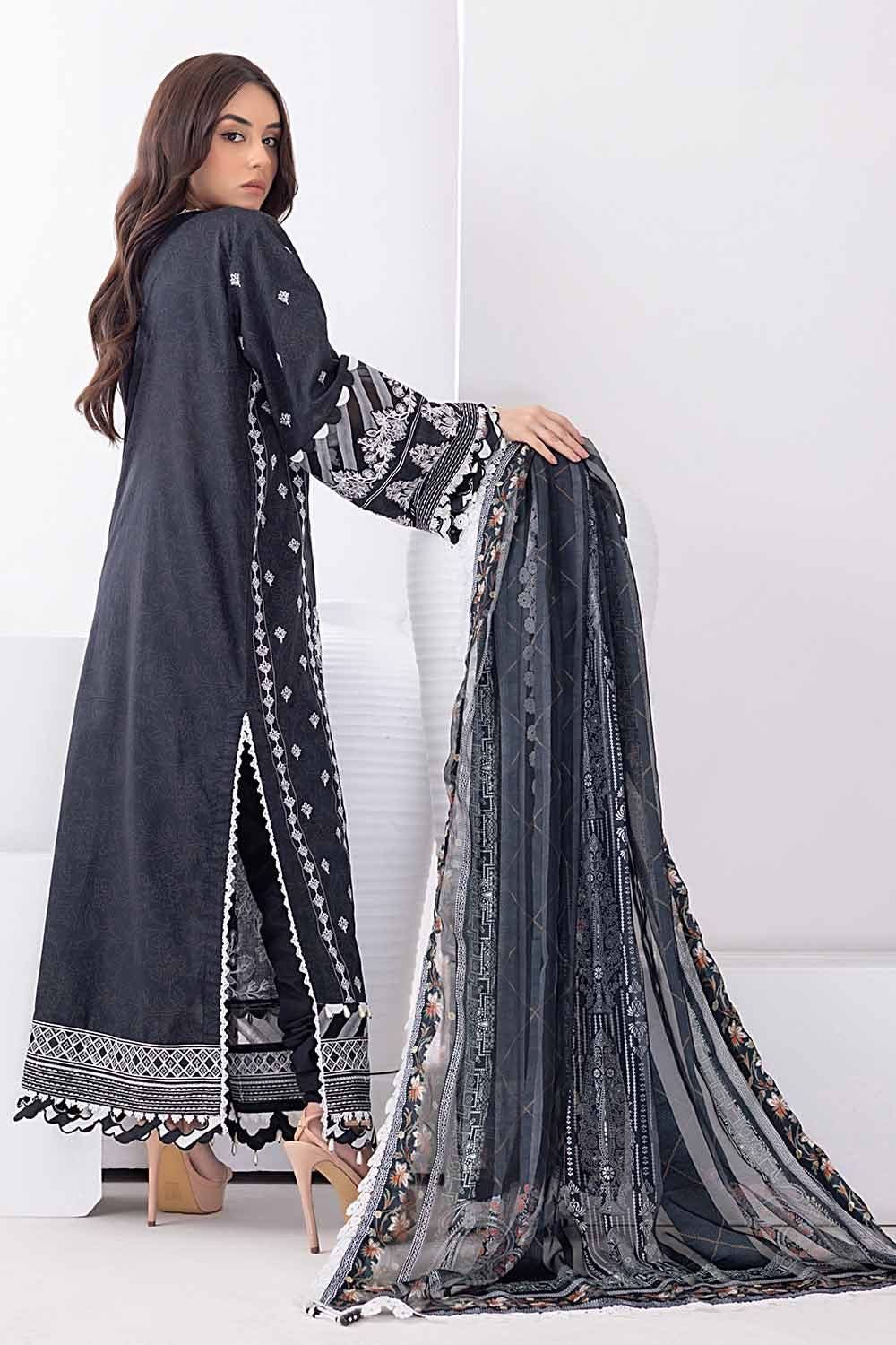 Fabric: Digital Printed Dobby Silk Dupatta – 2.50 meters Embroidered Printed Lawn Shirt Front & Sleeves with Embroidered Border For Front & Back, Printed Lawn Back – 3.20 meters Dyed Trouser – 2.50 meters |
