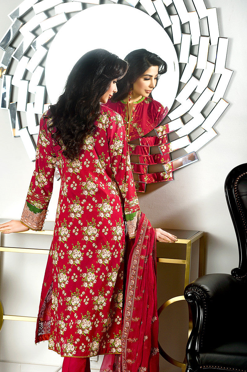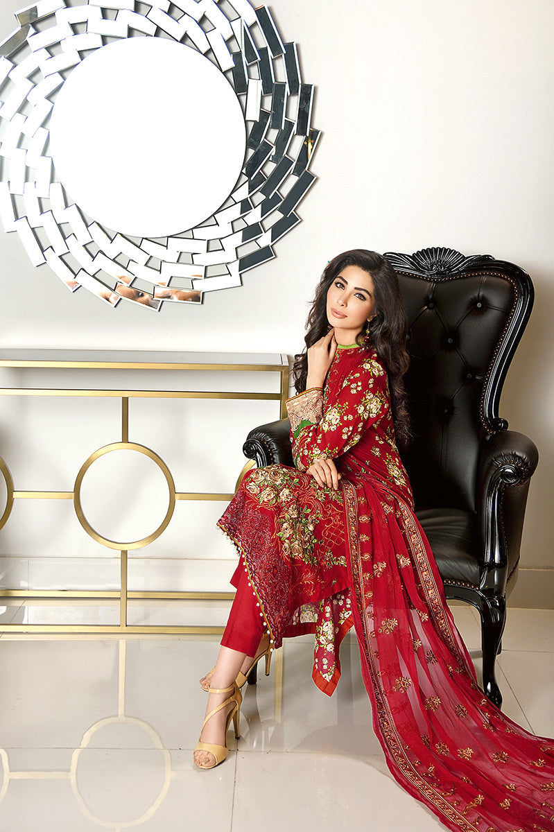 | Fabric | Embroidered Front - 1.25 meters Printed Back & Sleeves - 2.25 meters Embroidered Lace - 1 meter Embroidered Chiffon Dupatta - 2.5 meters Dyed Shalwar - 2.5 meters |