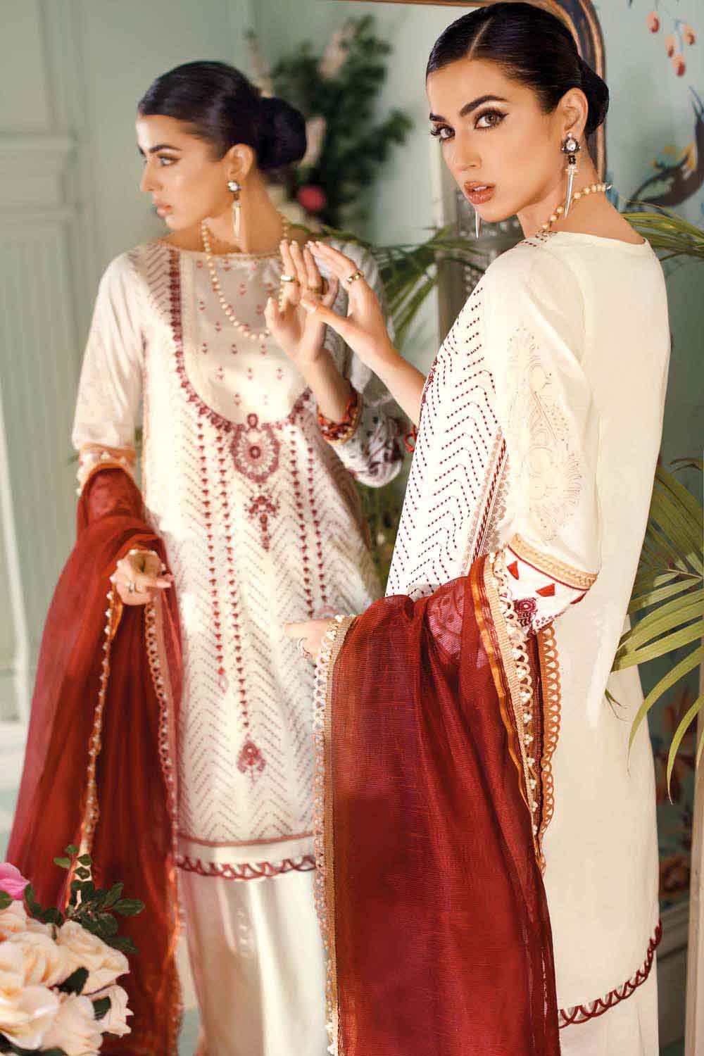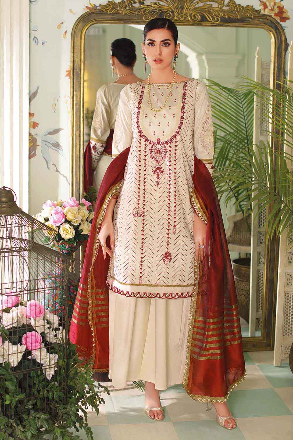 Fabric: Jacquard Dupatta - 2.5 Meters Embroidered Lawn Front & Sleeves – 1.95 Dyed Lawn Back – 1.2 Dyed Trouser - 1.75 Meters. |
