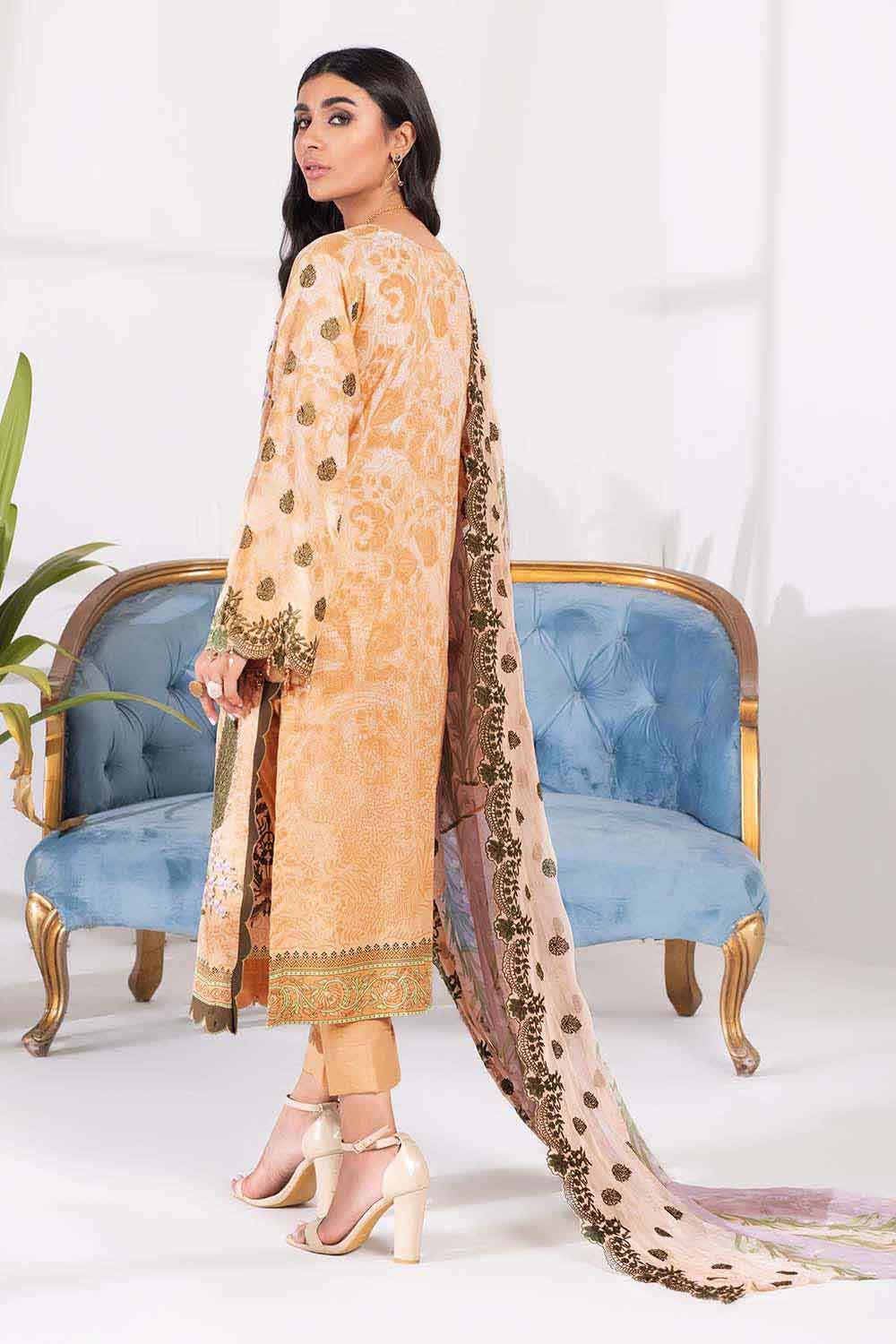 Fabric: Digital Printed Embroidered Chiffon Dupatta - 2.5 Meters Printed Lawn Shirt Front, Shirt Back, Sleeves with Embroidery on Front & Sleeves – 3 Meters Dyed Trouser - 1.75 Meters. |