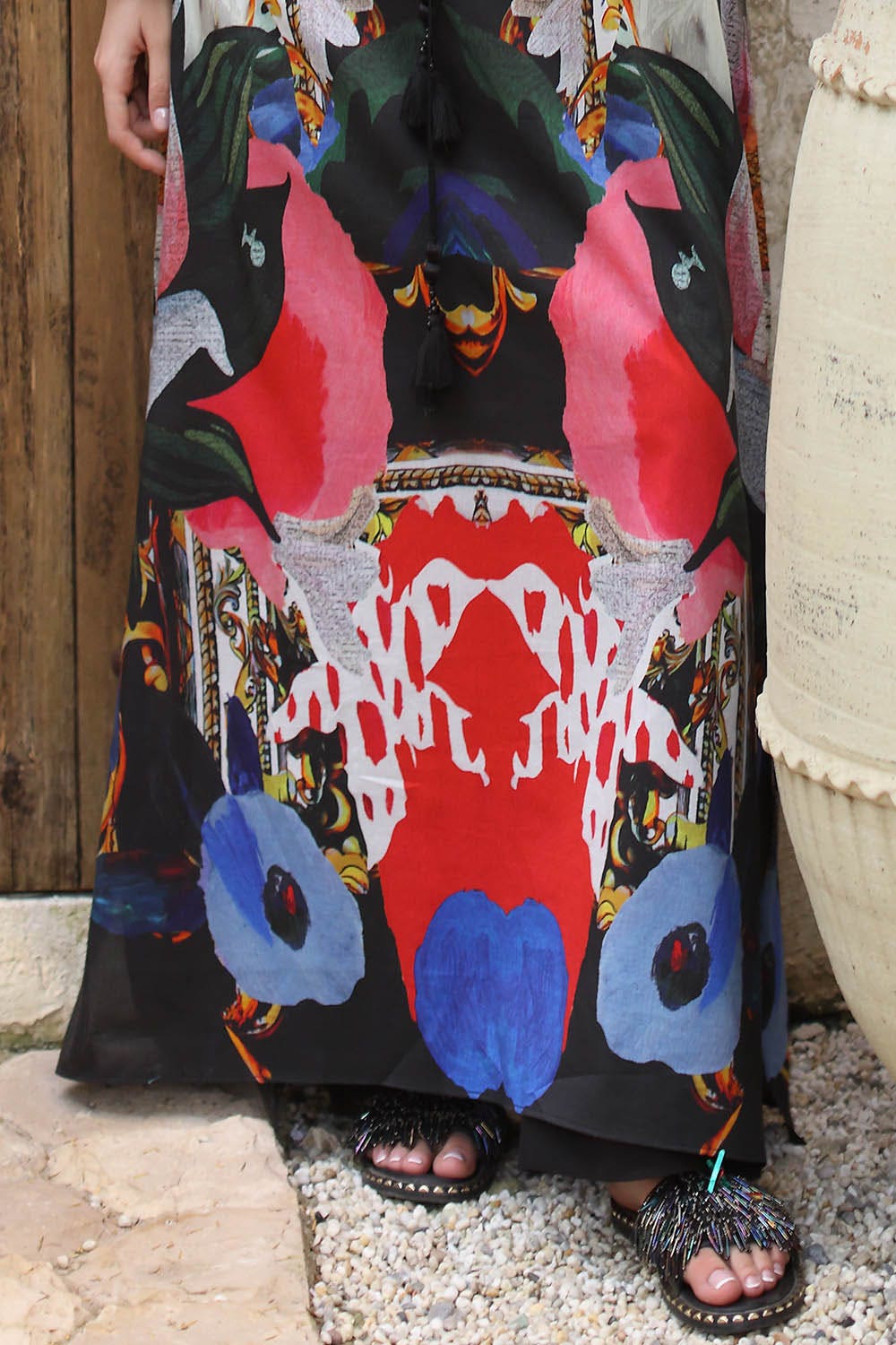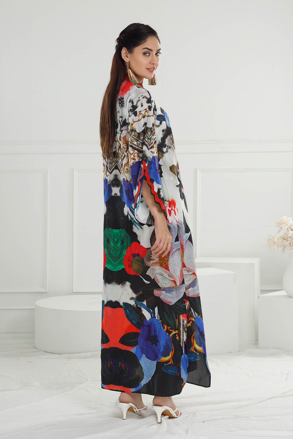 Summary: Introducing the Gul Ahmed Cotton Silk Kaftan KFN-52002, a stunning representation of summer style and comfort. This one-piece unstitched kaftan offers a generous 2.5 meters of premium printed cotton silk fabric, giving you the freedom to design a unique outfit tailored to your preferences. The kaftan showcases a striking multicolored print on a black base, featuring a vibrant mix of colors including pink, red, blue, white, and more, artistically combined to create a mesmerizing visual narrative. This flowing silhouette ensures breathability and comfort during the summer months. The fabric features a luxuriously smooth texture with a touch of sheen from the silk component, further enhancing its aesthetic appeal. Being unstitched, this kaftan lets you personalize the fit and neckline to your liking, making it a truly versatile piece for your wardrobe. Whether you prefer a casual or slightly more dressed-up look, this kaftan is effortlessly adaptable. Perfect for daily wear during the warm season, this Gul Ahmed creation empowers you to express your unique fashion sense while staying comfortable all day long. It's an exquisite blend of traditional aesthetics and modern design sensibilities, making it a must-have for the contemporary woman. Experience the joy of summer with this vibrant and versatile cotton silk kaftan – a piece that is sure to turn heads.