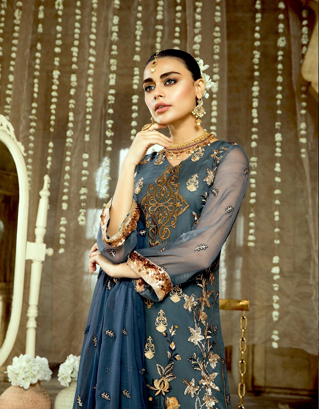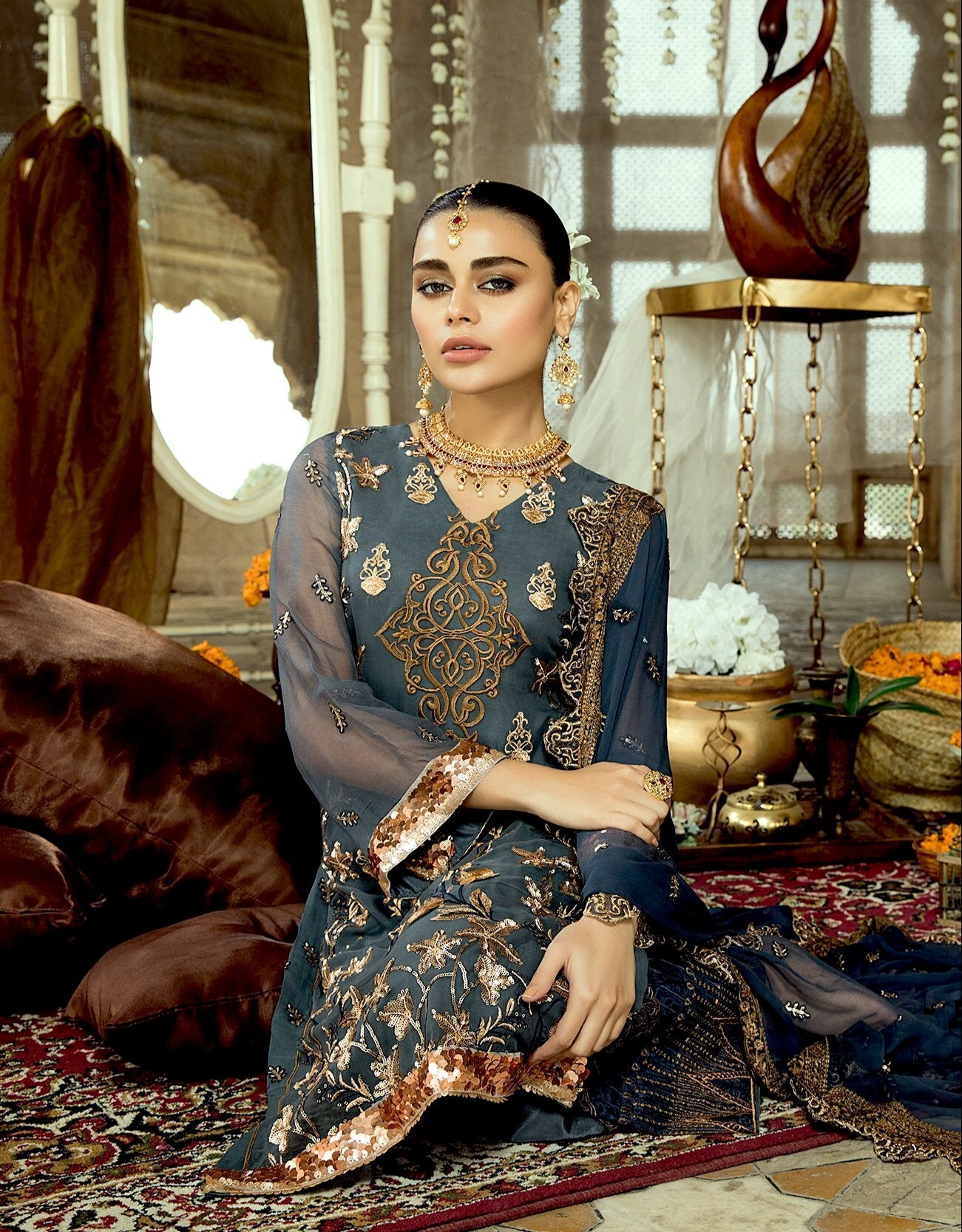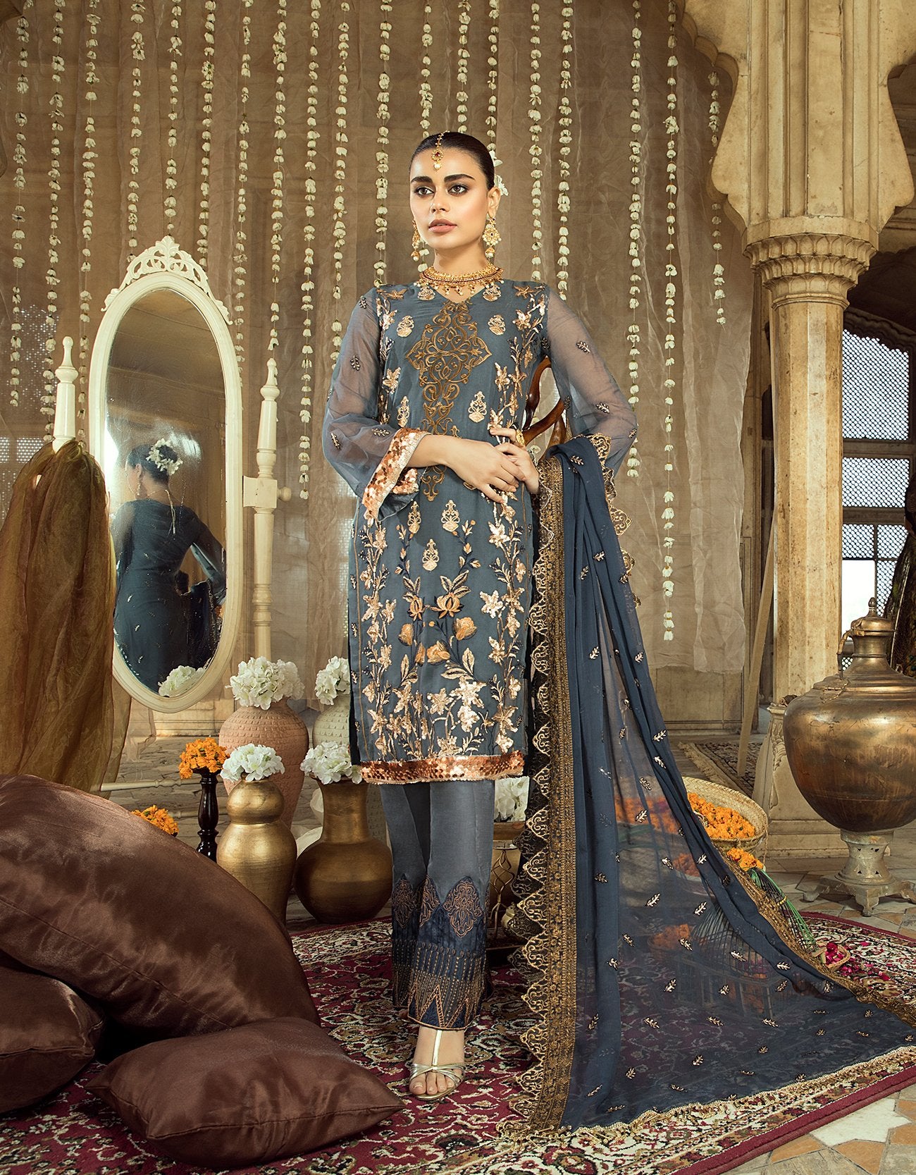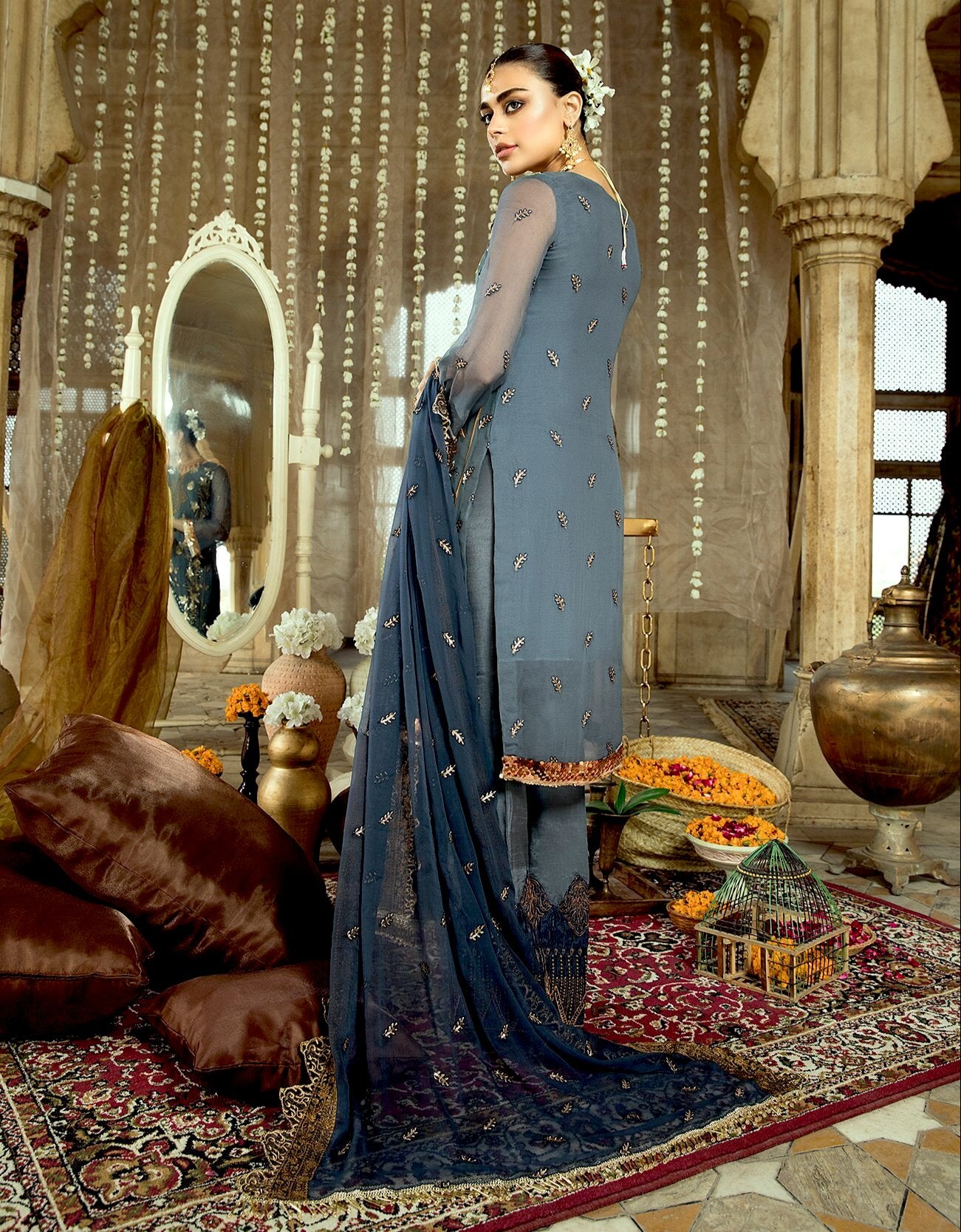 Fabric: Shirt Front: Embroidered Chiffon Shirt Back: Embroidered Chiffon Sleeves: Embroidered Chiffon Dupatta: Embroidered Chiffon Front & Back Lace: Embroidered Organza Trouser: Dyed Raw Silk Trouser Lace: Embroidered Organza Extra Chiffon Panel for shirt |