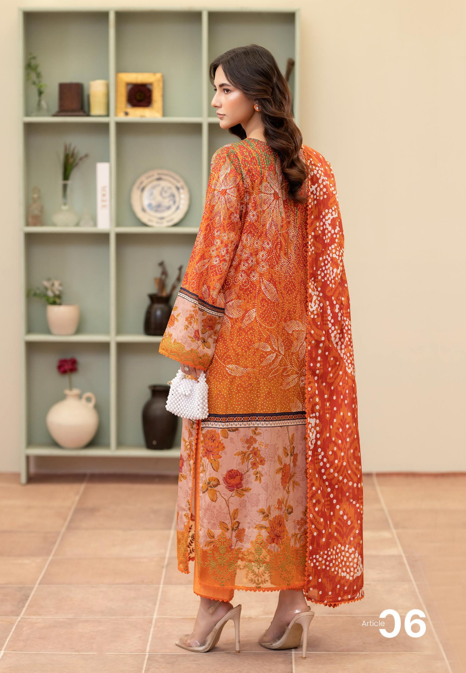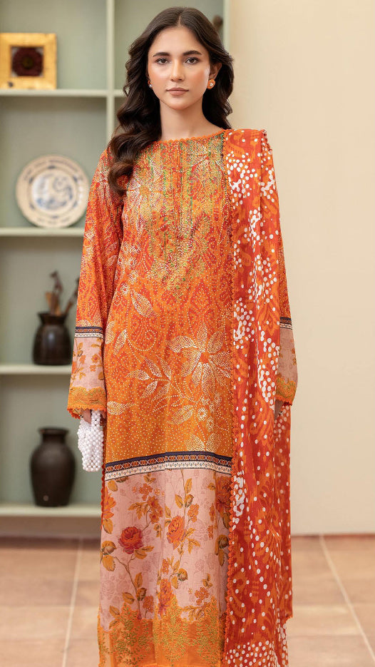 Fabric: Front: Digital Printed Lawn Embroidered Neck Daman Lace: Same Organza Embroidered Back: Digital Printed lawn Sleeves: Digital Printed lawn Sleeves Lace: Same Organza Embroidered Duppata: Digital Printed Pure Lawn Trouser: Dyed Cambric Cotton |
