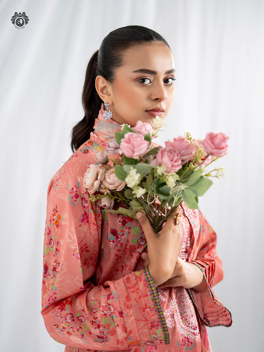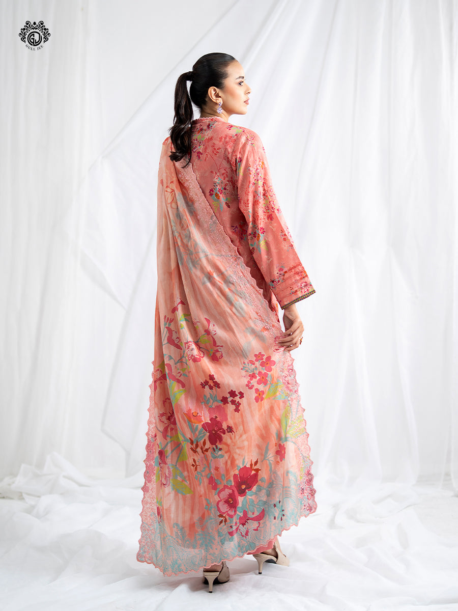 Summary: Radiate summer charm in this exquisite Peach Pakistani Lawn Suit from the GullJee Rang-e-Haya collection. The main kameez is crafted from breathable digital printed lawn, highlighted by a delicate embroidered neckline and intricate organza lace details that define sophistication. Its warm peach hue is adorned with vibrant floral motifs, making it a perfect choice for the season. The ensemble features a stunning cut-work embroidered lawn dupatta that adds a layer of festive luxury, suitable for Eid or daytime parties. This unstitched dress material blends comfort with high fashion, offering a versatile option for your ethnic wardrobe. Shop this stylish Pakistani dress for an effortless summer look.