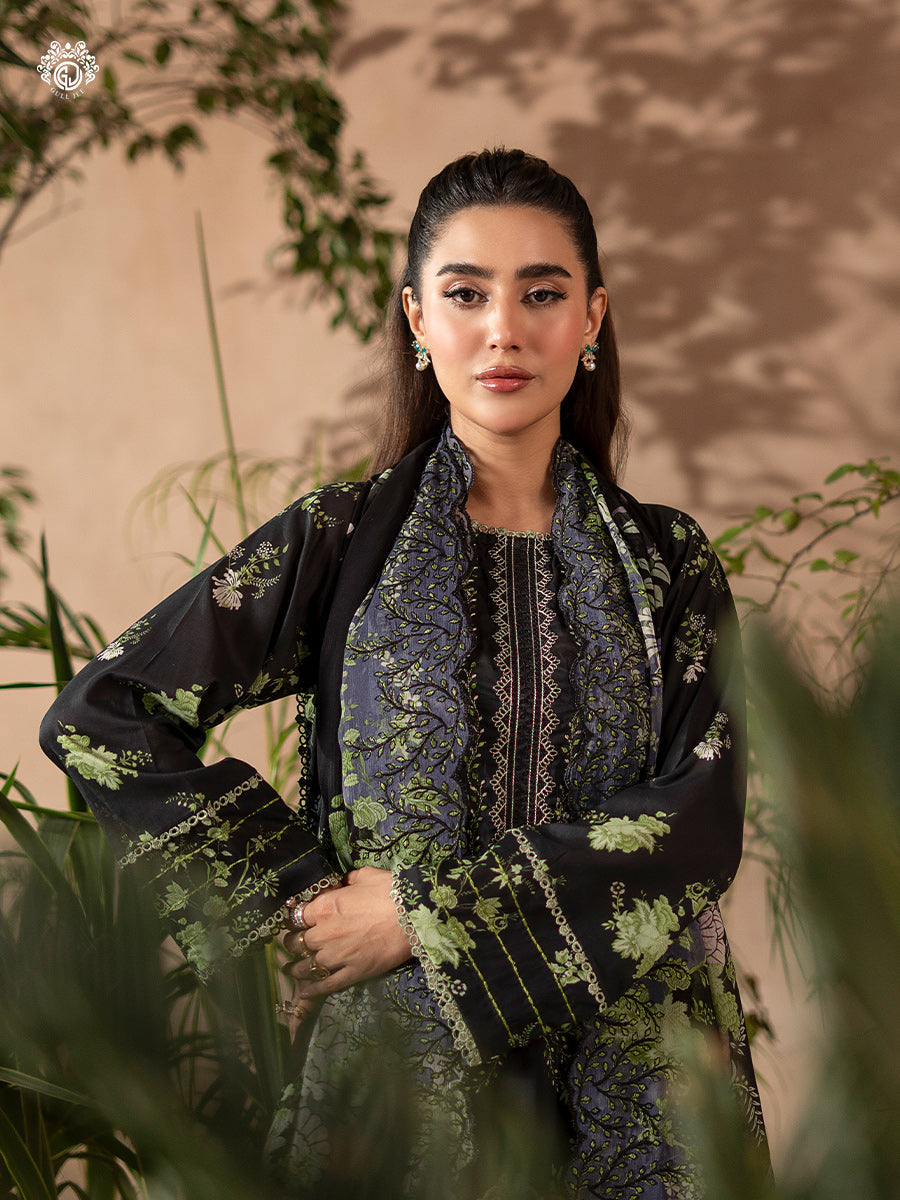 Summary: Discover elegance with this stunning black Pakistani suit from GullJee's Rang Pasand collection. Crafted from premium lawn, this unstitched dress material is perfect for the Spring/Summer season. The kameez features a sophisticated digital print across the front, back, and sleeves, beautifully contrasted by an intricately embroidered neckline. This ethnic wear masterpiece offers a blend of comfort and style, making it a versatile summer outfit. The deep black hue provides a classic backdrop for the vibrant print, creating a look of understated luxury. Ideal for evening parties or festive gatherings, this Pakistani lawn dress promises a graceful silhouette.