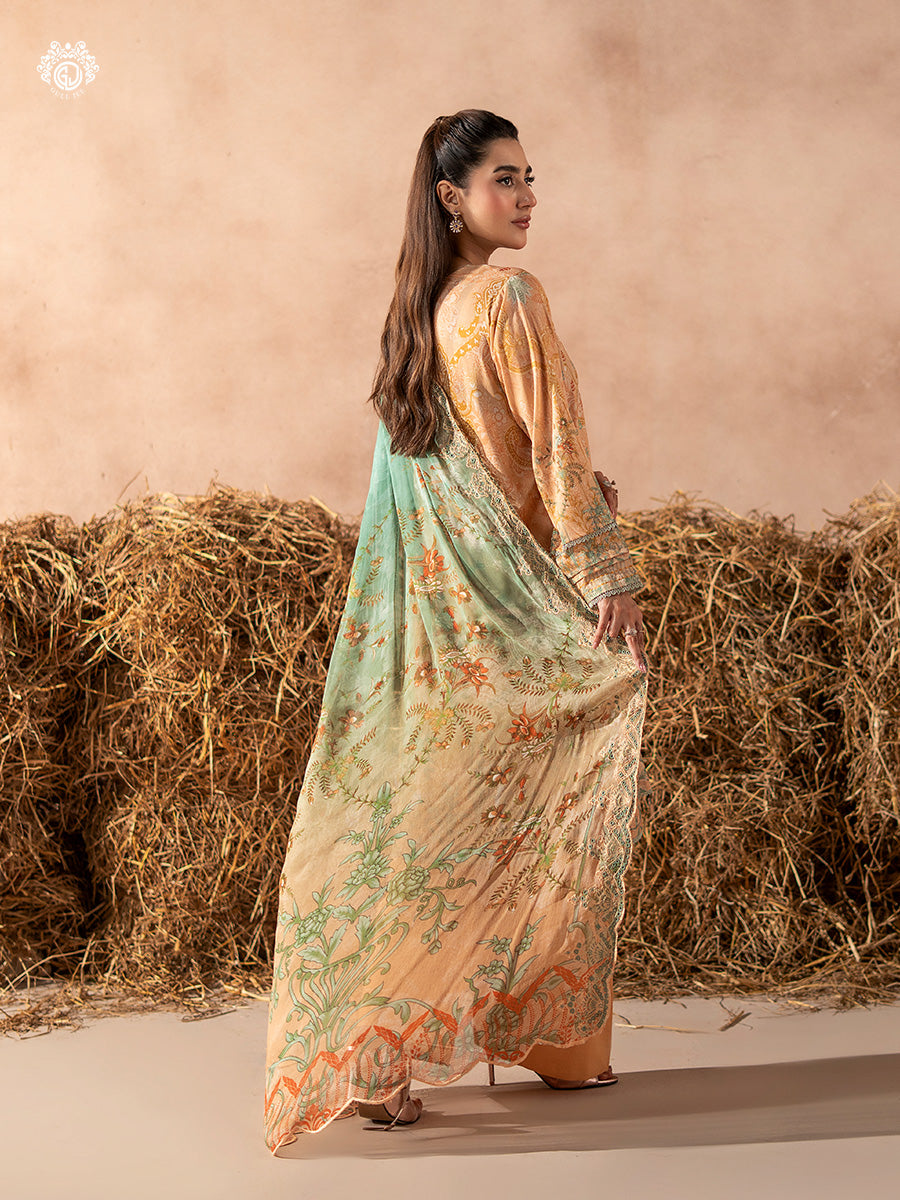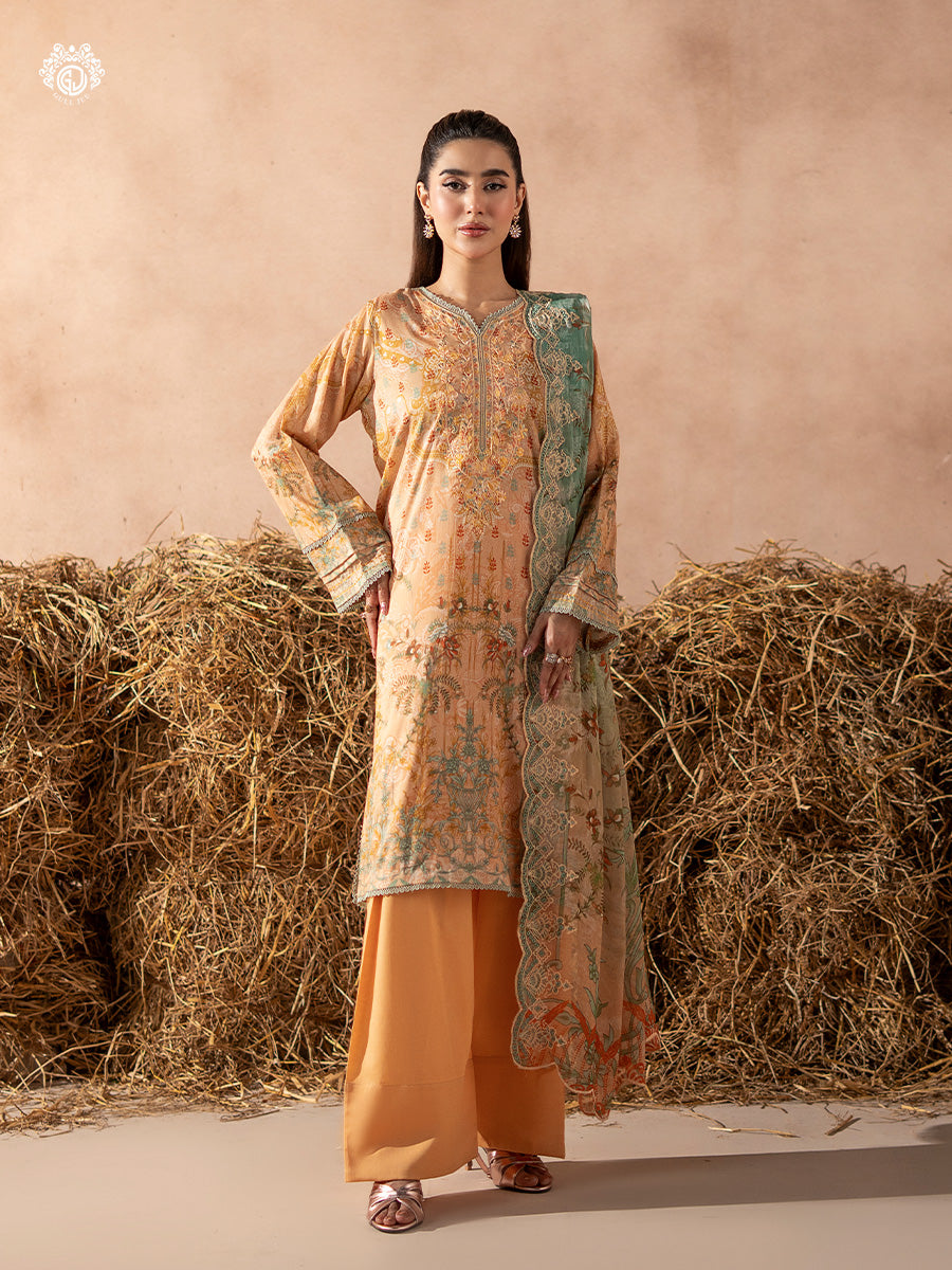 Summary: Embrace the elegance of summer with this stunning GullJee Rang Pasand Pakistani Suit. The ensemble features a beautiful peach-toned kameez crafted from premium, breathable lawn fabric, making it a perfect choice for the Spring/Summer season. The shirt is adorned with intricate digital prints and a finely embroidered neckline, adding a touch of sophistication. This unstitched Pakistani Lawn Dress offers a graceful silhouette, ideal for festive gatherings and formal day events. Its delicate aesthetic makes it a standout piece of ethnic wear, perfect for celebrating Eid or attending a summer soiree with poise and style.