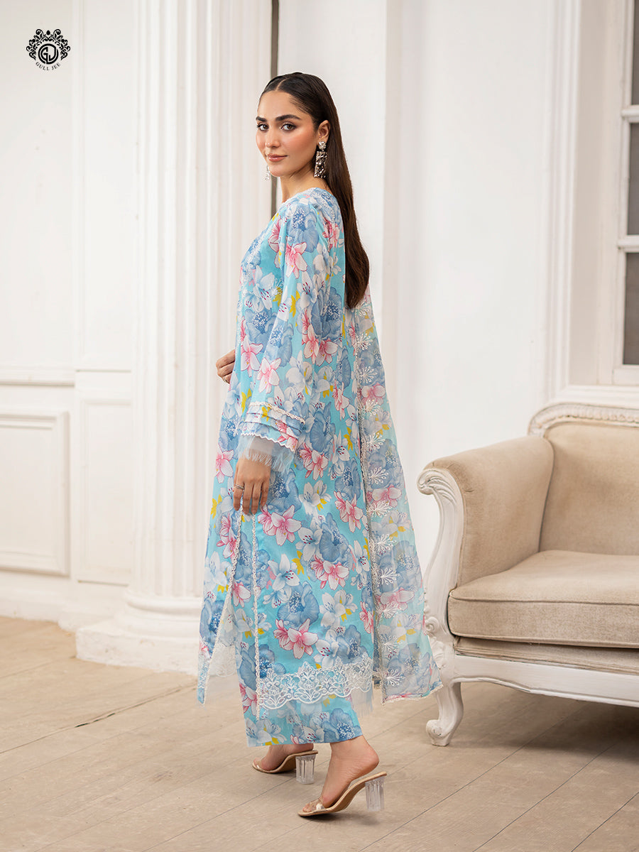 Summary: Step into grace with the GullJee Ziva collection's stunning Pakistani suit. The kameez, in a calming shade of blue, is crafted from premium digital printed lawn, making it an exceptionally breathable and comfortable summer outfit. This ethnic wear is adorned with intricate organza embroidery on the neckline and front lace, lending it a touch of formal elegance. As a quintessential Pakistani Lawn dress for the Spring/Summer season, its vibrant floral print makes it a standout piece. This festive clothing is an ideal choice for Eid celebrations, daytime parties, or semi-formal gatherings.