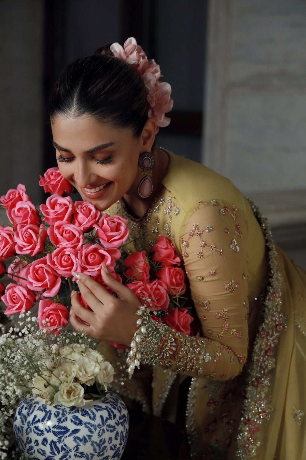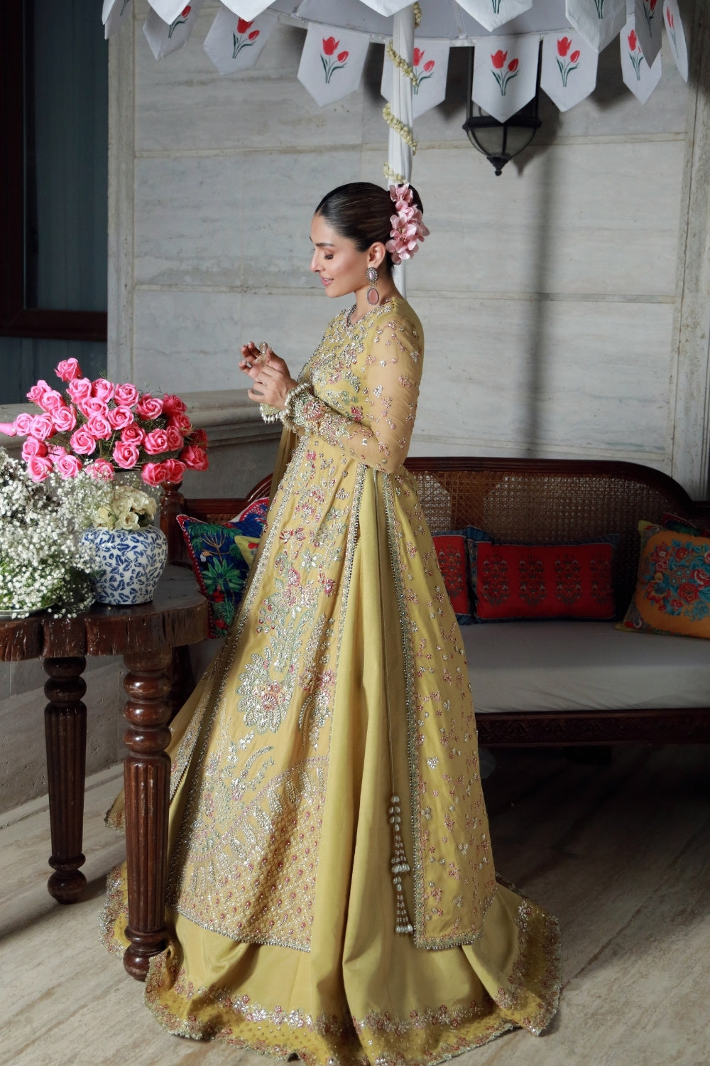 Summary: Embrace timeless elegance with the Gulmina Ayeza luxury formal Pakistani suit. This exquisite ensemble is presented in a sophisticated olive hue, crafted from premium chiffon, making it a perfect choice for spring and summer festivities. The kameez is a masterpiece of design, featuring extensive hand-embellished embroidery across the front body, panels, and sleeves. Its regal aesthetic and rich color make it an ideal outfit for wedding guests, particularly for Mehndi or Mayun events. This unstitched ethnic wear allows for custom tailoring, ensuring a flawless fit for any grand occasion.