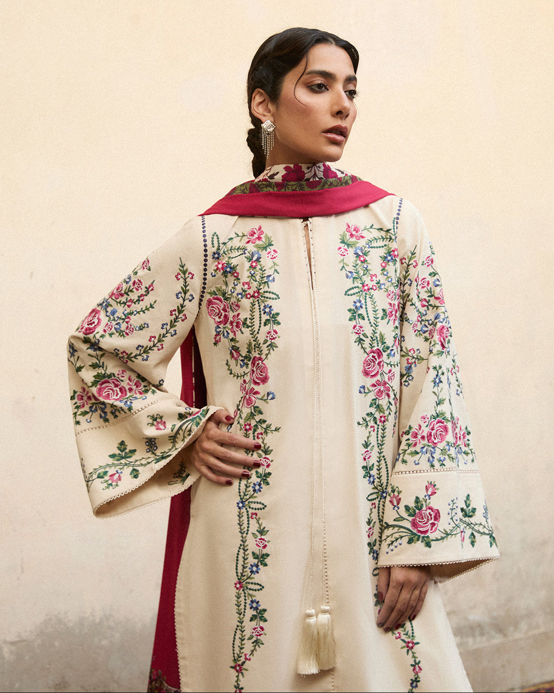 Summary: Embrace timeless elegance with this exquisite cream Pakistani suit from the Hussain Rehar Winter Edit. The kameez is crafted from premium Karandi fabric, renowned for its textured feel and warmth, making it perfect for the Fall/Winter season. This stunning shirt features intricate multicolor floral embroidery artfully placed along the front and flared sleeves, showcasing meticulous craftsmanship. The classic ivory-cream hue serves as a beautiful canvas for the vibrant threadwork, making this ethnic wear piece a standout for formal events, festive celebrations, or as a sophisticated wedding guest outfit. This unstitched formal wear is ideal for creating a bespoke look.