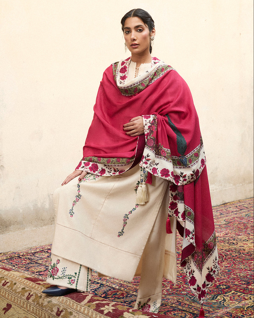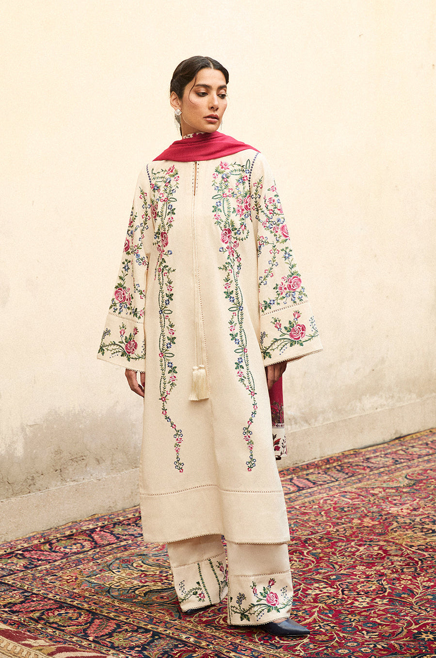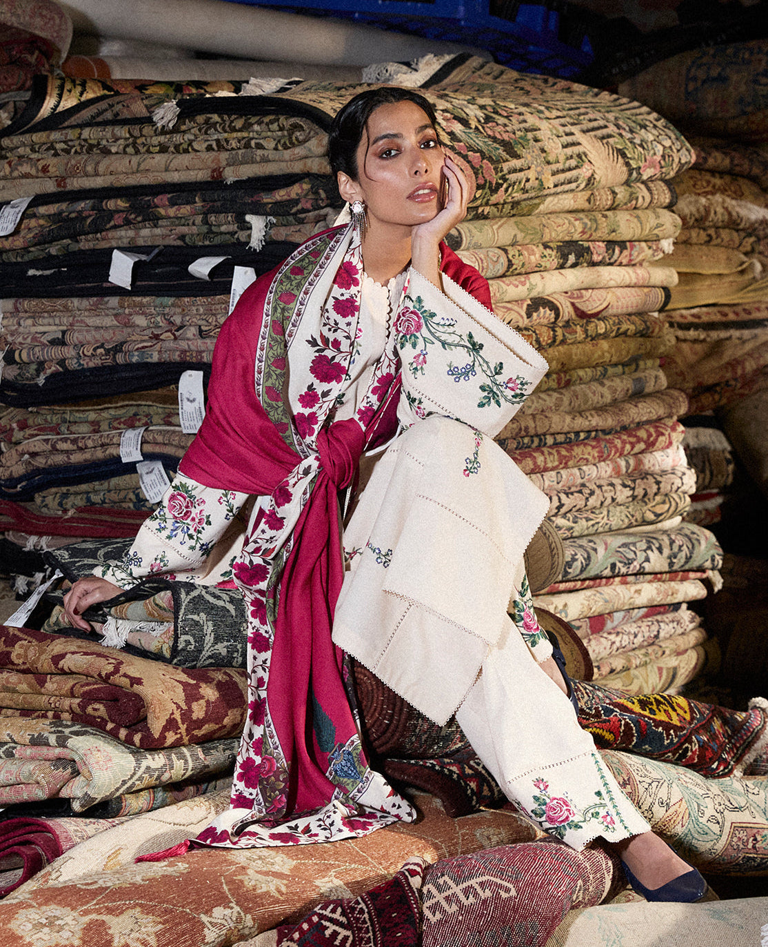 Fabric: Color: Ivory Fabric: Karandi Shirt & Trouser, Poly wool Shawl Package Includes: Shirt, Trouser & Shawl. 3pc Description: This classic ivory ensemble showcases intricate multicolor floral embroidery across the shirt, sleeves, and trousers, highlighting meticulous craftsmanship. A printed poly wool shawl drapes gracefully, adding texture and depth, completing a refined and cohesive traditional look that exudes timeless elegance. Fabric Details in Meters: (Unstitched): Digital Printed Shawl (Wool) 2.5 Meters Embroidered Front Right Panel (Karandi) 1 Piece Embroidered Front Left Panel (Karandi) 1 Piece Dyed Front Side Extension Panel & Back (karandi) 1.12 Meters Embroidered Sleeve Right & Left Panel (Karandi) 4 Pieces Embroidered Sleeve & Trouser Border (Karandi) 2.55 Meters Embroidered Arm Hole Border (Karandi) 1.3 Meters Dyed Trouser (Karandi) 2 Meters |