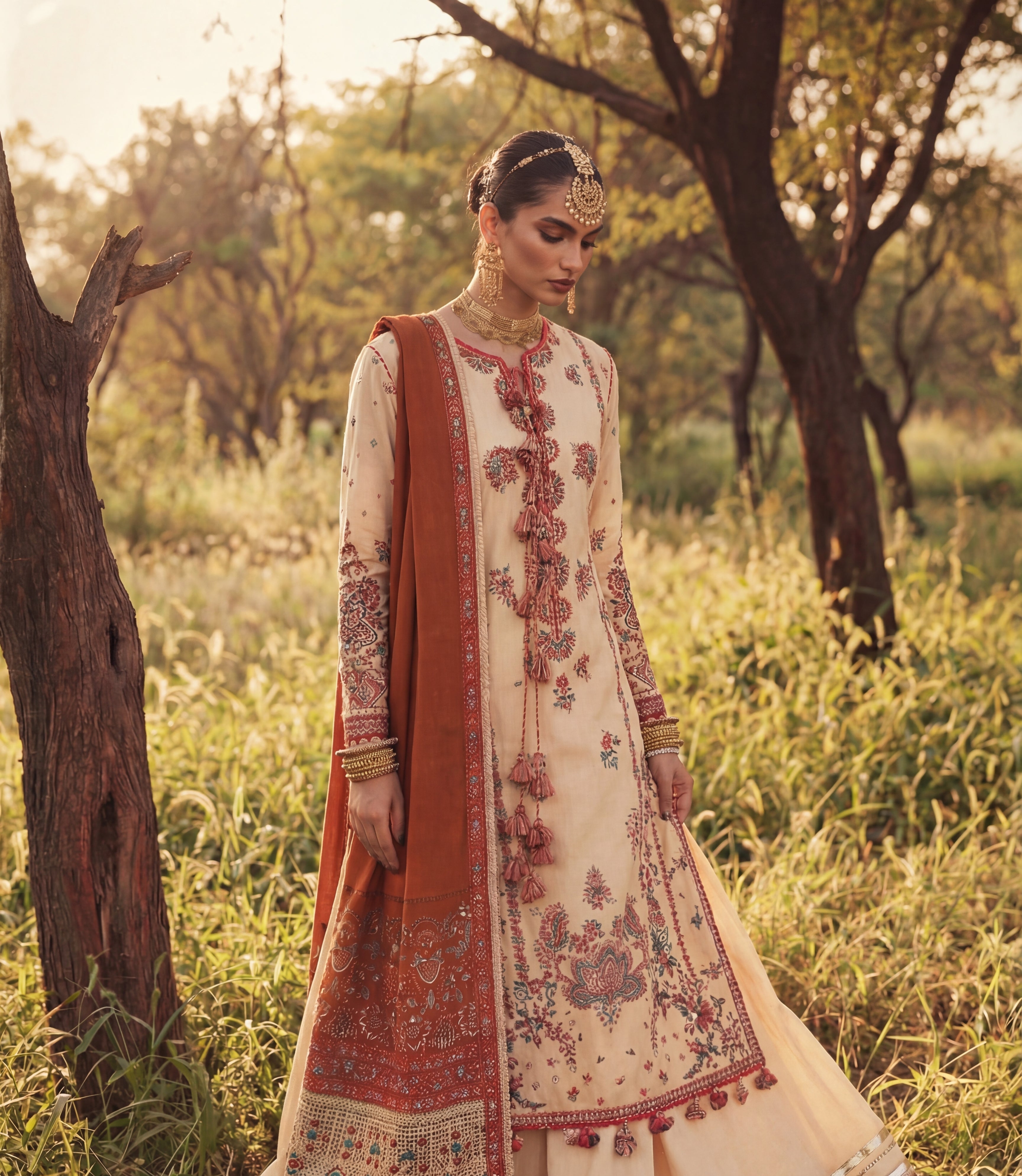 Fabric: Colour: Beige Product Description: A vision of subtle sophistication, this unstitched beige ensemble redefines the classic karandi silhouette. The shirt is exquisitely rendered with intricate delicate embroidery and borring details. It achieves a striking counterpoint with the rust-colored embroidered karandi shawl, which features an elegant cut-work border in a complementary beige hue. The look is completed by a matching beige shalwar enhanced with tasteful embroidery accents, crafting an outfit designed to inspire effortless grace. Fabric Details: