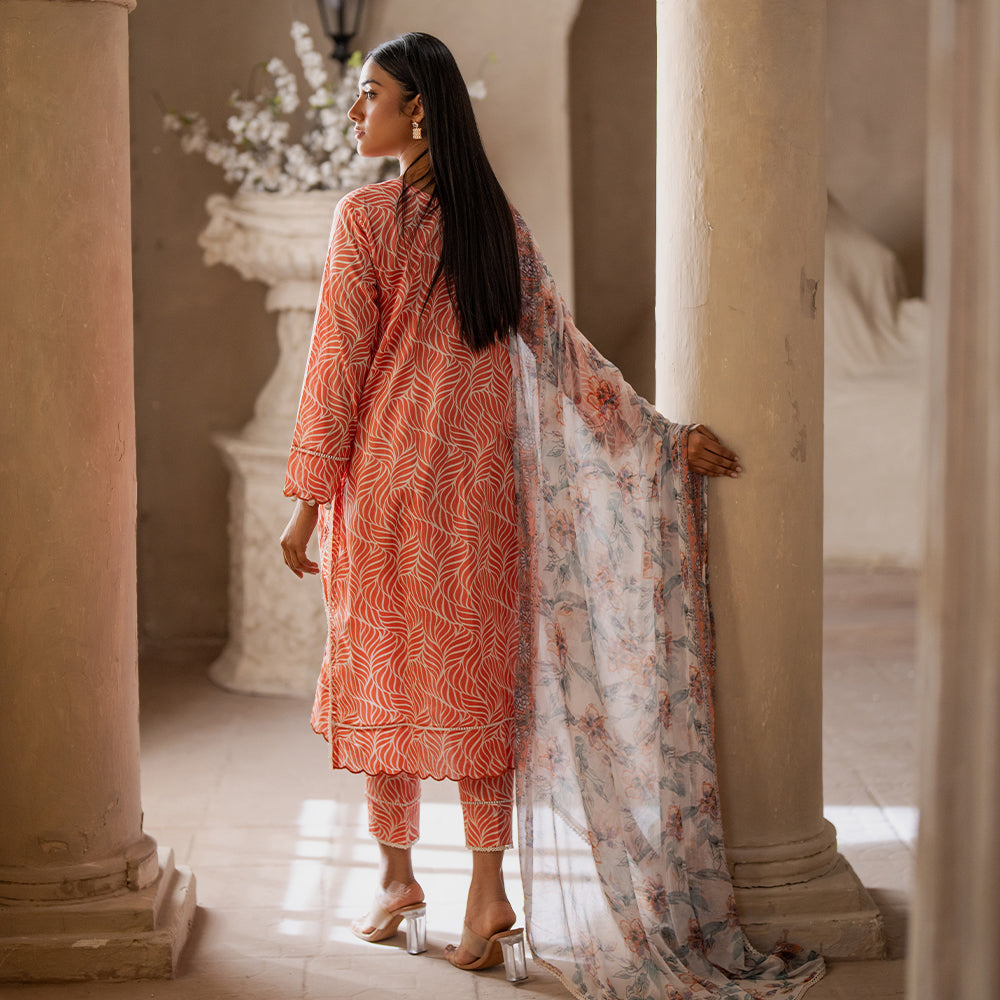 Summary: Introducing the Identic Separates Lawn suit with Chiffon Dupatta (IDSBDV1-6) by Regalia Textiles, a beautiful ensemble perfect for your daily wardrobe. This unstitched three-piece suit features a delicate Peach printed lawn cotton top. The soft, breathable lawn fabric drapes elegantly and ensures comfort throughout the day. The printed pattern adds a touch of elegance to the overall design. Complementing the top is a pair of dyed cotton bottoms, providing a solid base for the vibrant top. The ensemble is completed by a beautifully printed chiffon dupatta, which adds a graceful flow and a pop of color to the outfit. This lightweight and airy dupatta is perfect for adding a touch of elegance to your everyday look. This versatile Pakistani Lawn Suit is ideal for casual outings, daytime events, or simply elevating your daily style. Its unstitched nature allows you to customize the fit and style to your liking, making it a truly personalized piece. Perfect for the Spring/Summer season, this suit is a must-have in every woman's wardrobe. Experience the perfect blend of comfort, style, and elegance with this stunning Pakistani suit. Authenticity Guaranteed - 100% Original.