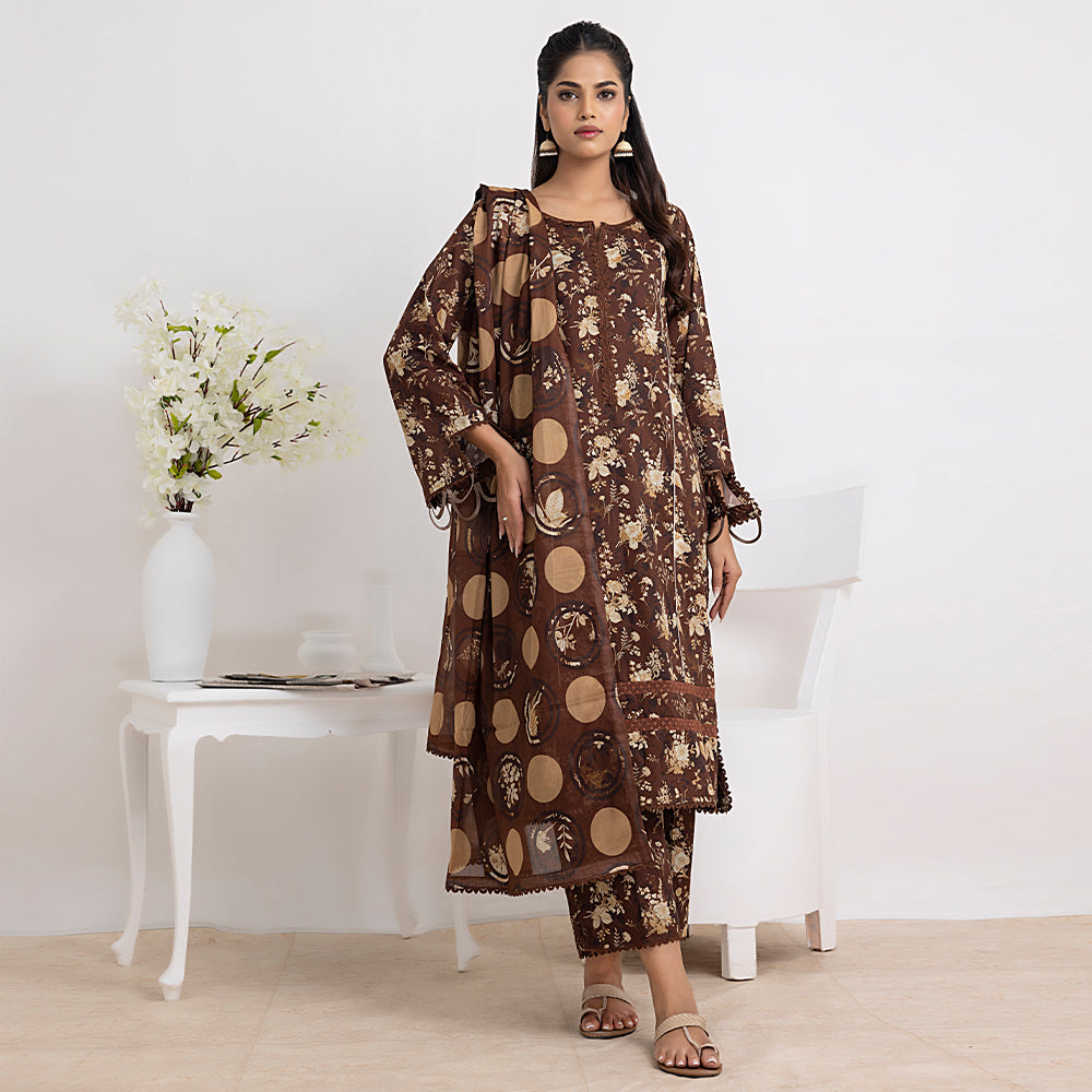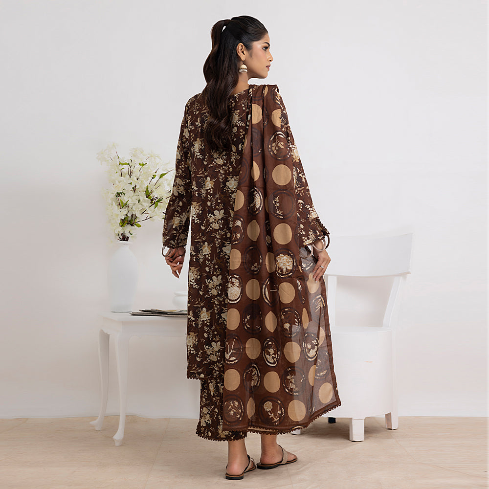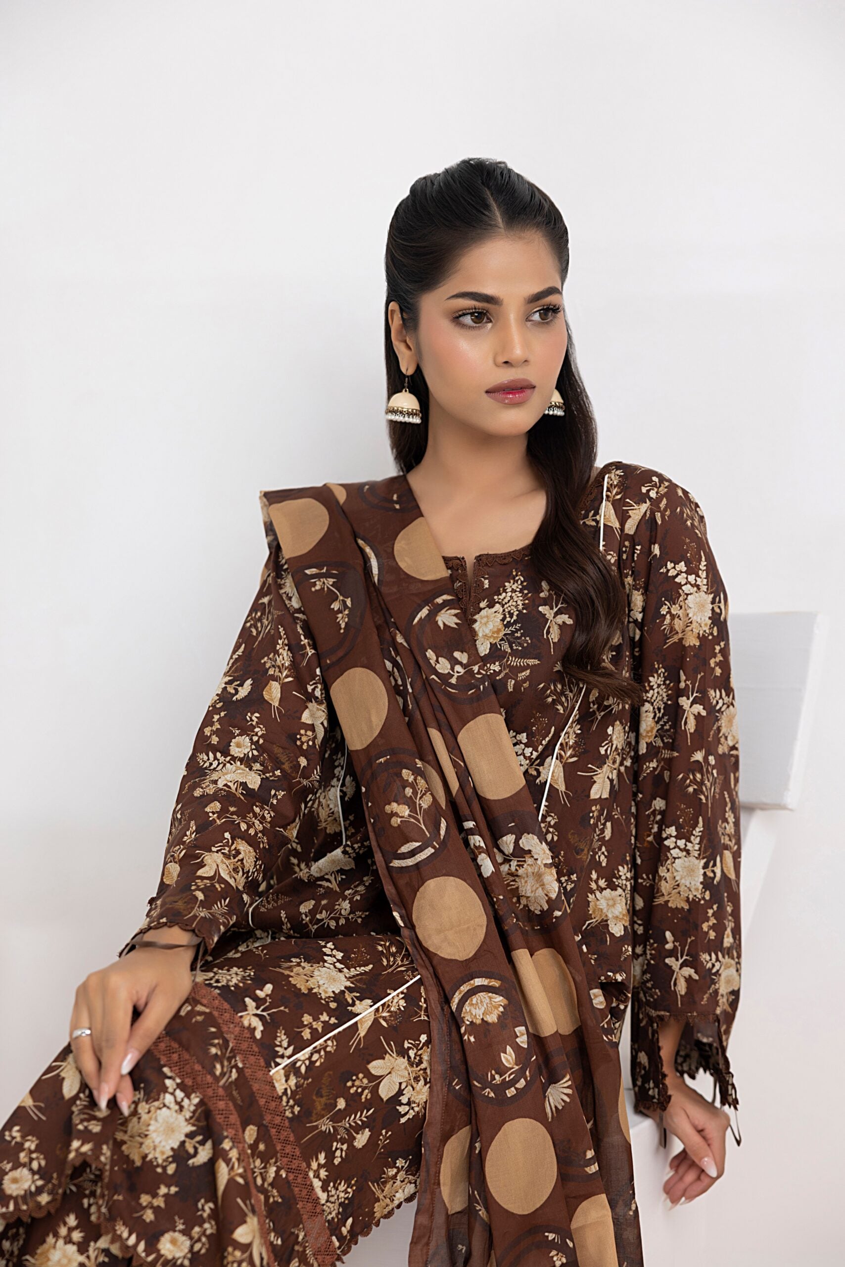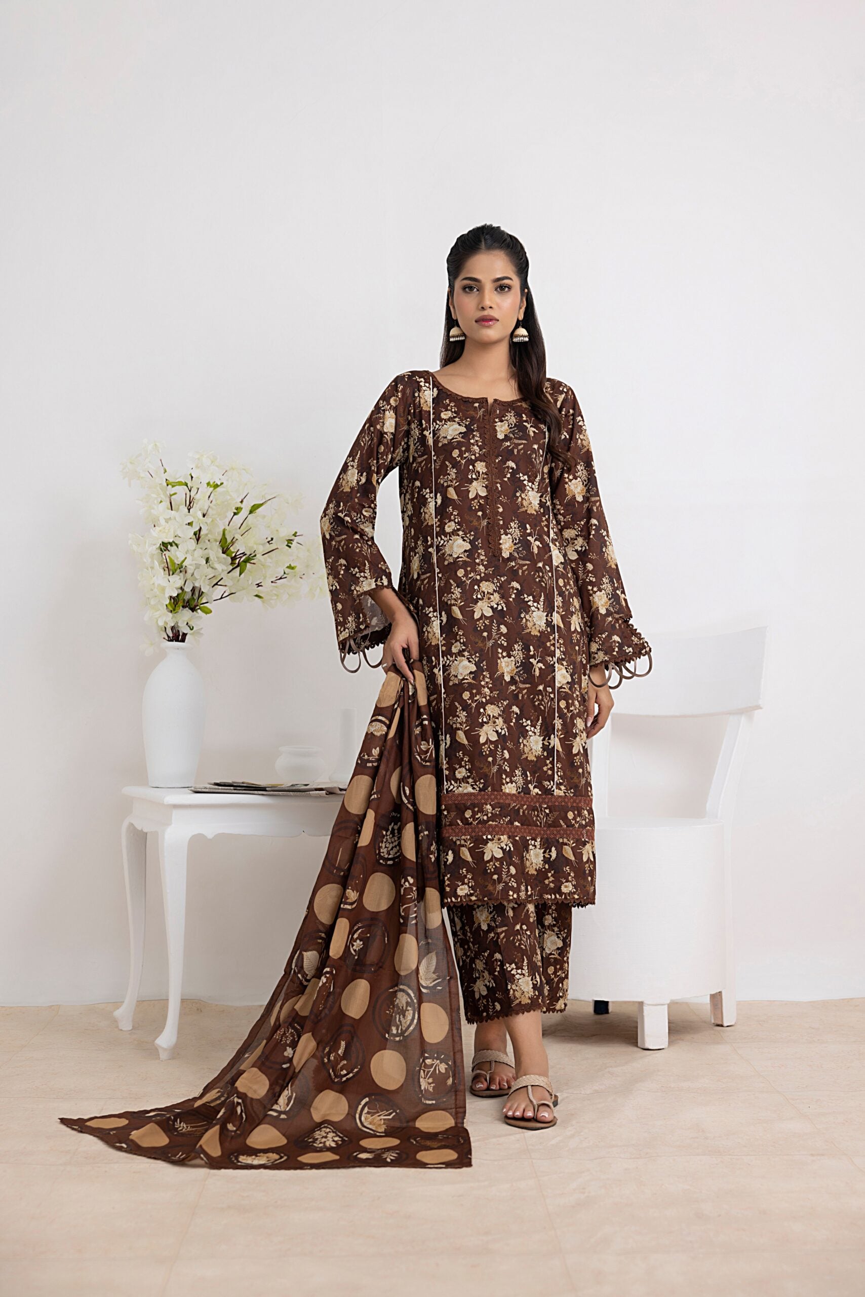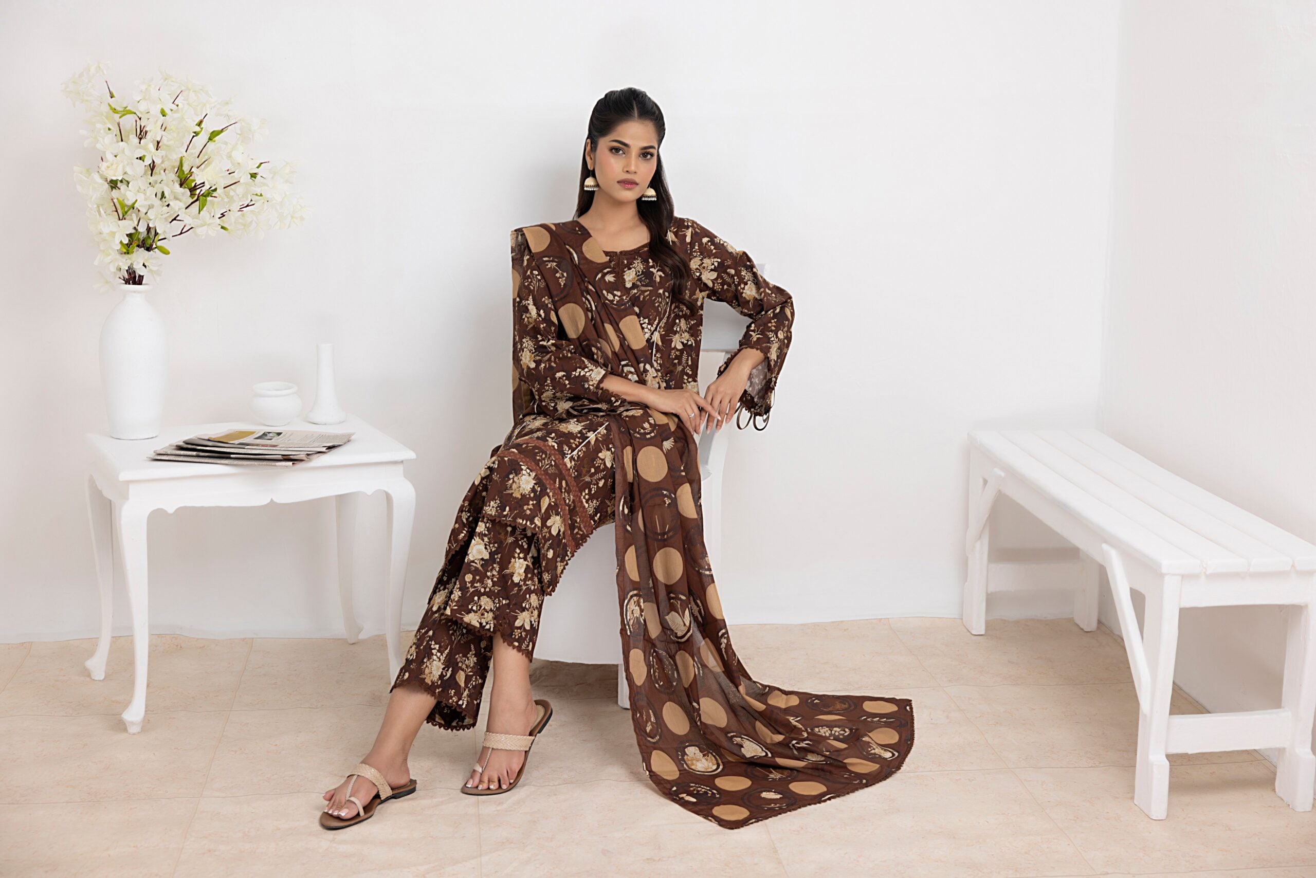 Summary: The Identic Separates Mid Summer Lawn Suit (IDSMS3-2) by Regalia Textiles offers a chic and comfortable take on daily wear. Crafted from soft, breathable printed cotton, the main garment showcases a sophisticated brown hue. This unstitched suit allows for a customizable fit and comes complete with coordinating bottom and dupatta fabrics. The mid-summer lawn fabric makes it an ideal choice for warmer weather, offering effortless style and breathability. Its versatile design makes it suitable for casual outings, errands, or relaxed gatherings. Perfect for those seeking a blend of fashion and comfort, this Pakistani suit embodies the essence of simple elegance for everyday wear during the spring/summer season. The unstitched format allows you to tailor the fit and style to your individual preferences, offering a truly personalized garment. Embrace the ease and elegance of this suit, designed for those who appreciate comfortable chic. This beautiful brown Pakistani suit is a must-have for your summer wardrobe.
