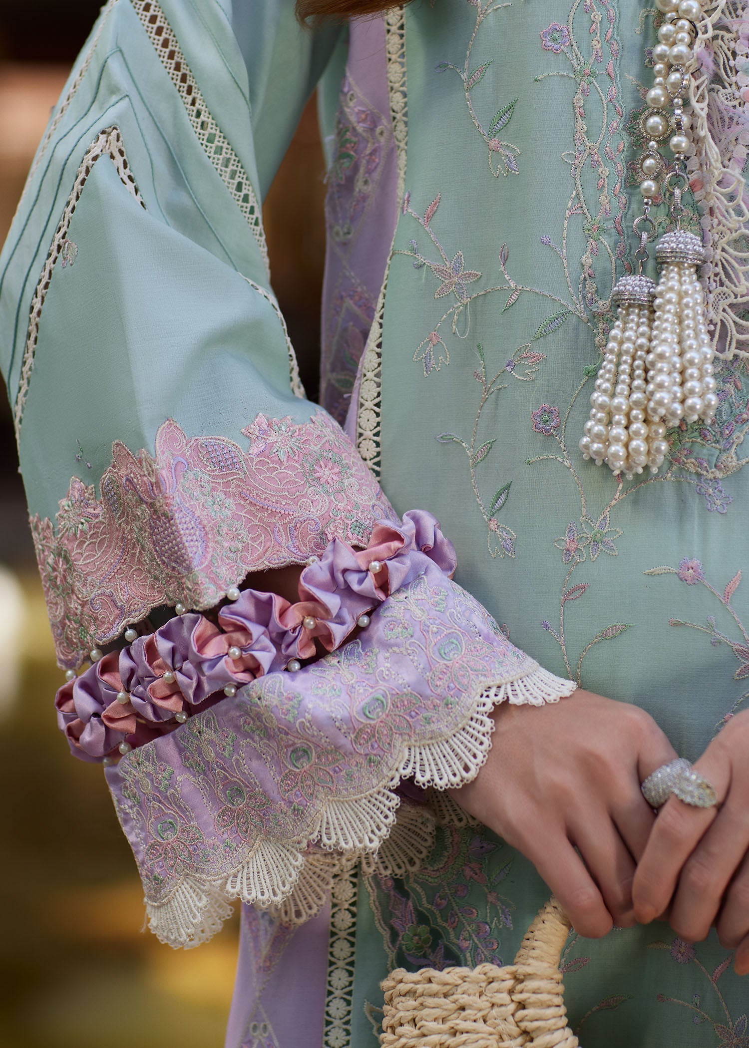 Fabric: Indulge in the pinnacle of our luxury lawn series with this breathtaking mint and lilac ensemble. The shirt is a masterclass in artisanal detail, featuring delicate floral embroidery across the front and elaborate lace-trimmed sleeves that add a touch of romantic structure. It is paired with a cotton net embroidered dupatta, exuding understated luxury with its intricate patterns and airy drape. Complete with matching cambric trousers, this outfit combines subtle complexity and modern elegance for a truly regal look. Details of Fabric: