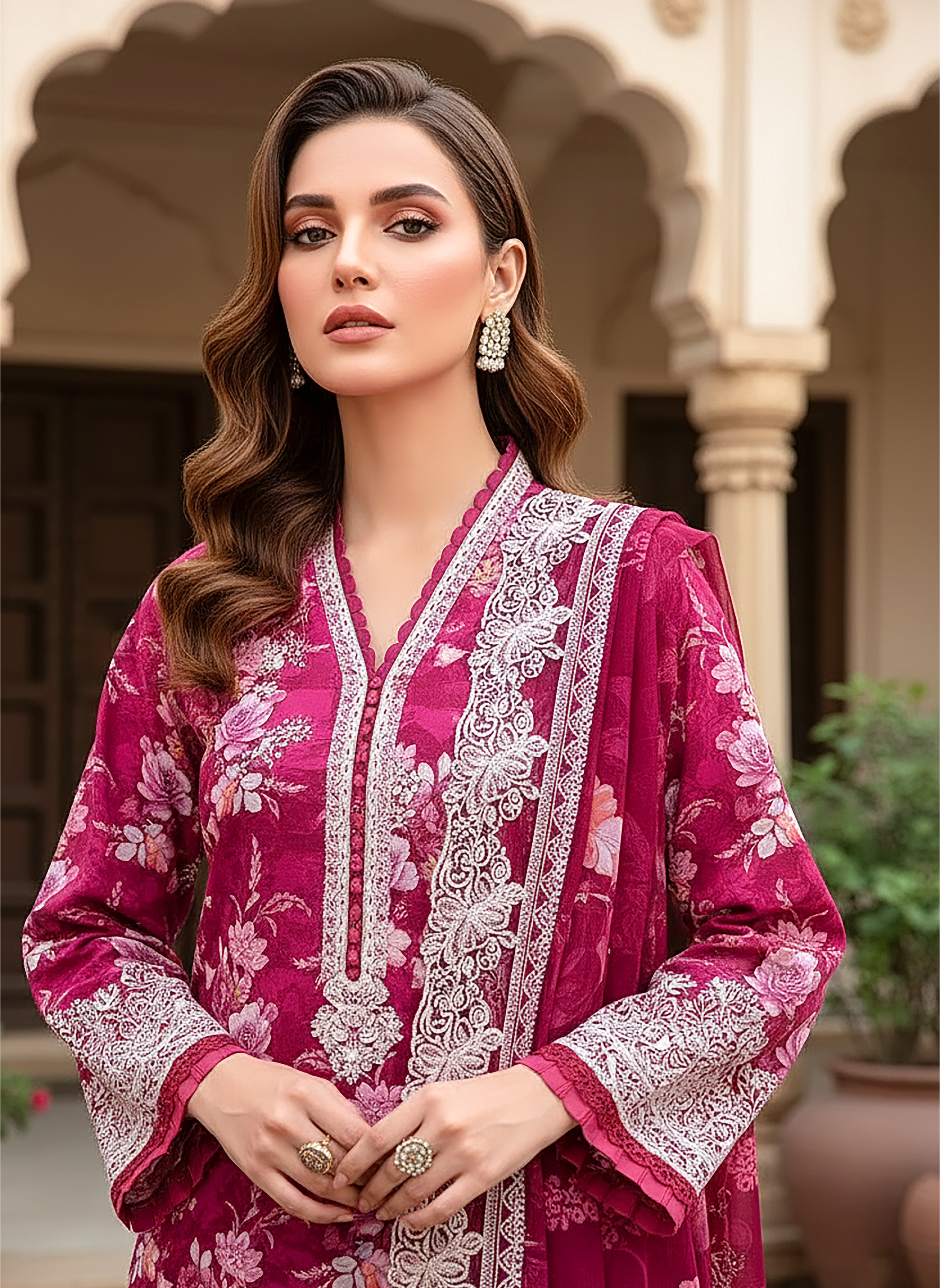 Summary: Embrace the vibrancy of the season with this stunning Burnt Pink Pakistani Lawn Suit by Lakhany. Designed for the modern woman, this unstitched ensemble features a premium Lawn kameez adorned with delicate floral prints and sophisticated embroidery, offering breathable comfort for Spring/Summer. The rich pink hue adds a festive touch, making it an ideal choice for Eid gatherings or casual summer parties. Paired with an exquisite embroidered cutwork dupatta, this outfit perfectly balances traditional charm with contemporary elegance. Shop this authentic Pakistani dress online to elevate your ethnic collection with timeless style.